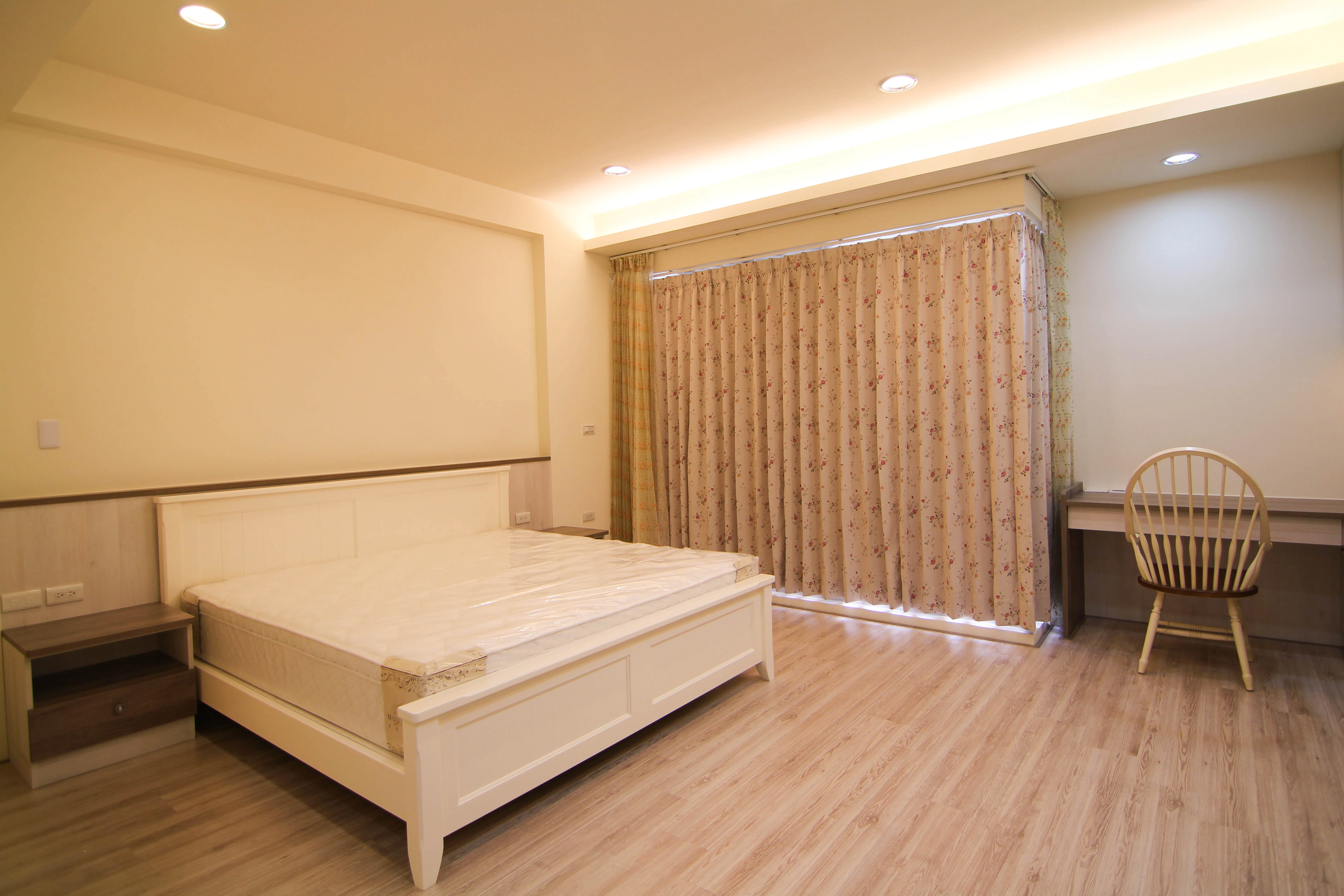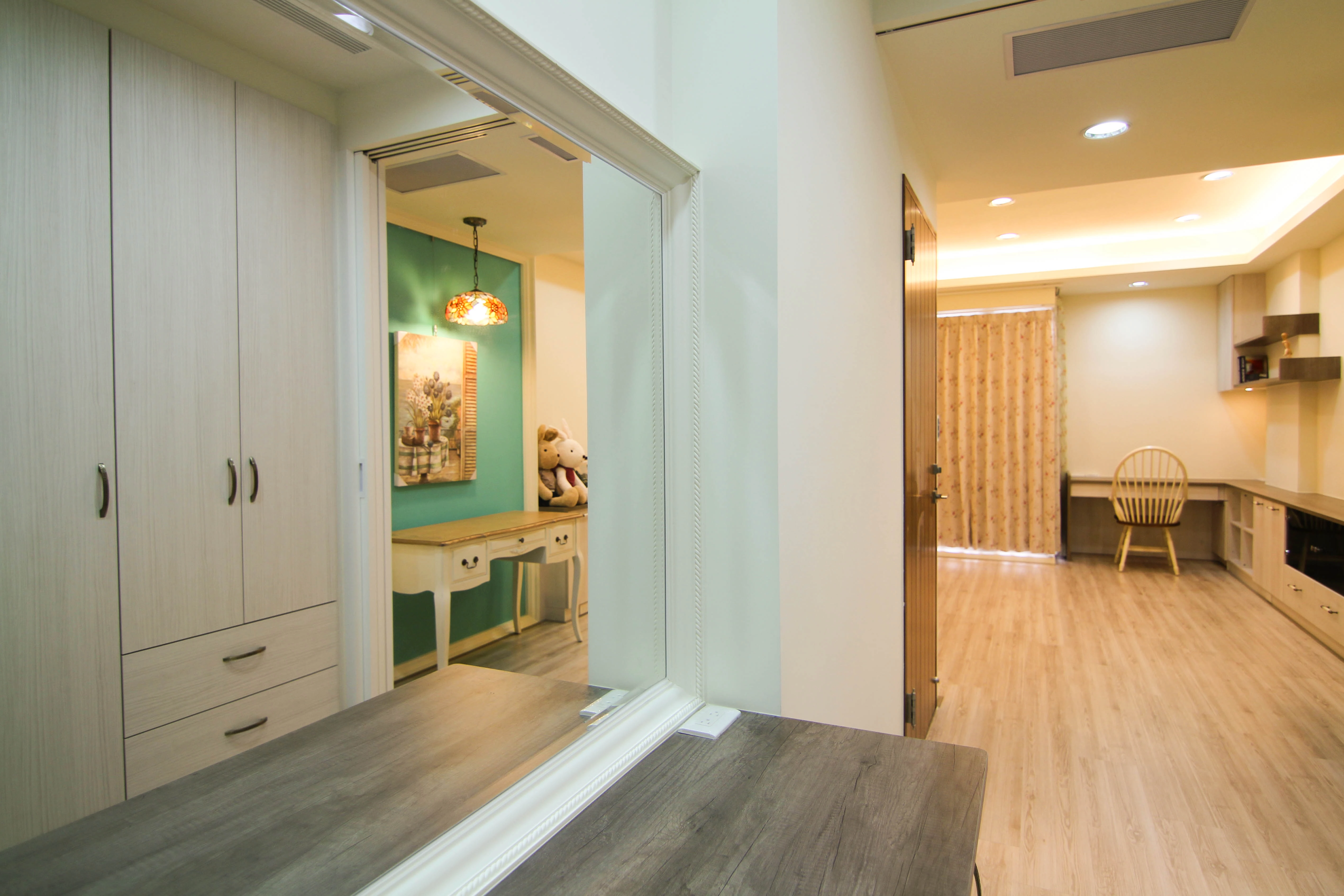 公領域規劃了實用吧台,成為家人輕食交流的核心;私領域則發揮系統家具的靈活性,將主臥書桌與收納機能完美整合。更衣室內部配置整套淺木紋衣櫃與化妝桌,不僅將生活備品收納於無形,更維持了視覺的一致與清爽,讓空間使用起來更加井然有序且順手。