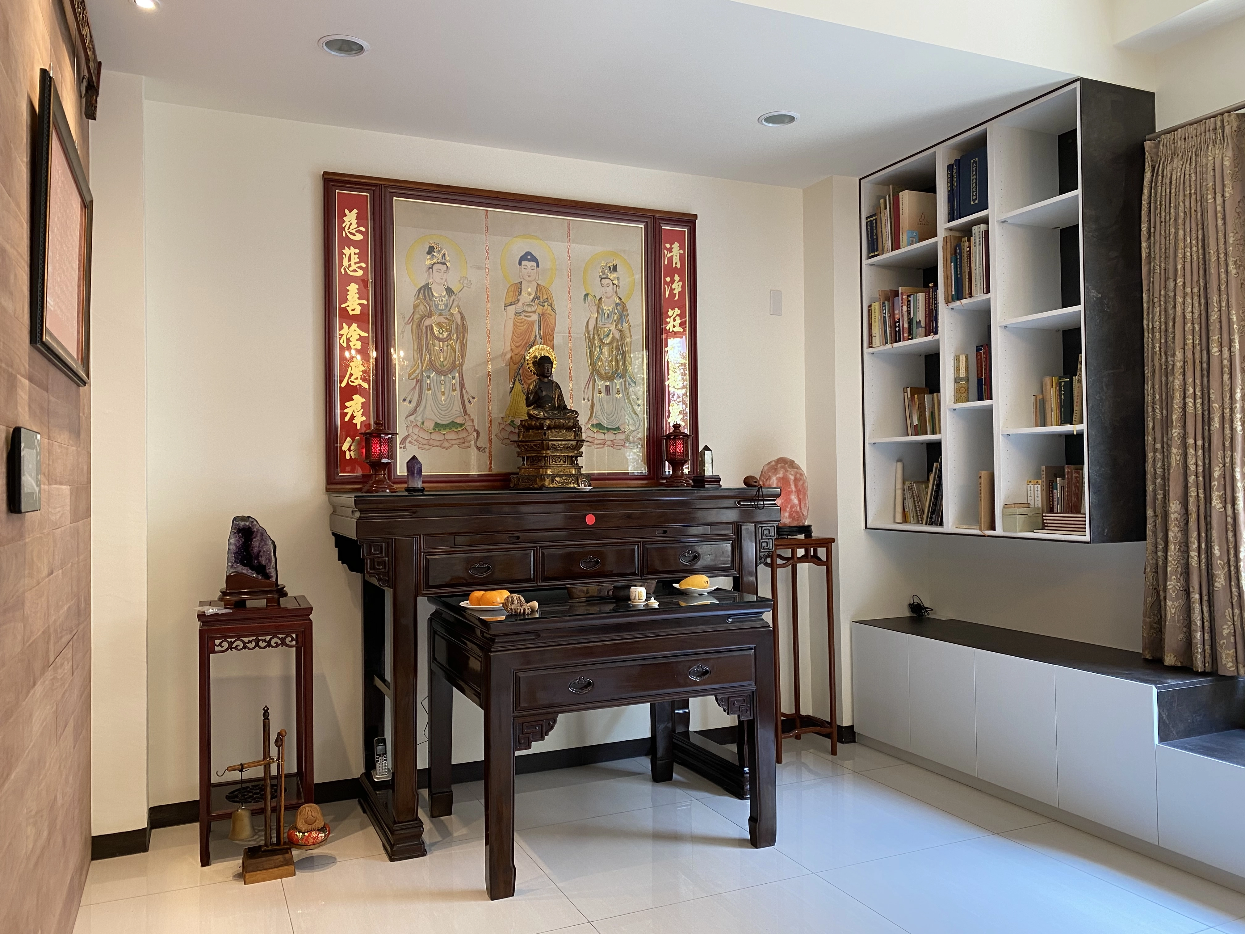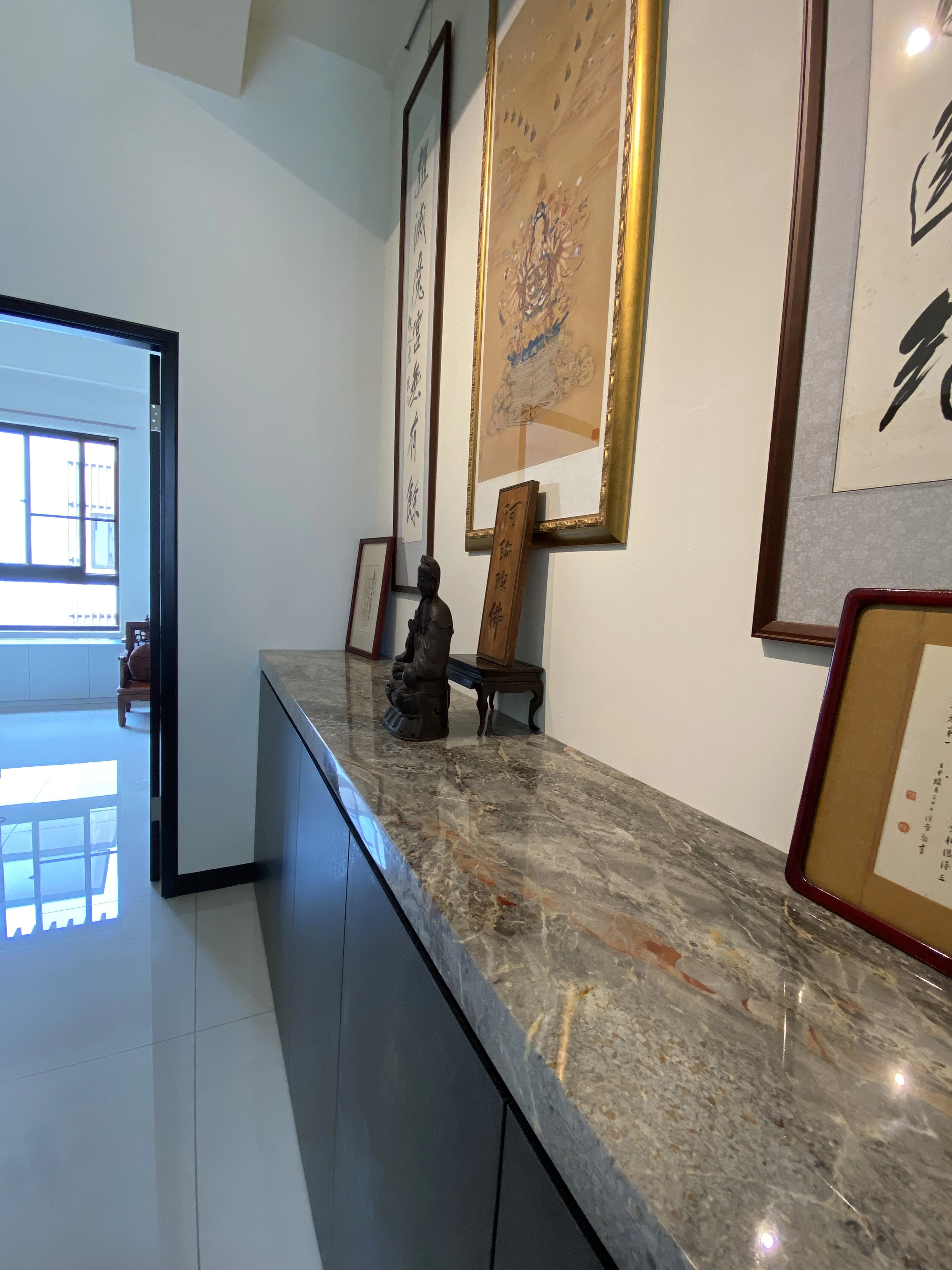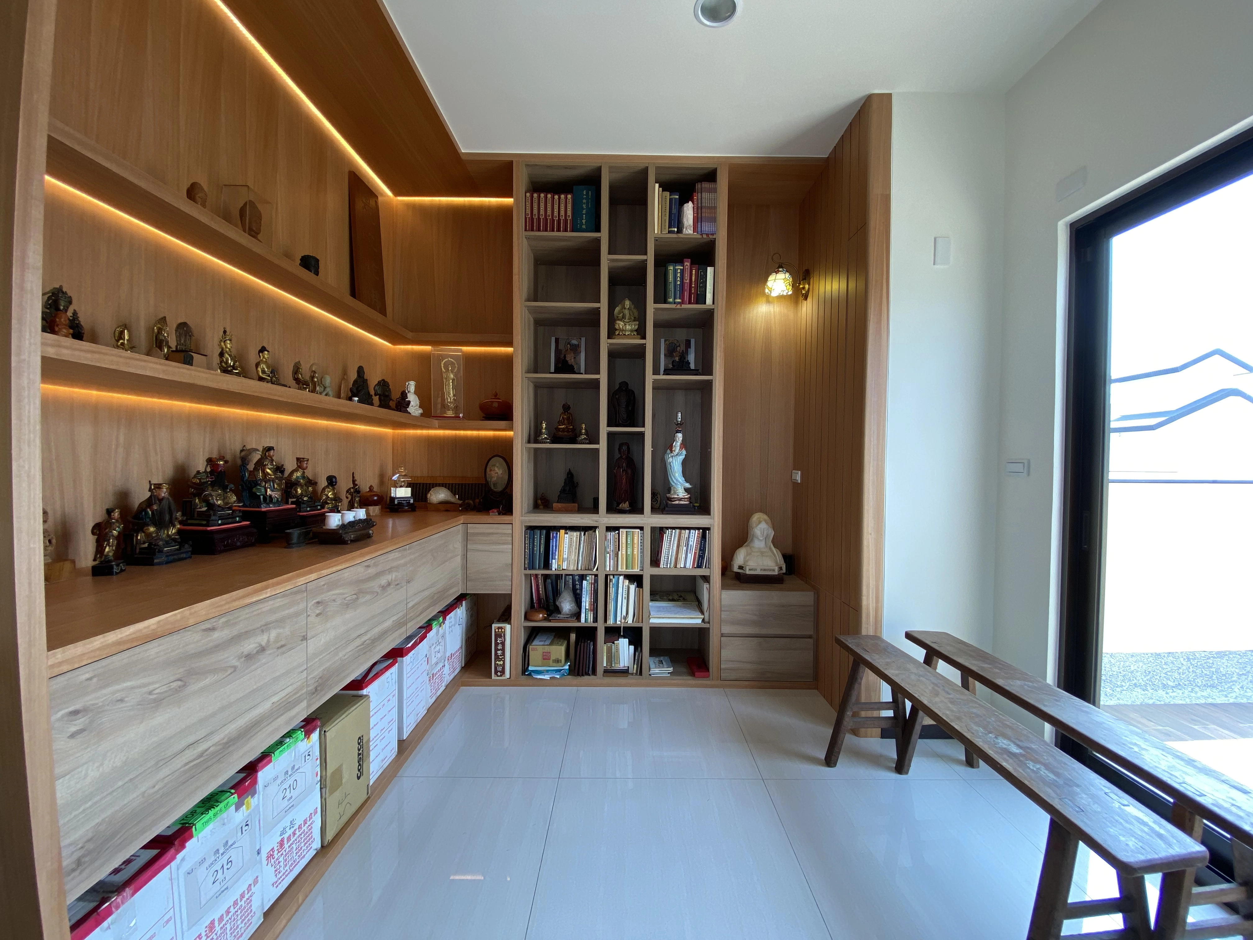 在私領域與佛堂空間,我們延續了這份沉穩。透過客製化系統傢俱,將實木長桌、神明廳收納與臥室機能化繁為簡,維持視覺的井然有序。而開放式餐廚區則巧妙帶入美術吊燈點綴,在傳統的溫潤中揉合現代奢華感,讓每一個轉角都能感受到中式風格特有的寧靜與舒適。