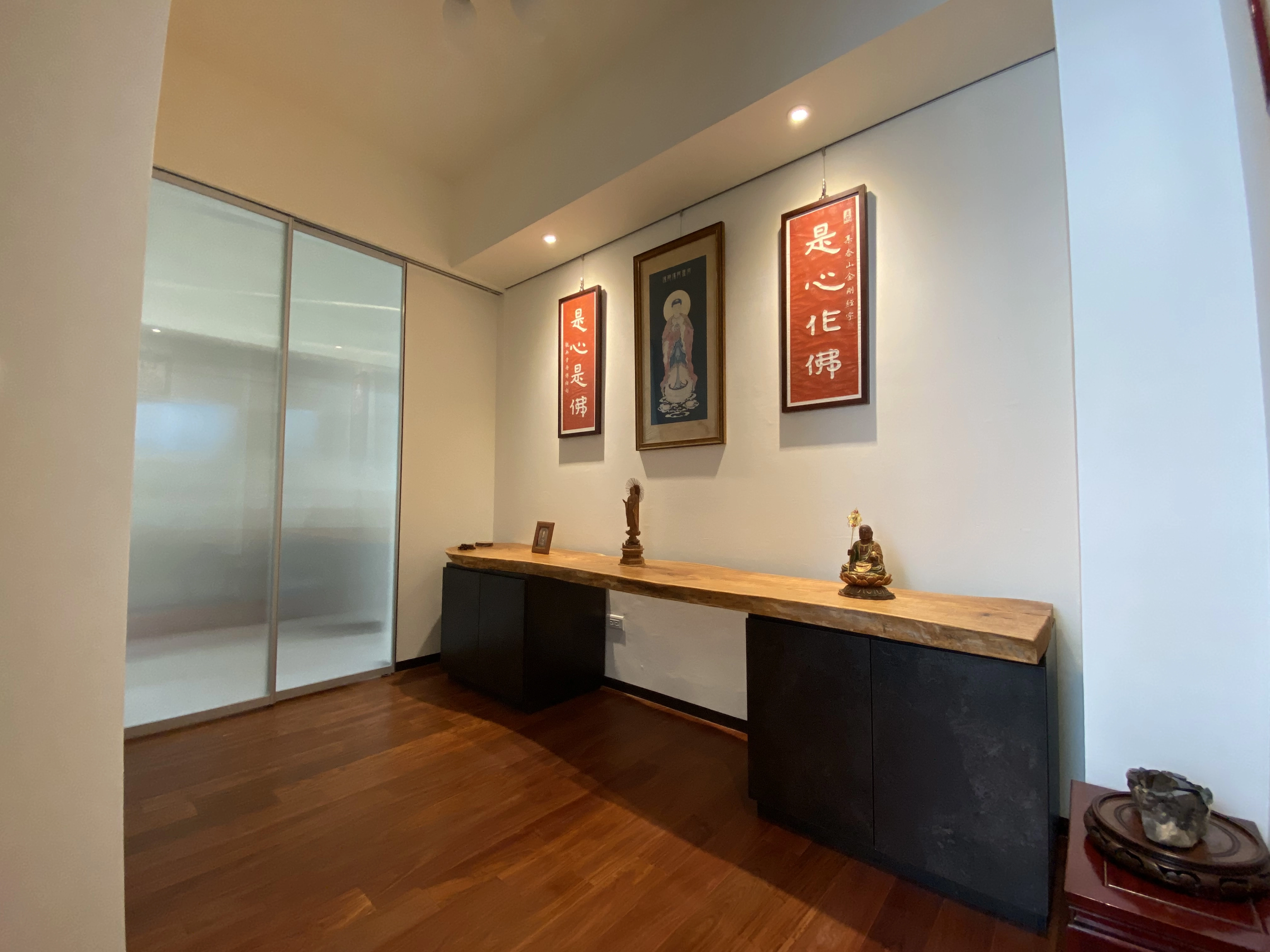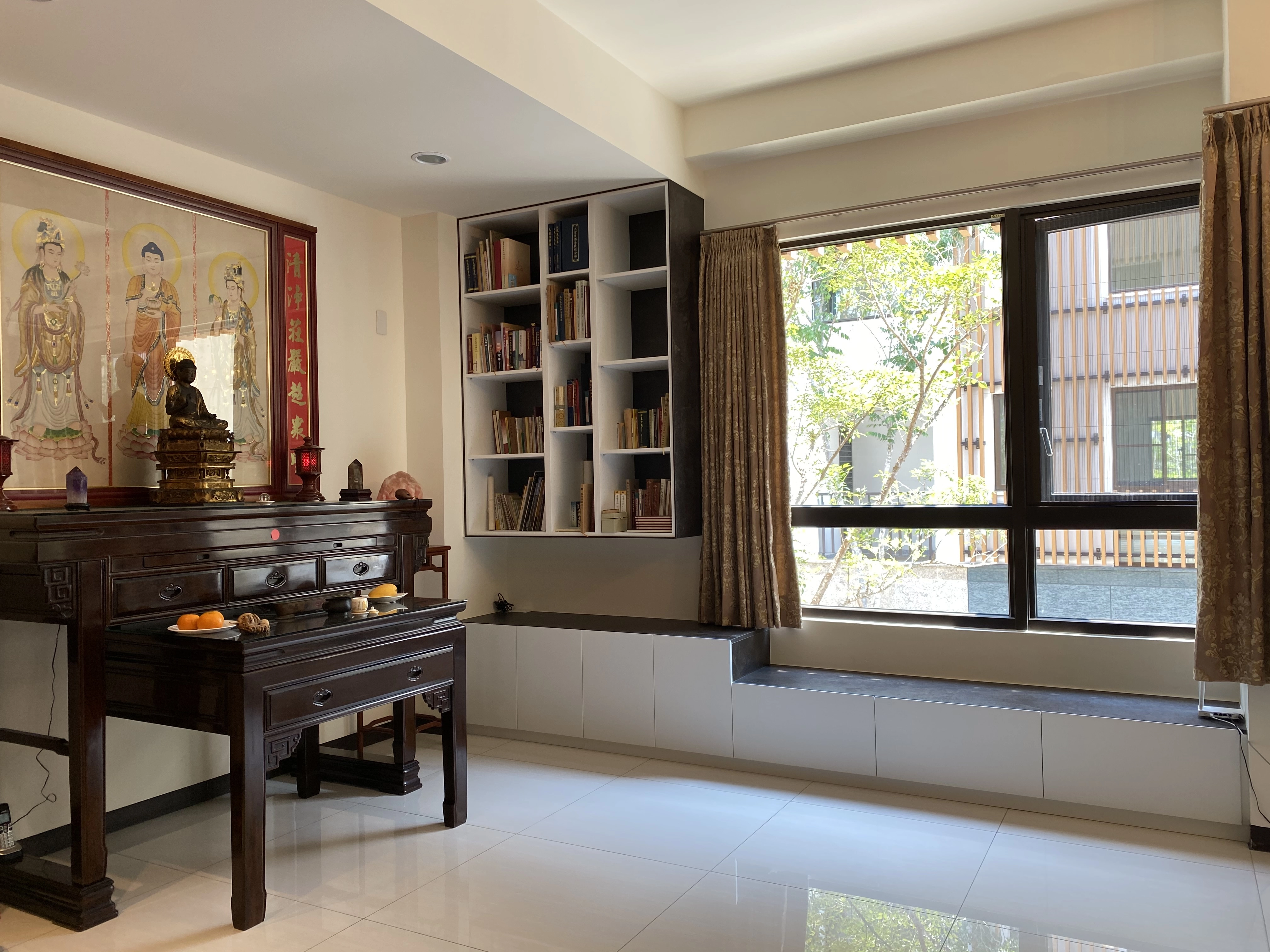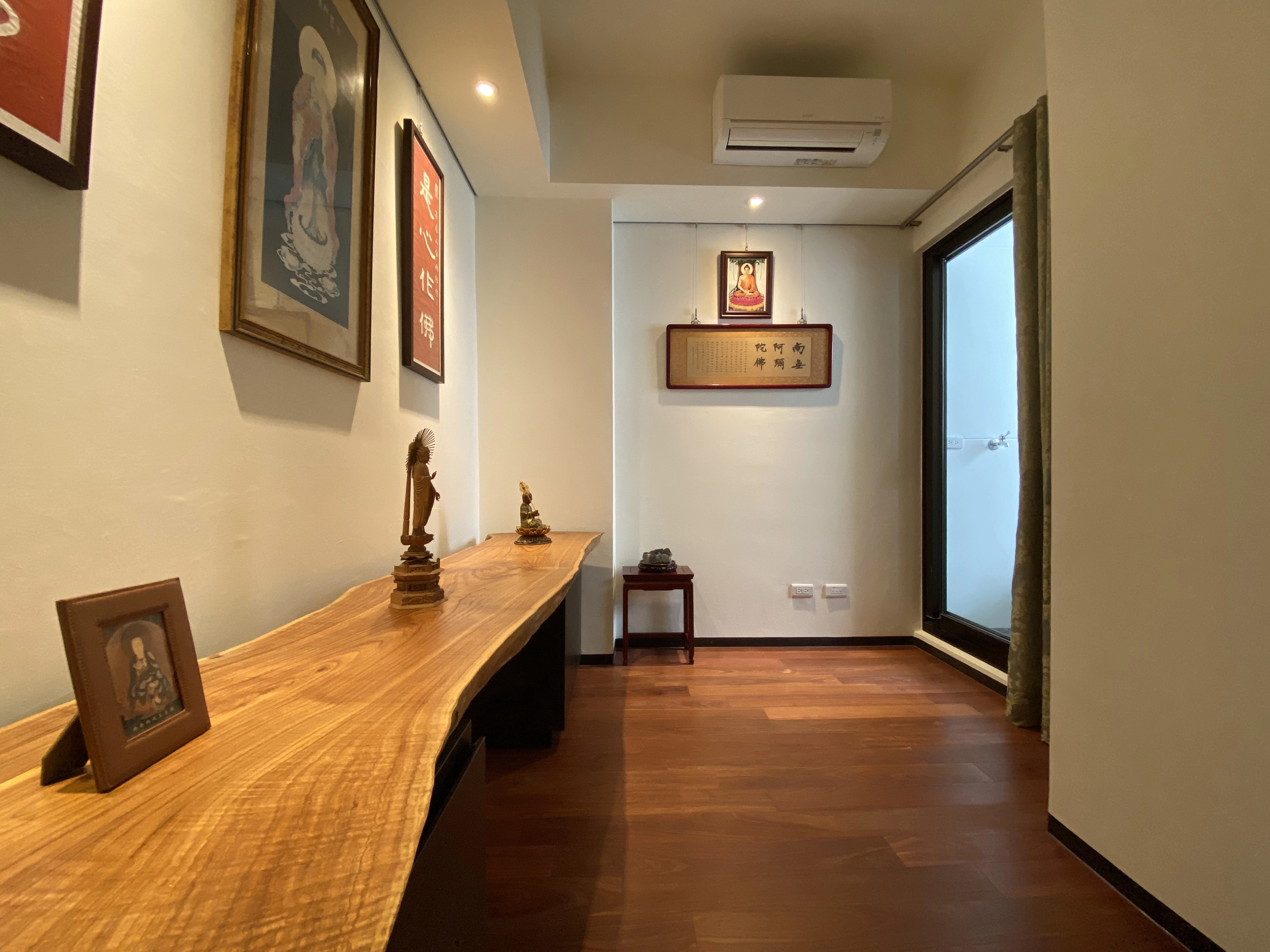 在私領域與佛堂空間,我們延續了這份沉穩。透過客製化系統傢俱,將實木長桌、神明廳收納與臥室機能化繁為簡,維持視覺的井然有序。而開放式餐廚區則巧妙帶入美術吊燈點綴,在傳統的溫潤中揉合現代奢華感,讓每一個轉角都能感受到中式風格特有的寧靜與舒適。