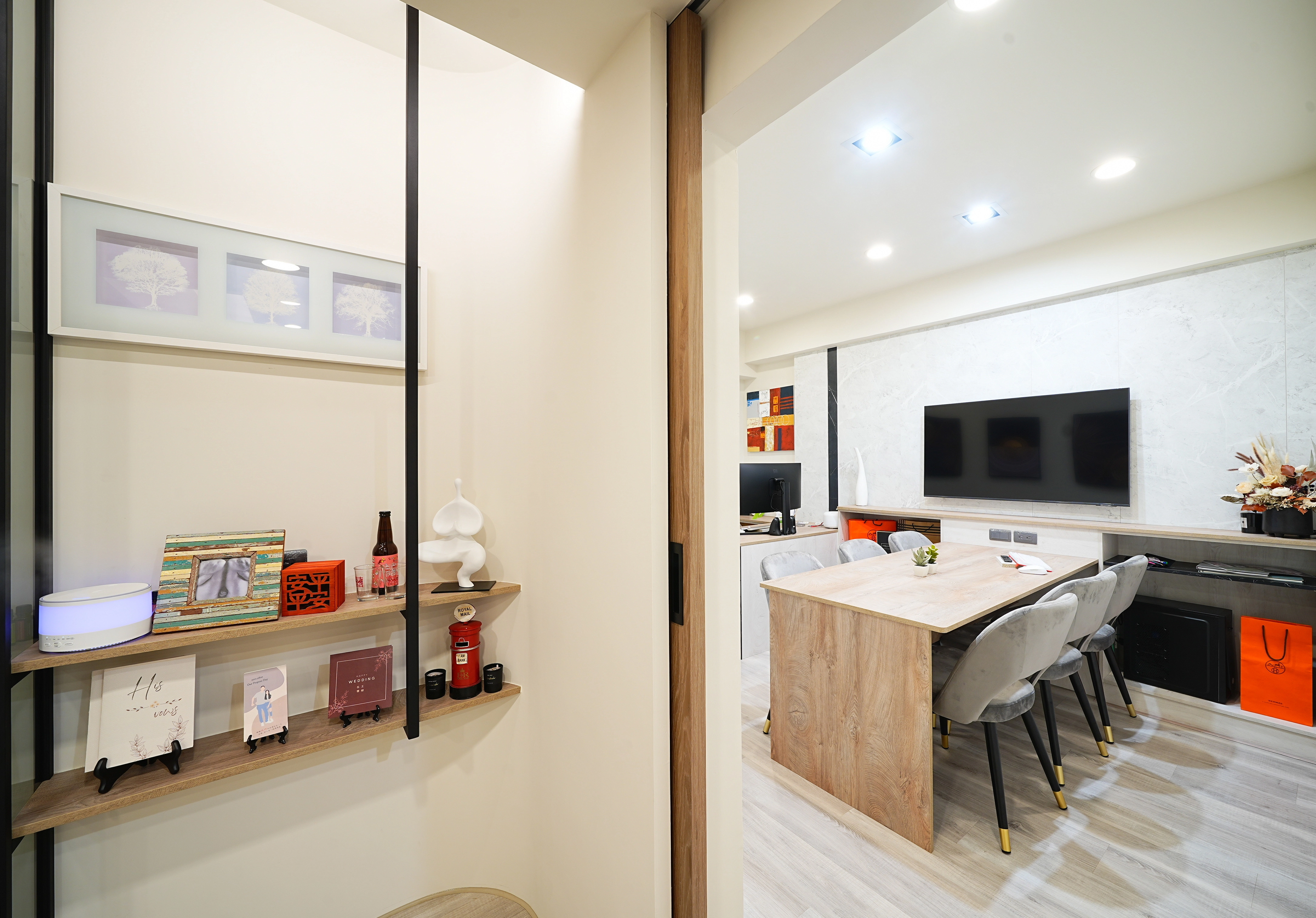 客廳區域特別著重收納體系的整合,利用專業系統櫃技術,將單調牆面打造為多功能收納牆。高櫃結合緩衝抽屜與局部玻璃門片,讓雜物能被完美隱藏,同時降低視覺壓迫感,維持公領域的整潔序位。每一處客製化細節,如電視牆比例與櫃體深度,皆精準貼合屋主的生活慣性。