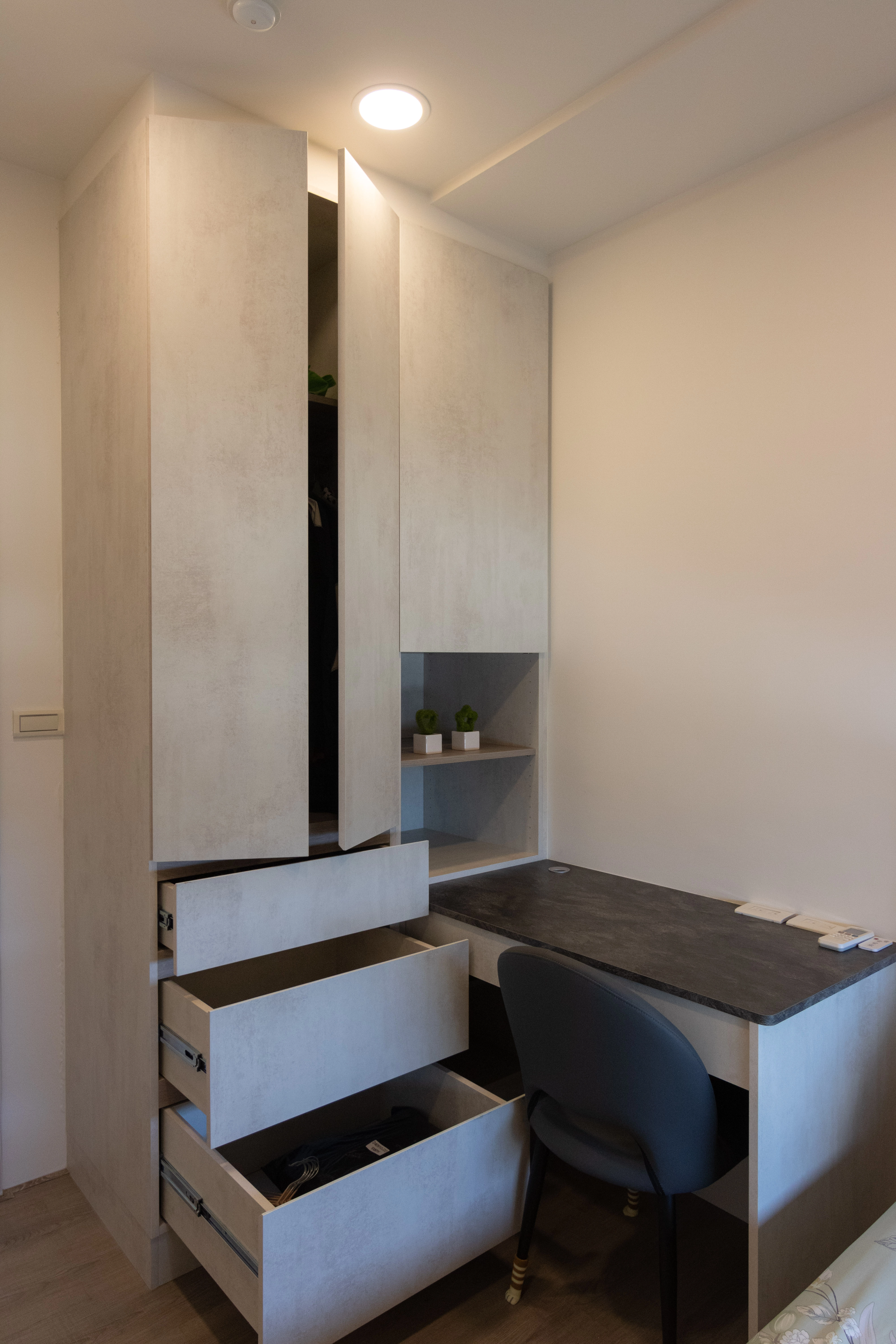 私領域則整合系統書桌與衣櫃,並細膩配置緩衝五金,大幅提升日常使用的手感。德盈堅持選用高品質台南系統家具,從板材選色到工法細節,皆旨在為屋主構築出兼具美感與實用性的美學居所,讓 18 坪小空間也能擁有從容不迫的生活質感。