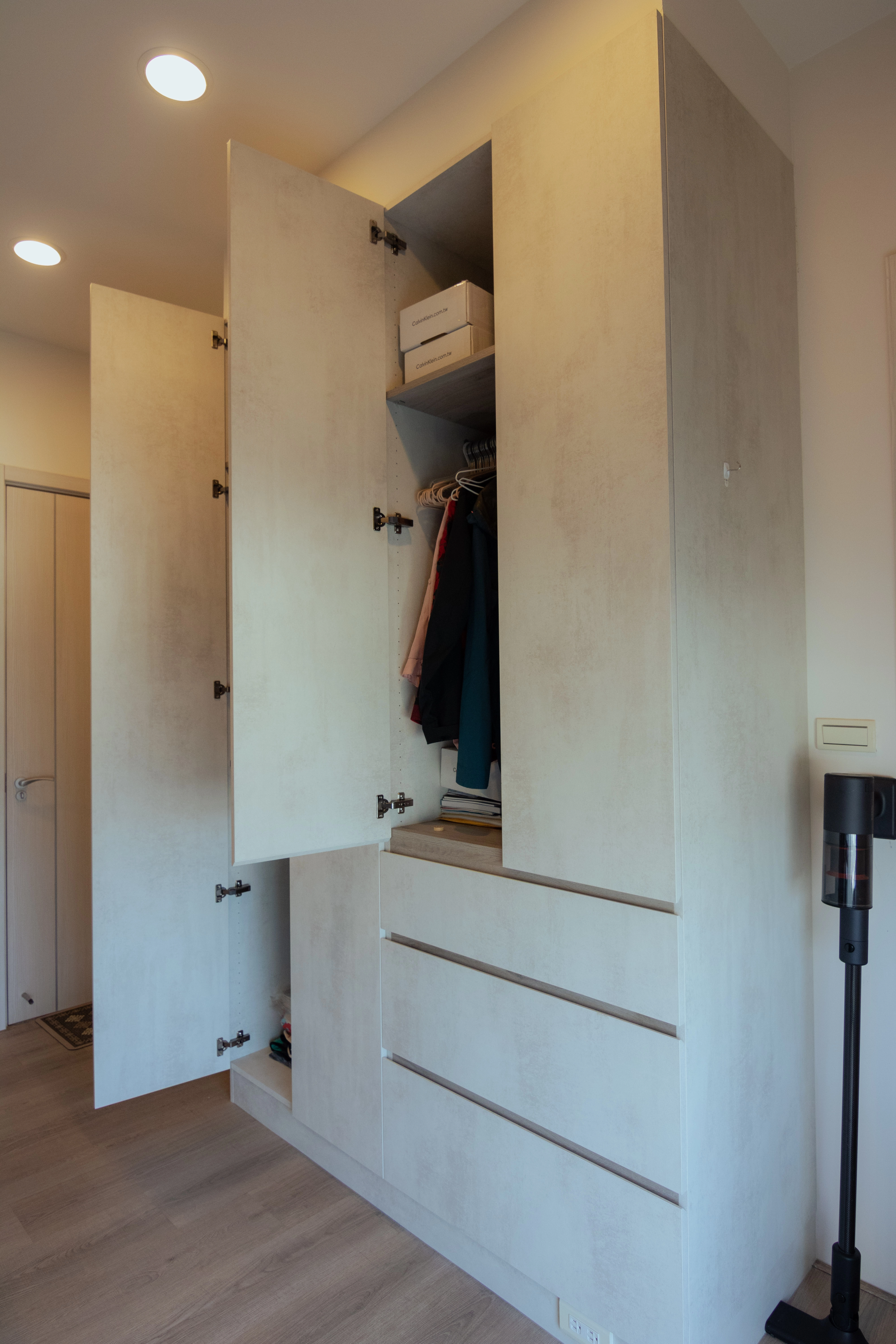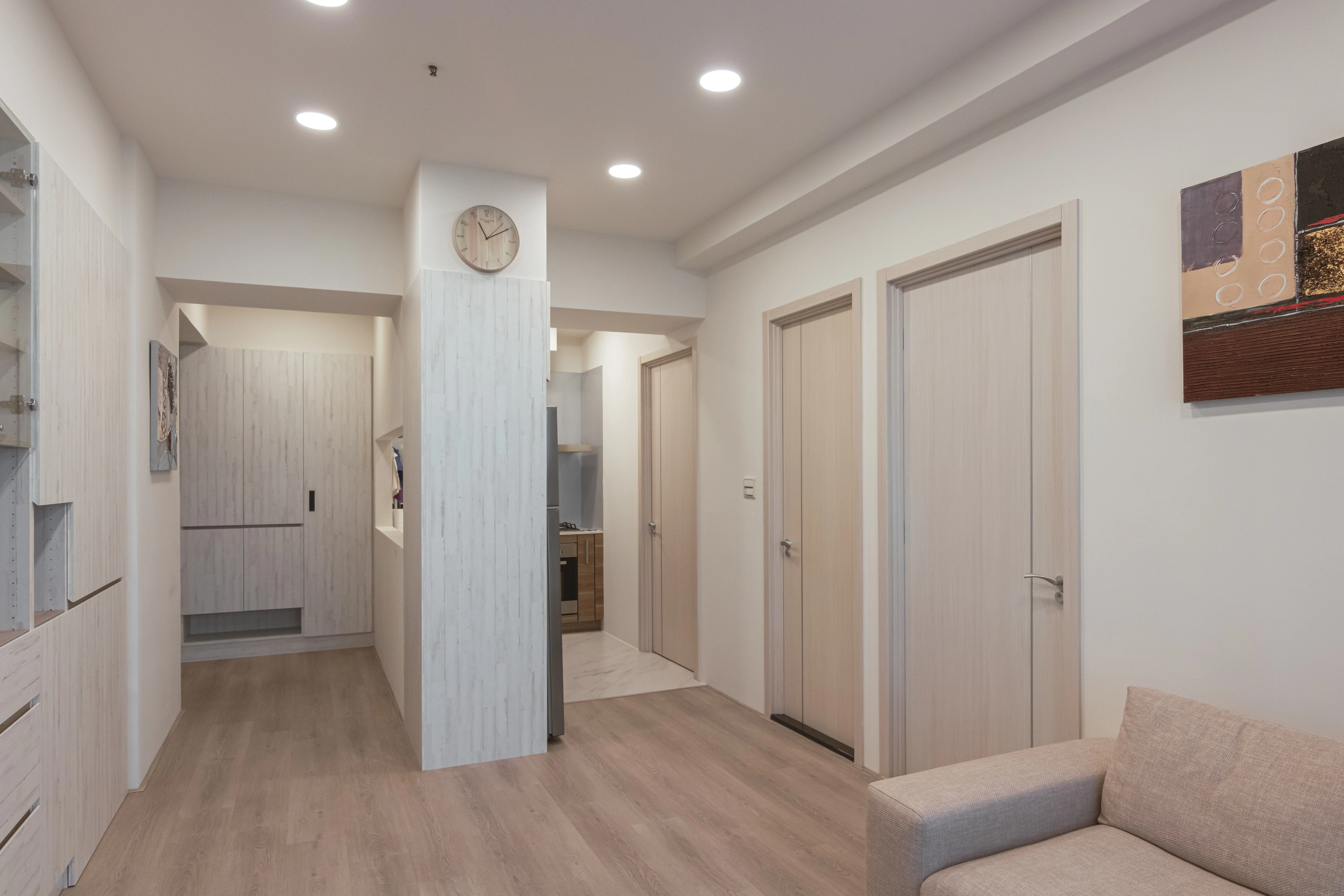 台南系統家具是德盈團隊的指標專長,本案為經典兩房配置,我們從玄關處便開始佈局,運用溫潤木作結合系統鞋櫃,型塑出明亮通透的入戶氛圍。透過精準規劃,將受限的坪數轉化為高效實用的生活場域。