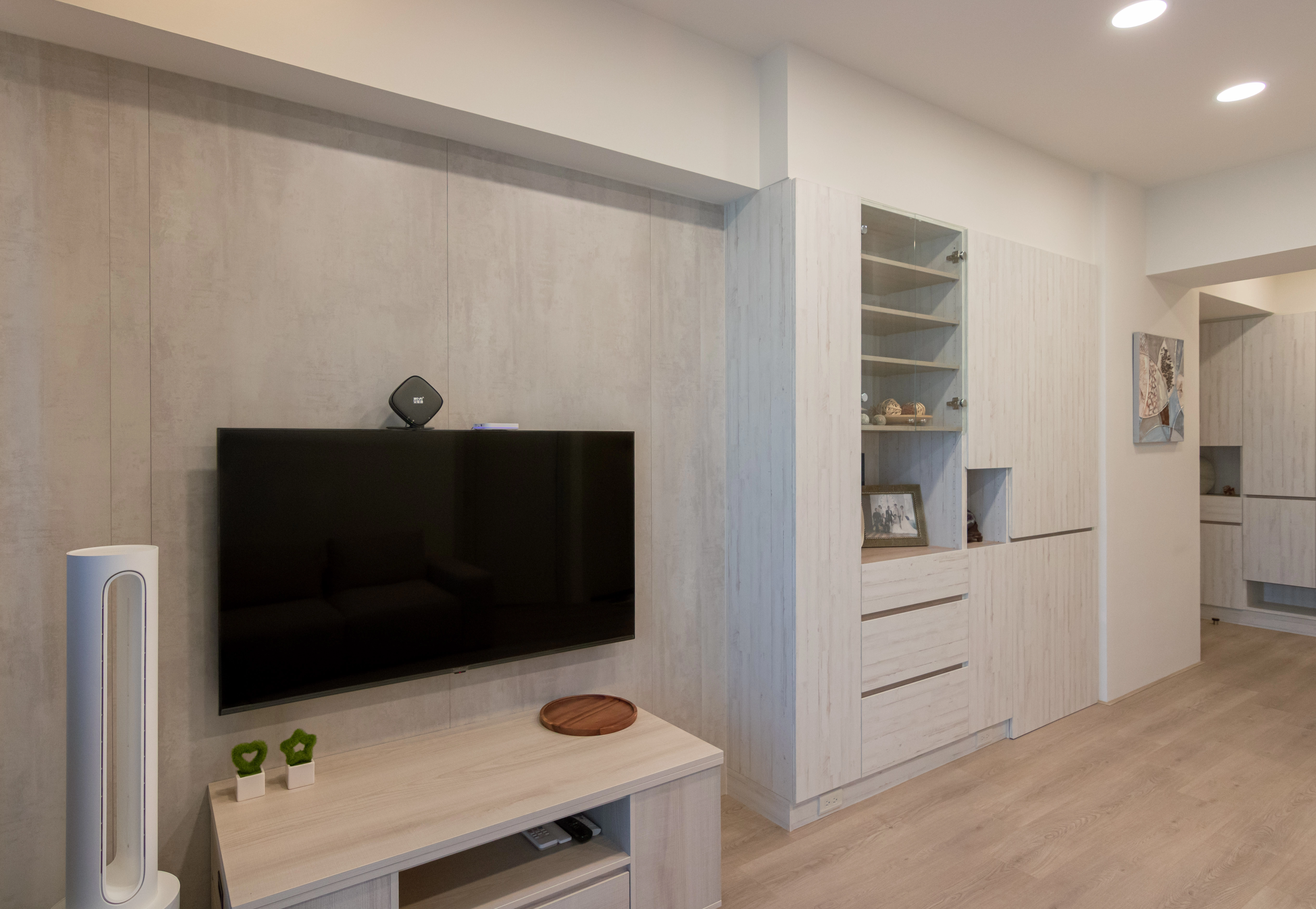 客廳區域特別著重收納體系的整合,利用專業系統櫃技術,將單調牆面打造為多功能收納牆。高櫃結合緩衝抽屜與局部玻璃門片,讓雜物能被完美隱藏,同時降低視覺壓迫感,維持公領域的整潔序位。每一處客製化細節,如電視牆比例與櫃體深度,皆精準貼合屋主的生活慣性。