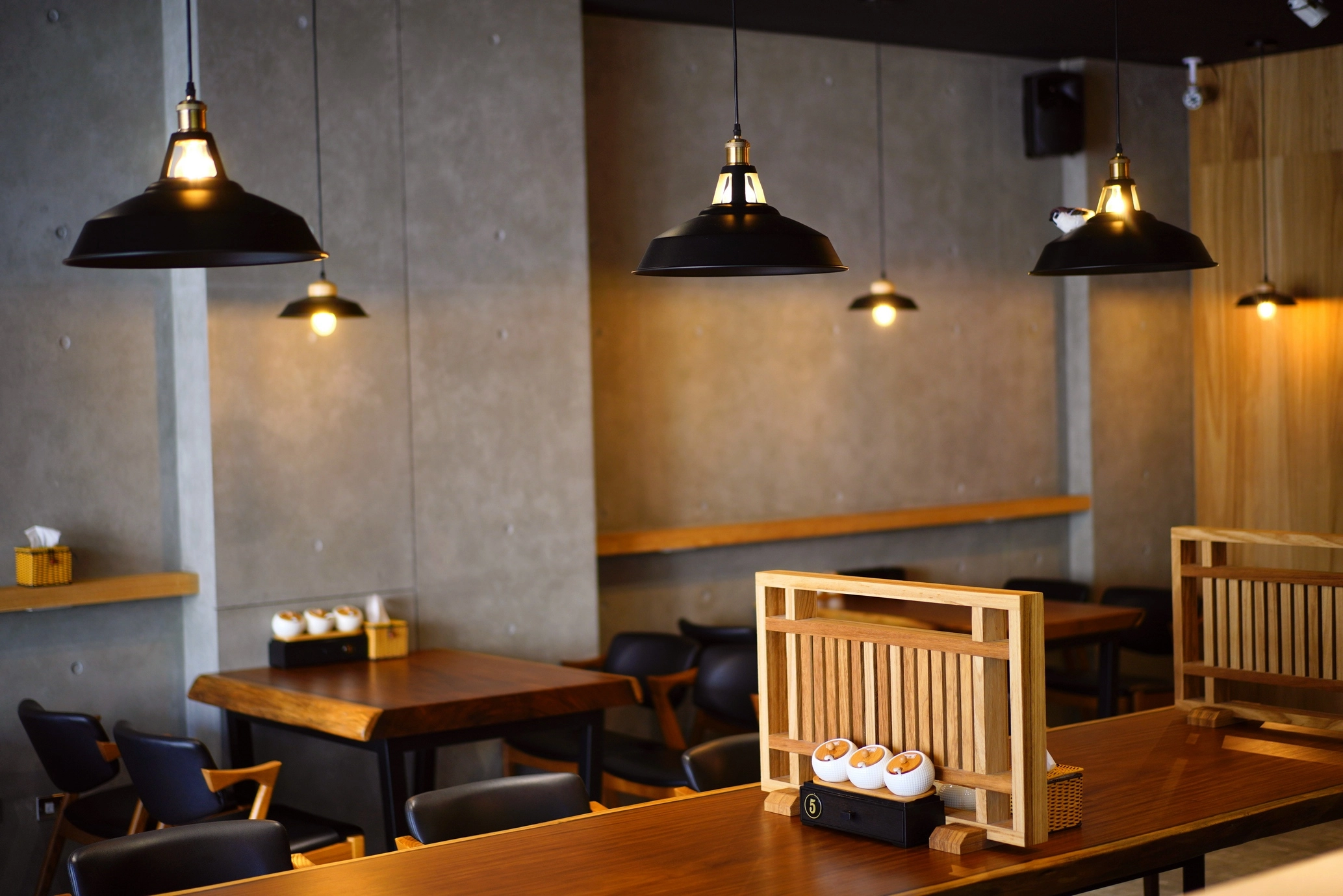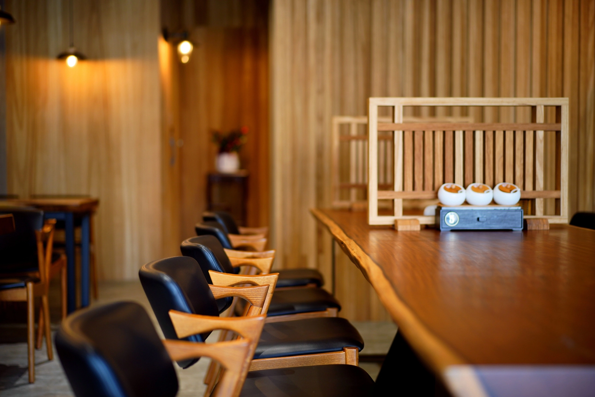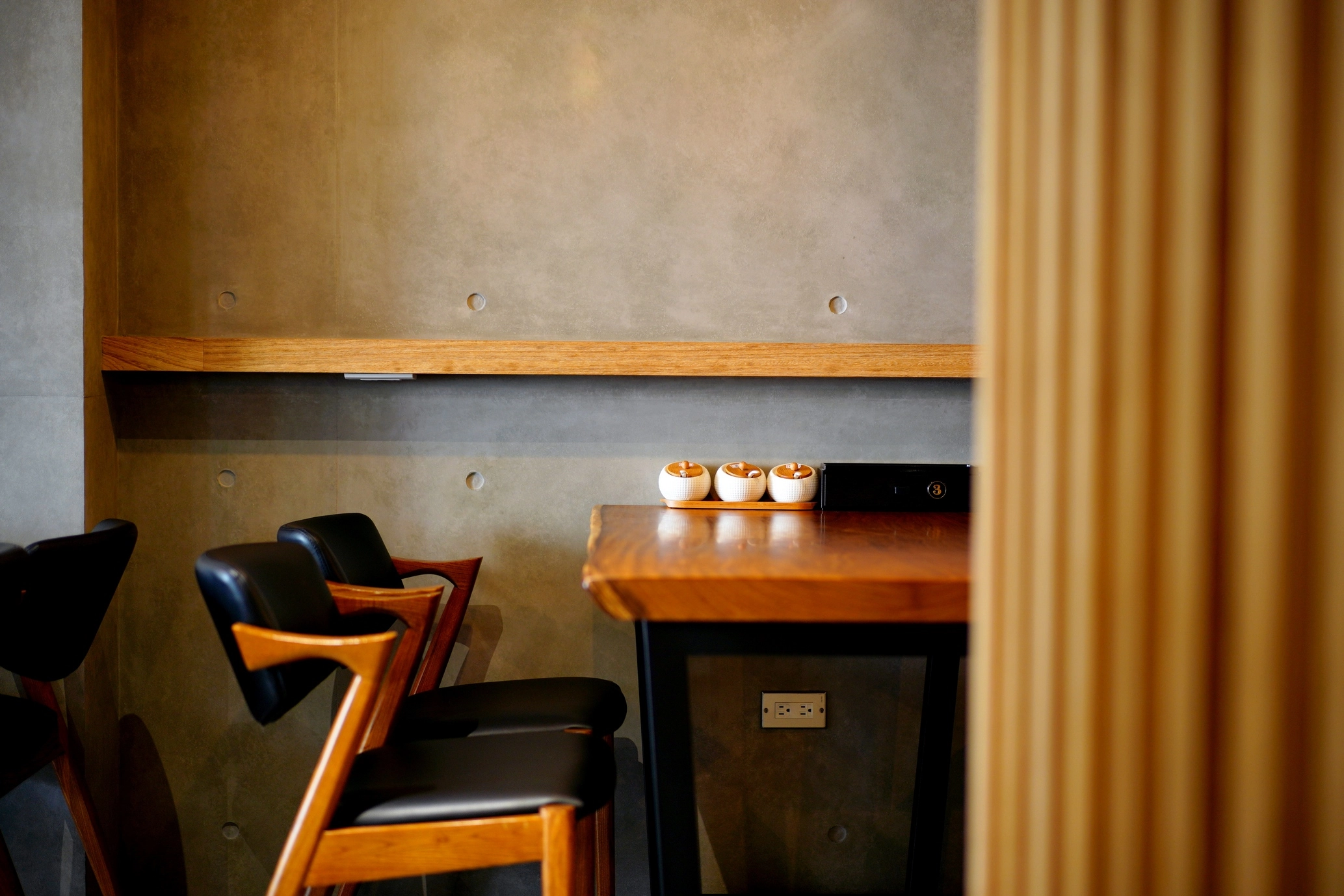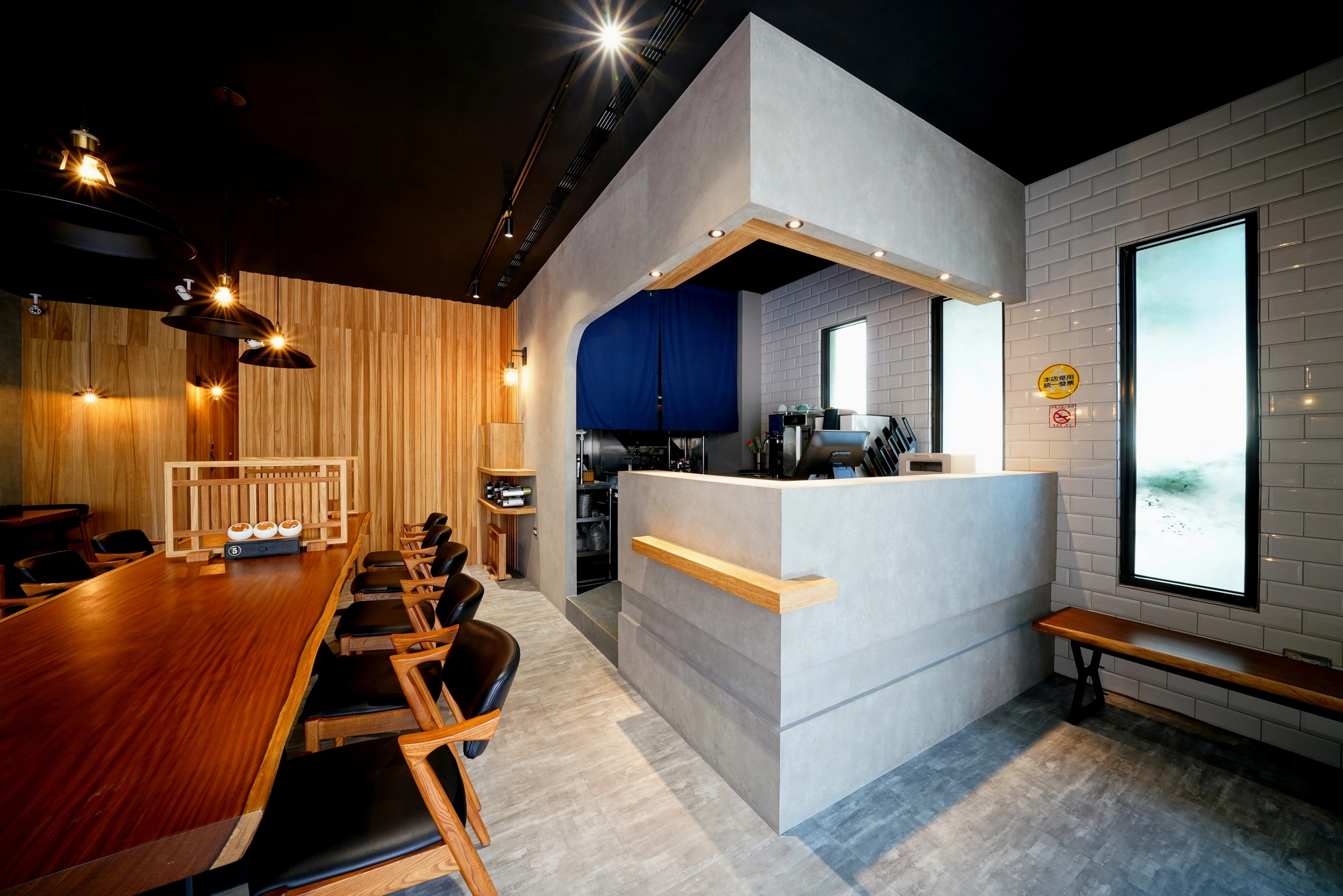 德盈為藤森丸複合式餐廳操刀設計,巧妙融合工業風的率性與日式溫潤質感。我們以水泥灰牆面與深色天花板打底,搭配細膩的木質格柵,透過冷暖色調的對比,在 19 坪的商業空間中勾勒出層次分明的獨特氛圍。
