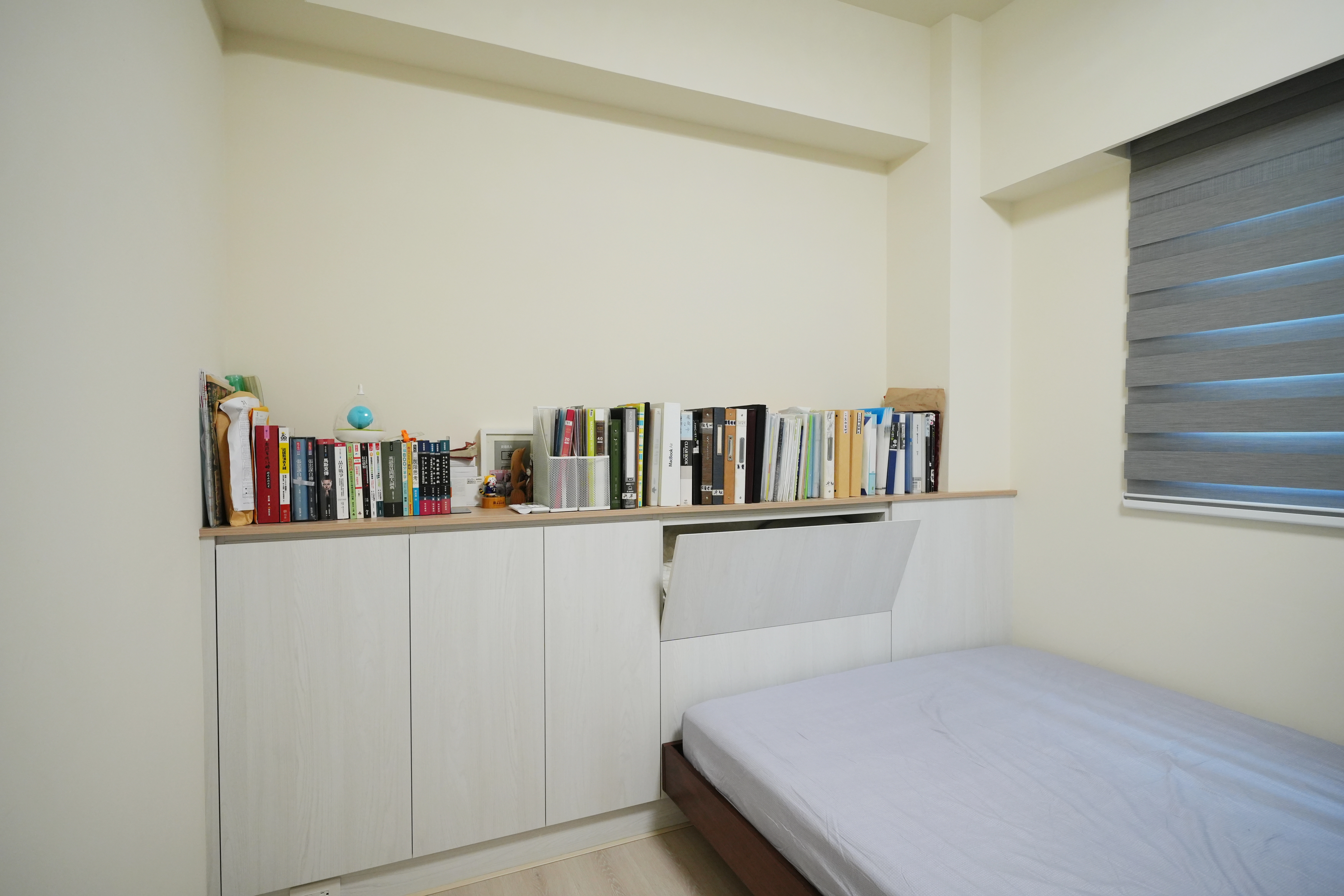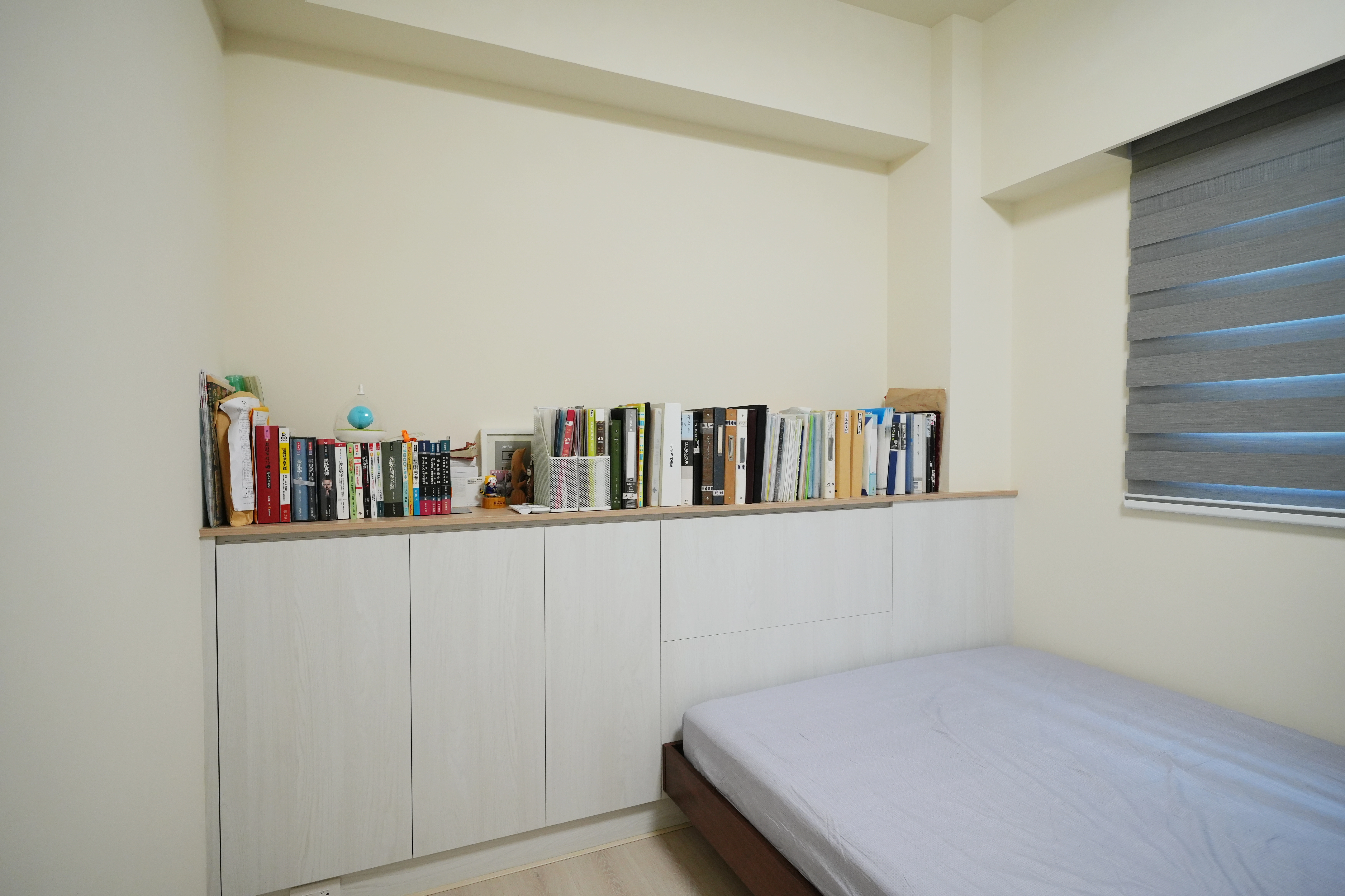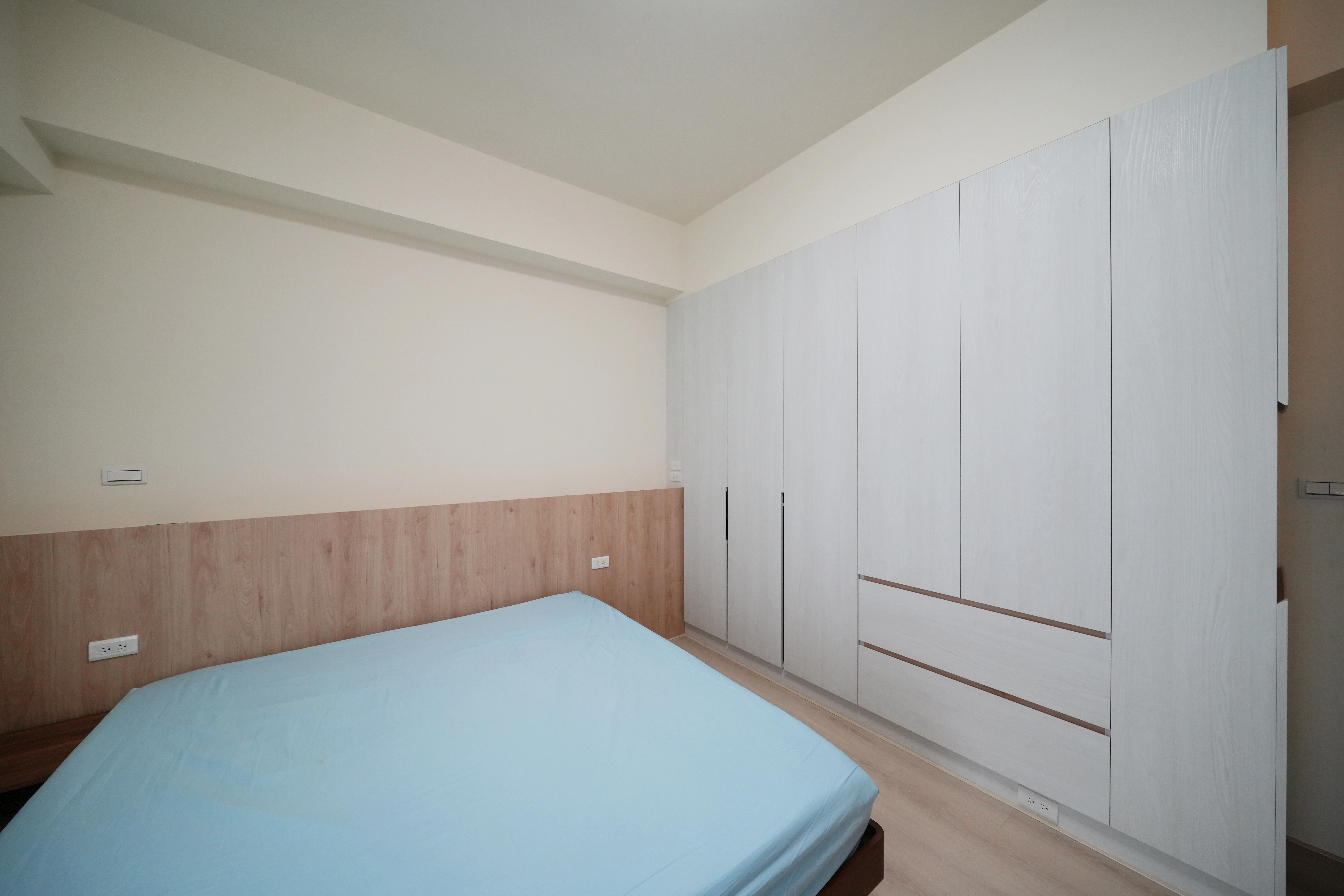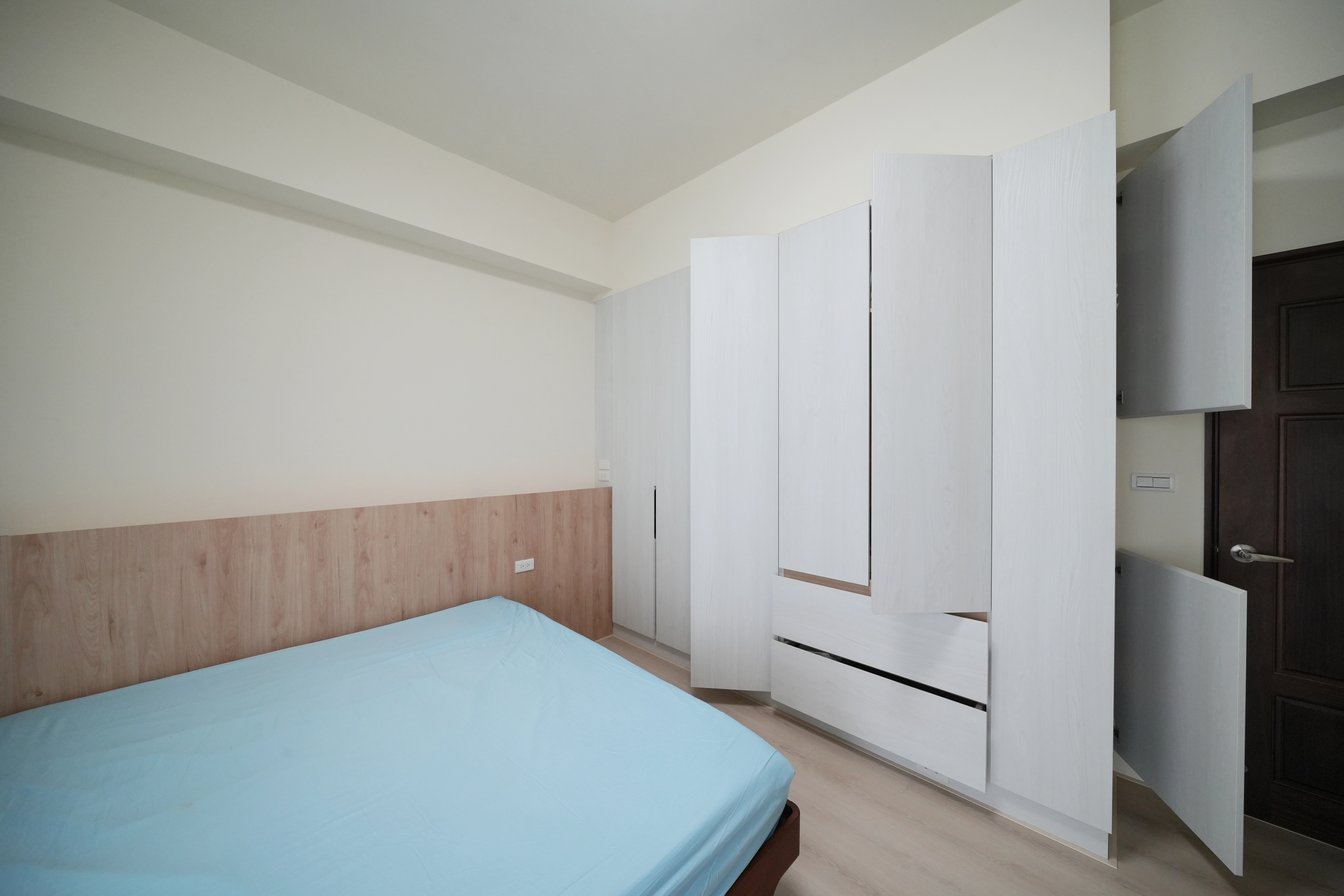 私領域的主臥室選用暖木色背牆營造溫馨感,地面鋪設超耐磨木地板提升踩踏觸感。我們利用整面系統開門衣櫃結合入口處的轉向收納設計,將儲物機能發揮到極致,構築出簡約實用的休憩場域。每一處細節皆考量到使用便利性,讓臥室在俐落線條下,依然保有居家應有的溫度。