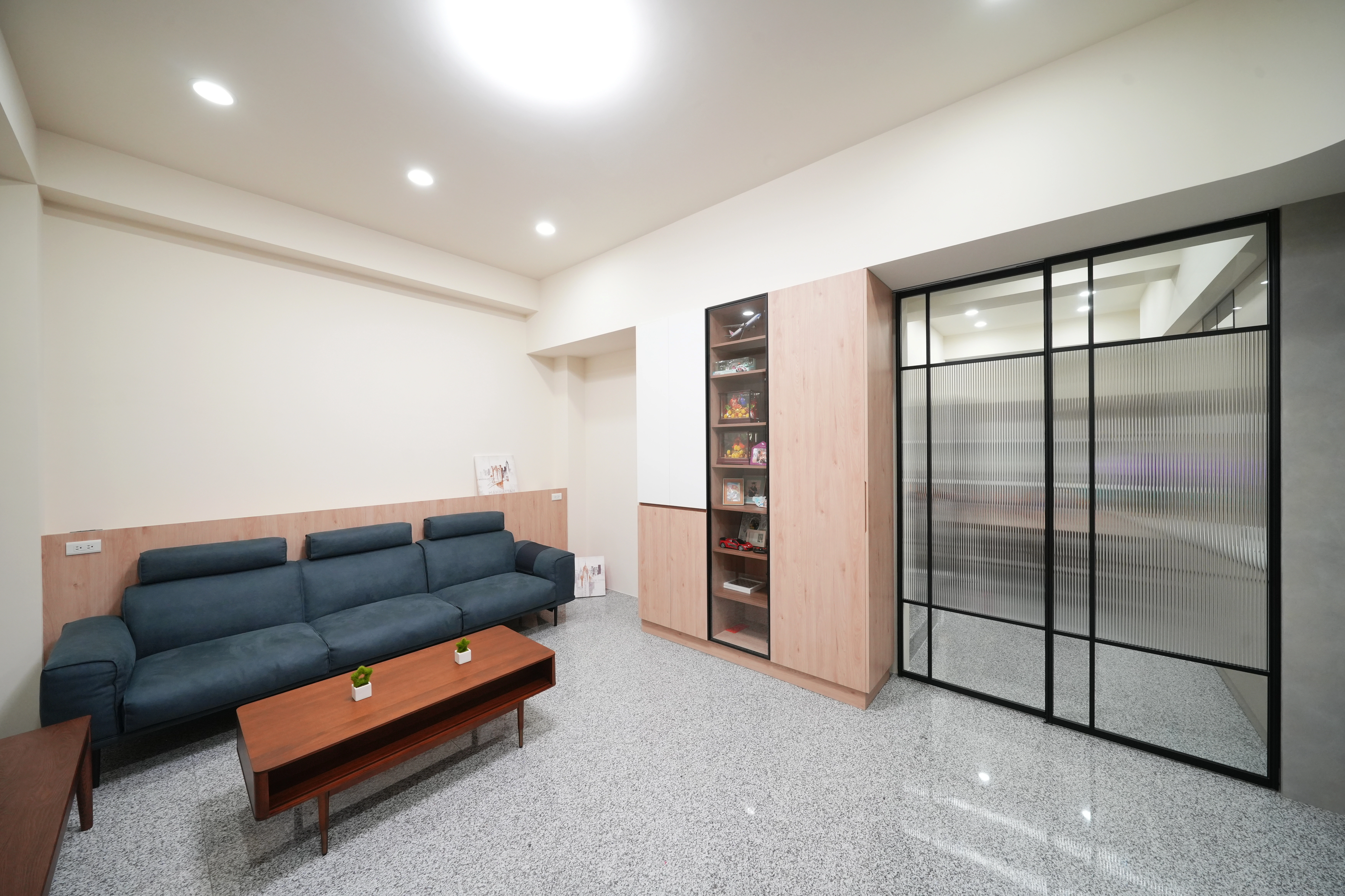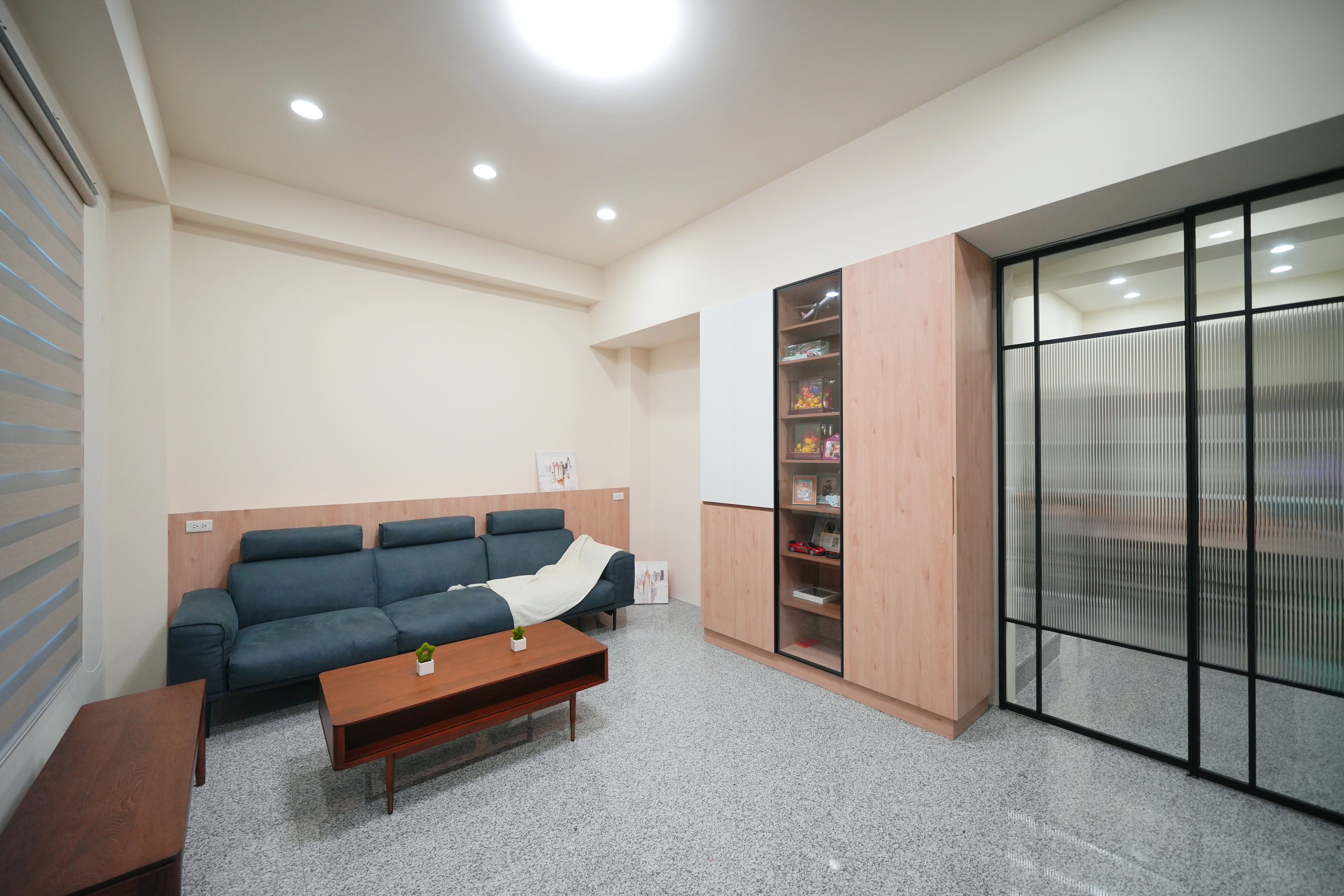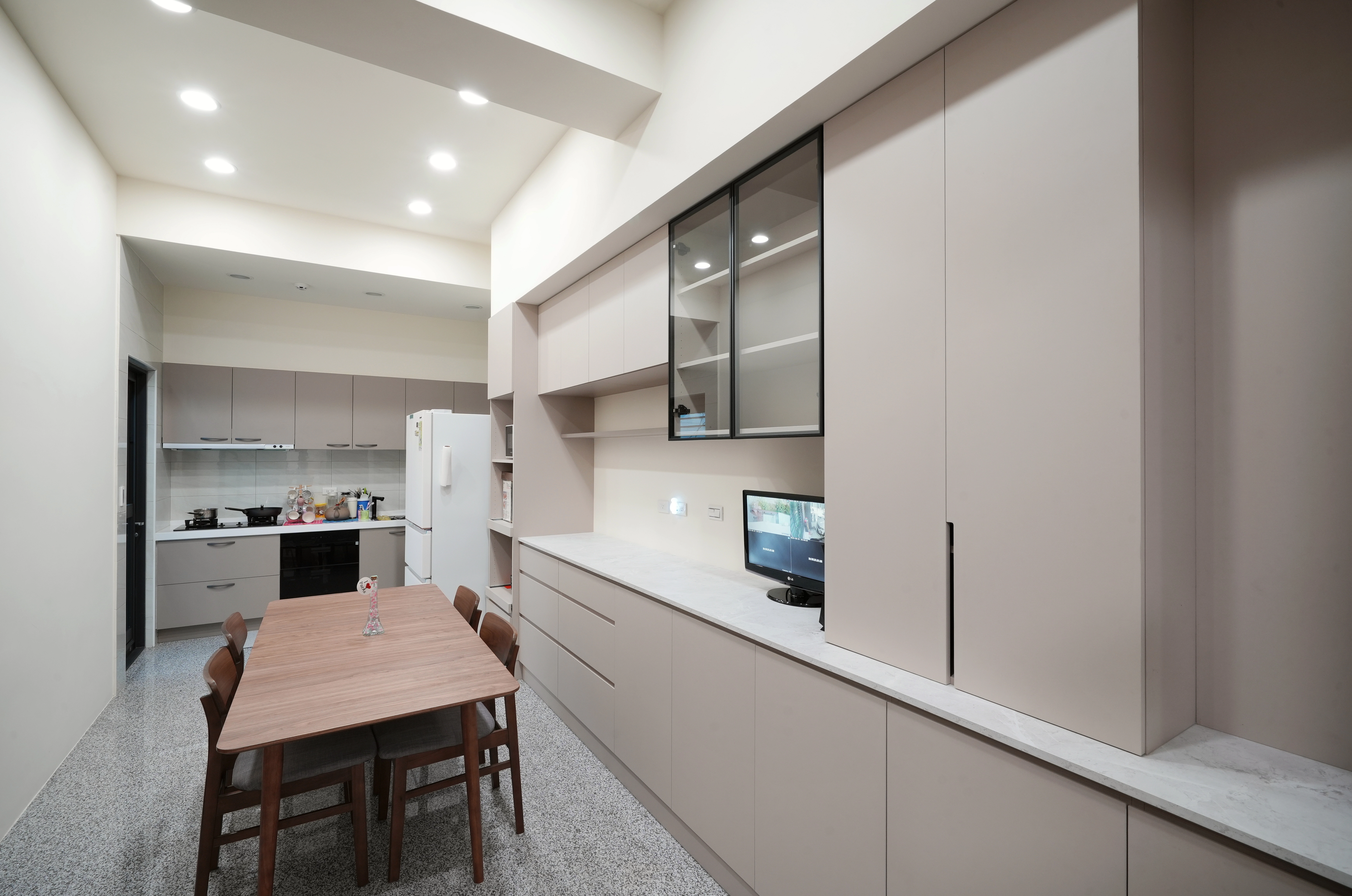 客廳以質感塗料定調,搭配系統懸吊櫃與多功能轉向衣櫃,滿足屋主對海量收納的需求。本案亮點在於鋁框長虹玻璃推拉門,不僅完美區隔場域,更保有光線的穿透美感。餐廳區則選用柔和的奶茶色系,透過收納中高櫃與電器櫃的精準配置,輔以鋁框玻璃懸吊櫃,在優雅氛圍中展現強大的機能實力。
