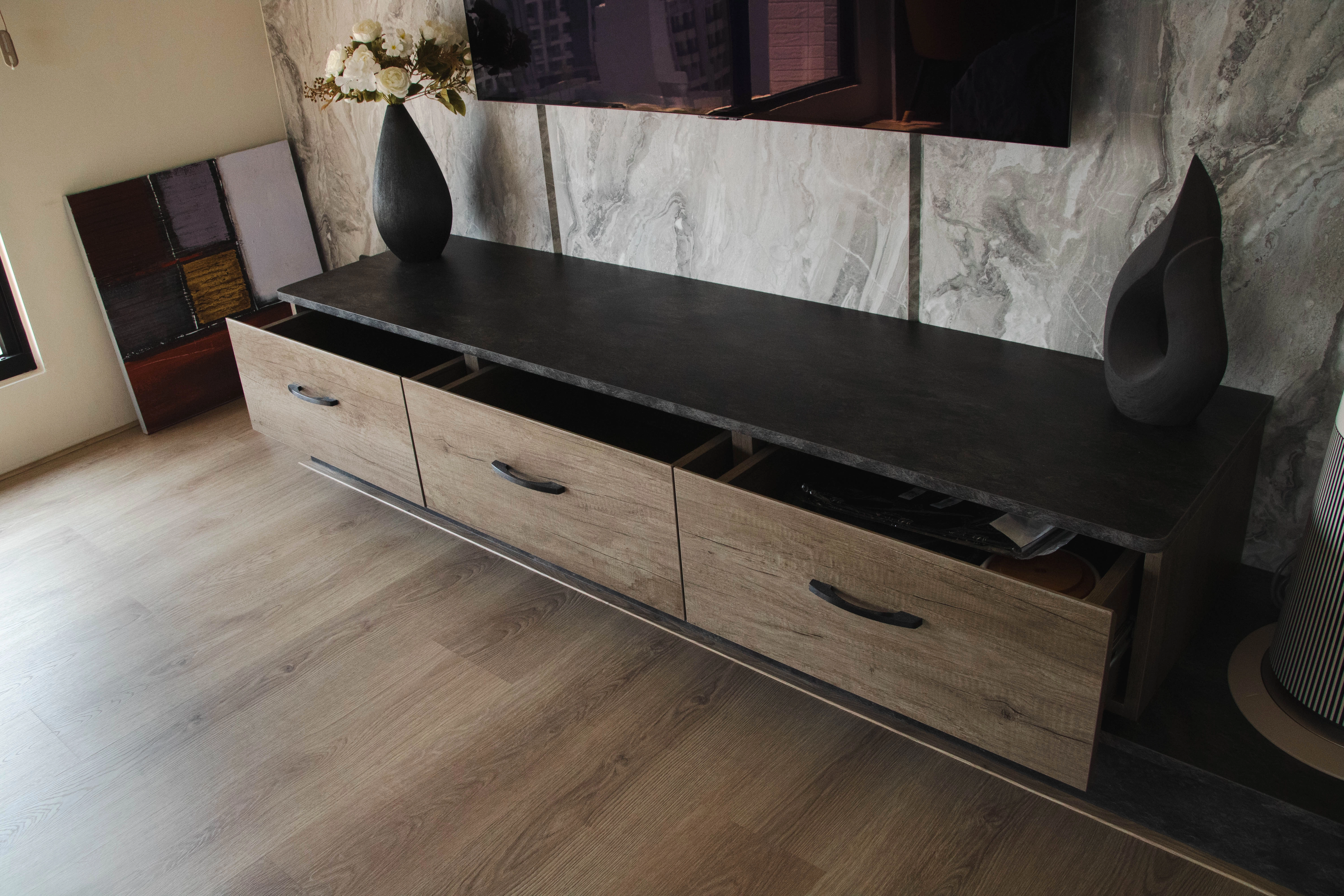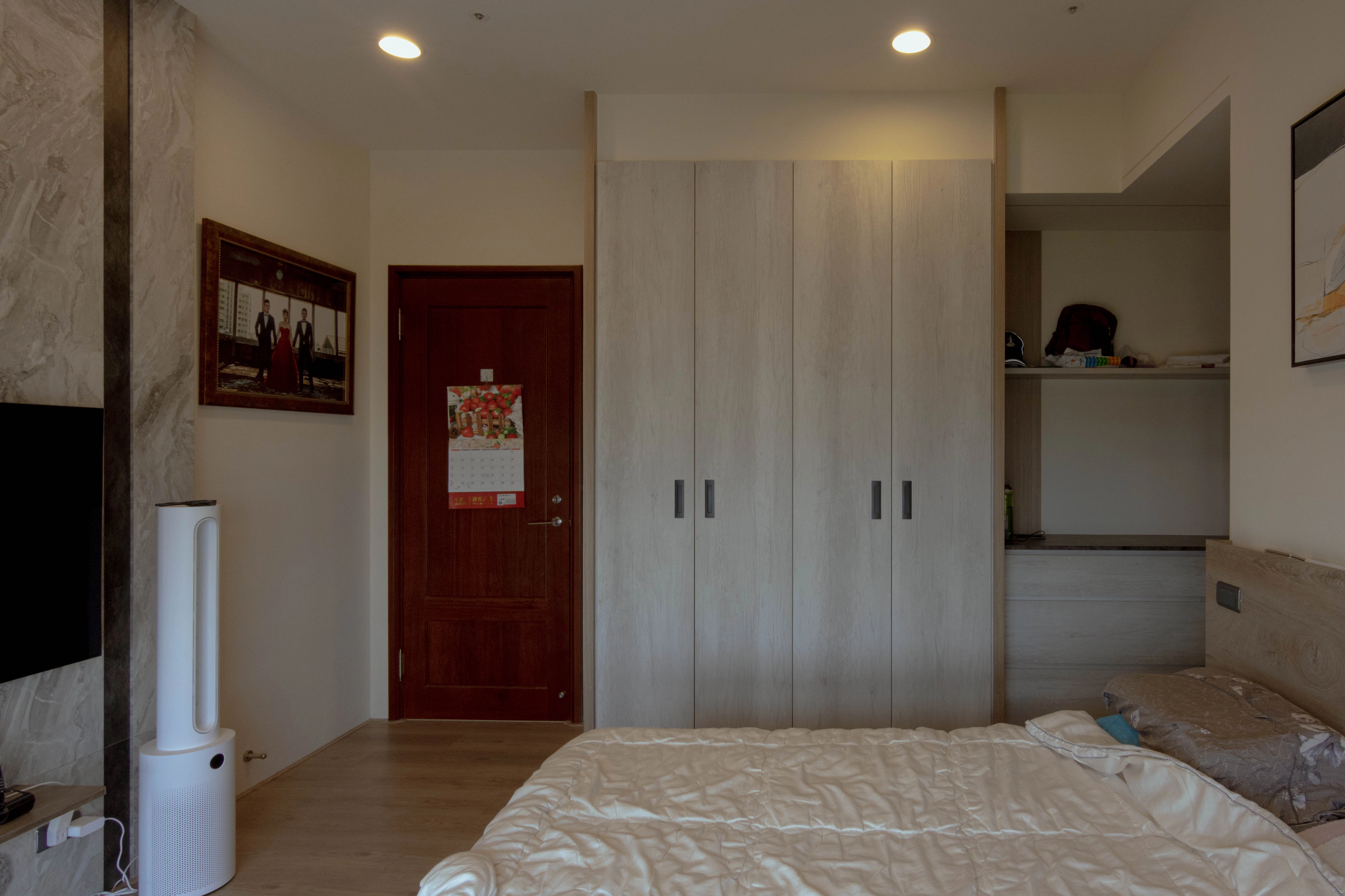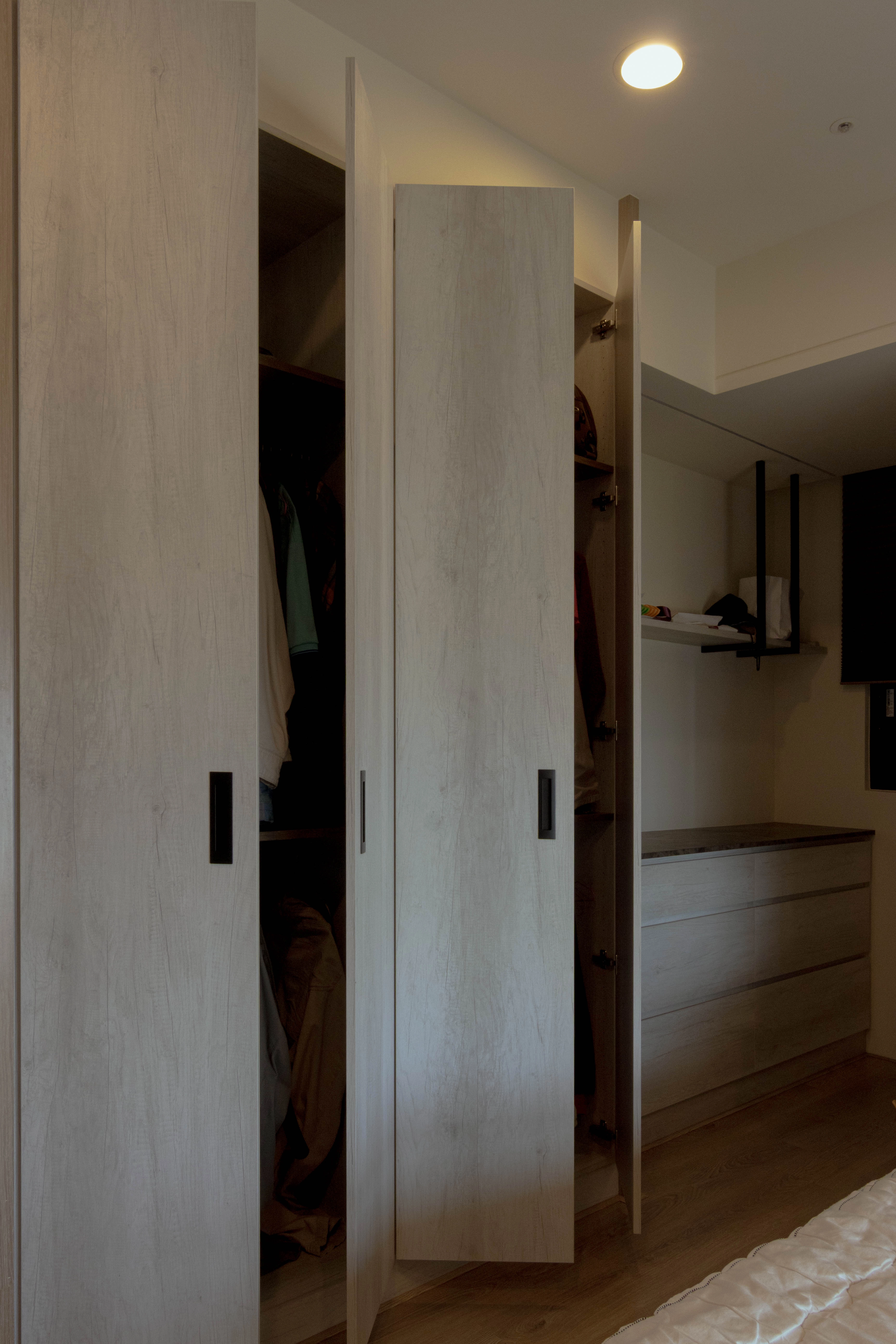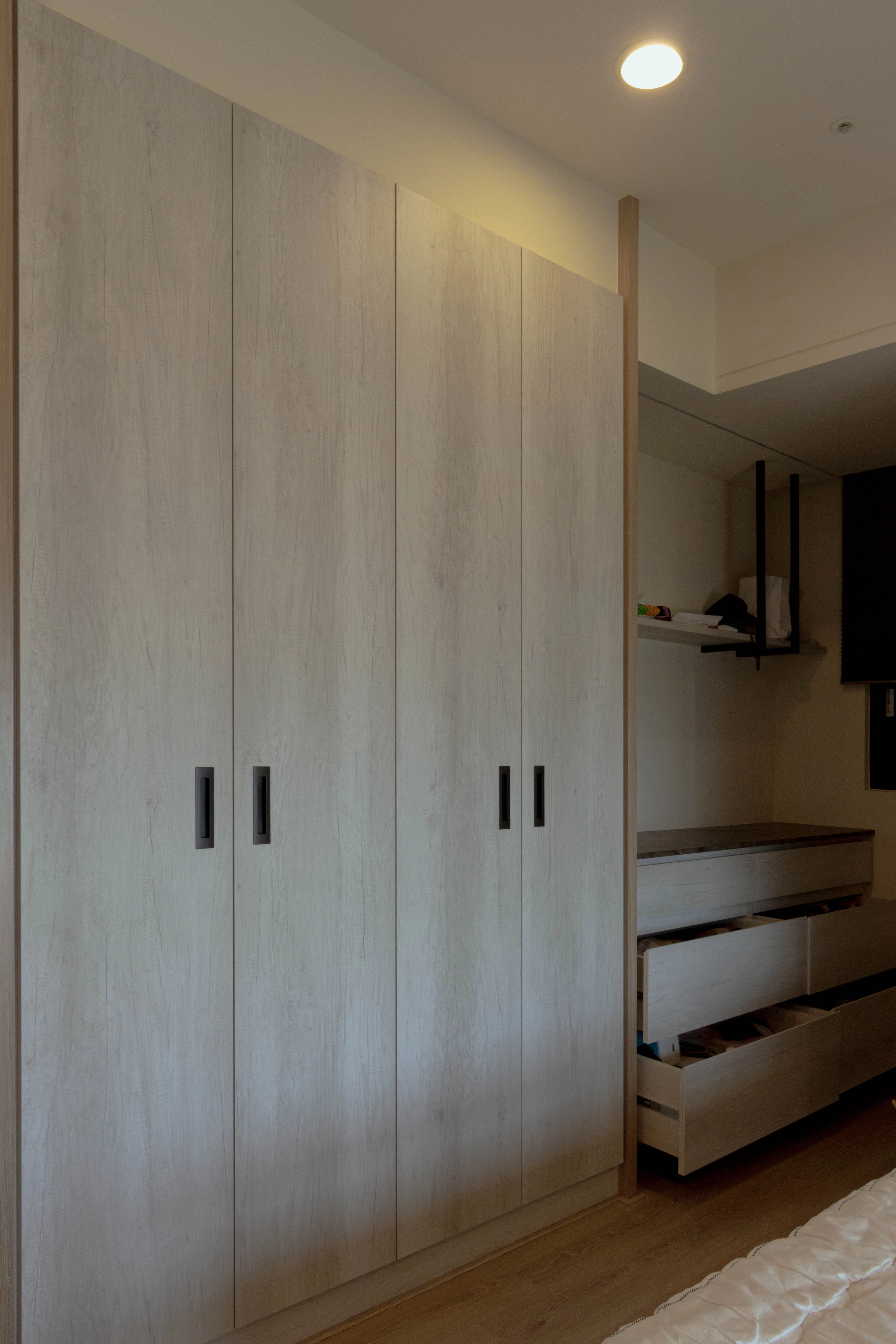 長輩房作為規劃重心,運用造型層板、鐵件烤漆與木作電視牆,平衡美感與實用機能;系統斗櫃搭配緩衝抽屜,讓日常收納更省力順手。全室直舖超耐磨木地板,觸感溫潤且提升行走安全;廚房則透過 L 型封板與冰箱收納櫃規劃,讓動線更加整潔俐落。德盈堅持「全室無銳角」手法,細心移除潛在危險。若您也想為長輩打造安心環境,歡迎諮詢德盈,讓我們用高品質系統家具,為家人落實更好的生活品質!