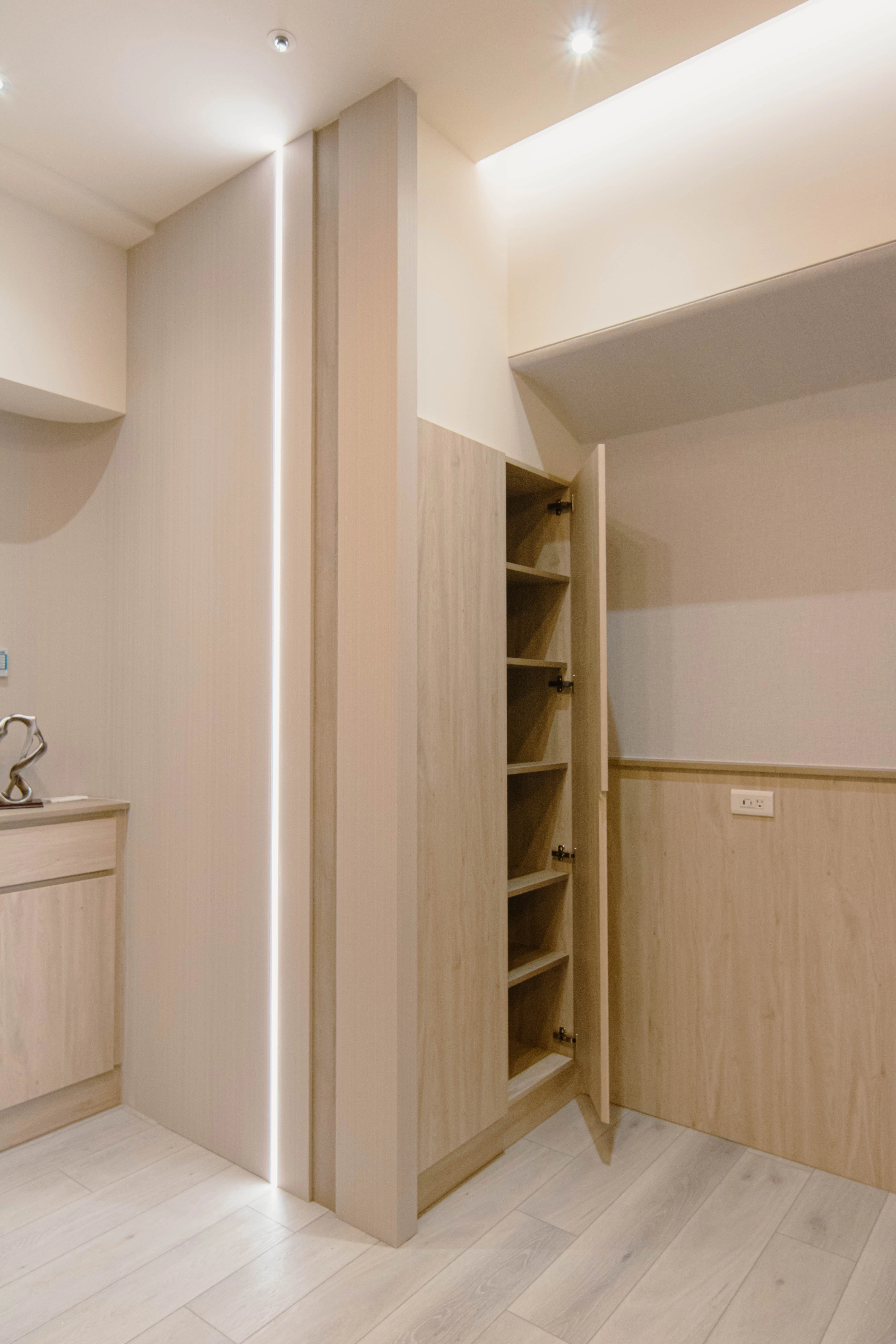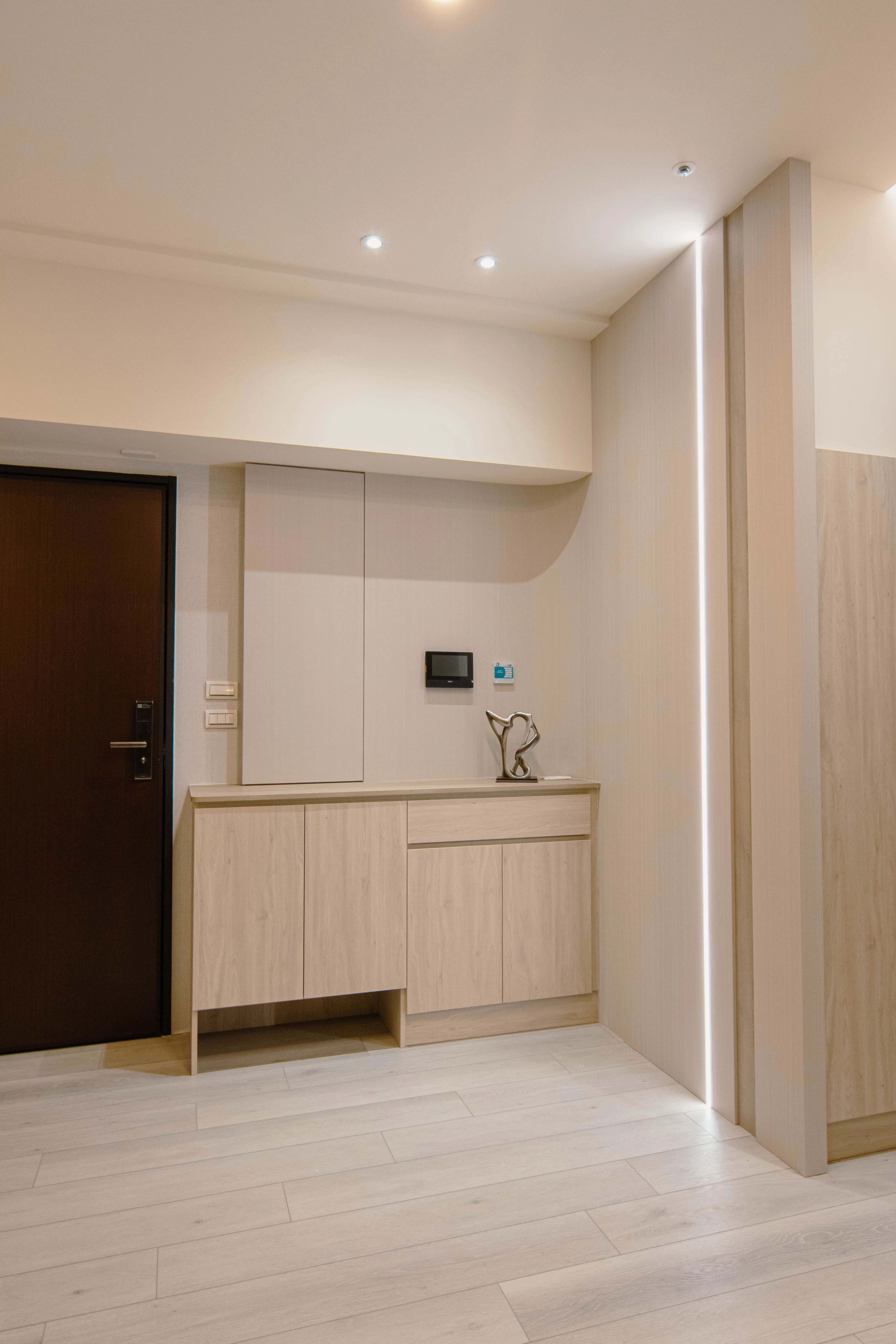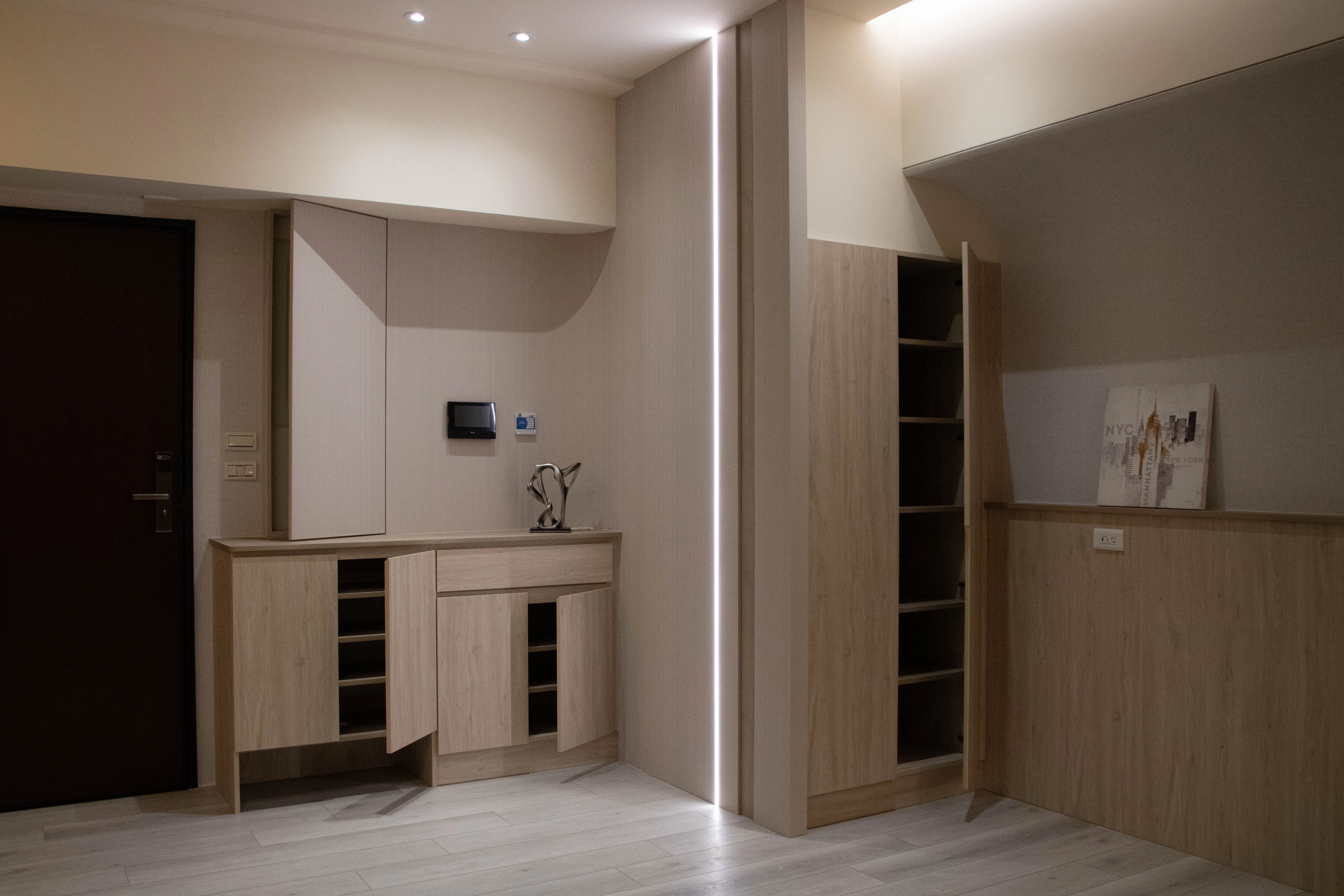 在玄關,我們巧妙運用木作造型天花板,並結合系統開門矮櫃與LED光帶,增添現代感與實用的收納機能。客廳區域,我們採用系統懸吊電視矮櫃,維持視覺輕盈,並在電視牆面漆上溫暖的塗料。而在一旁的休憩區,透過木作加高10公分區隔,與客廳區劃開來,並於下方設置收納上掀櫃,有效利用空間。