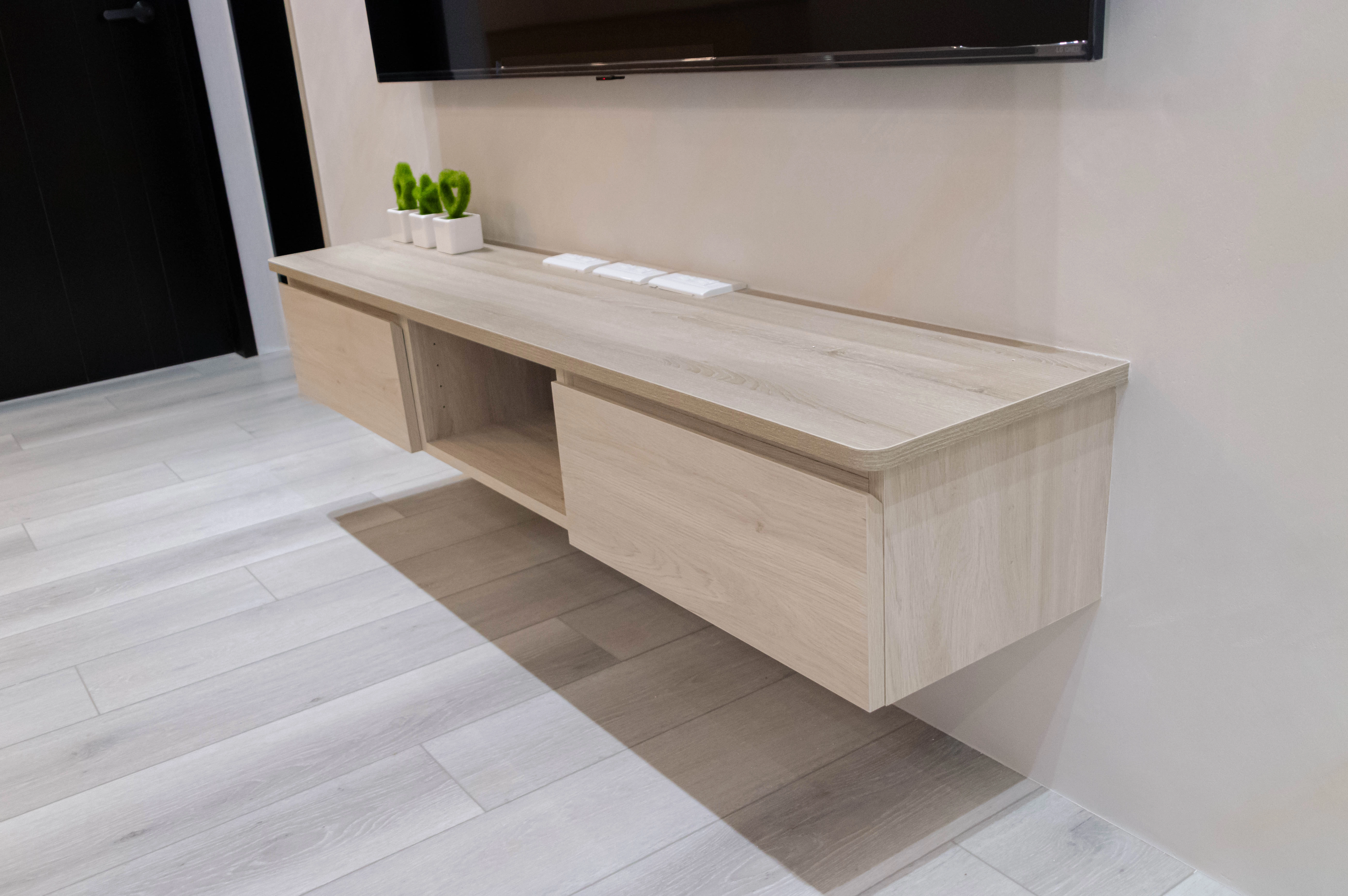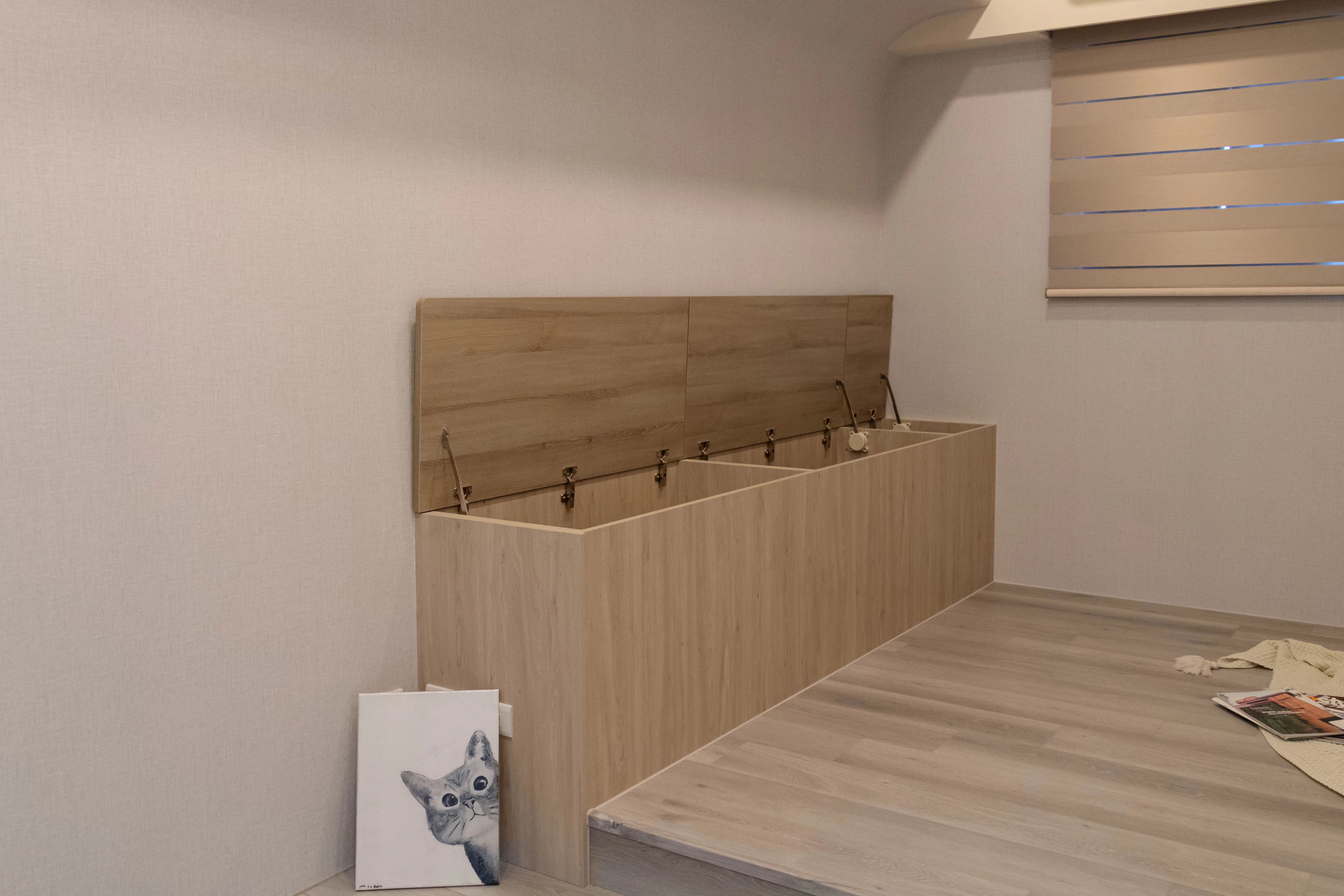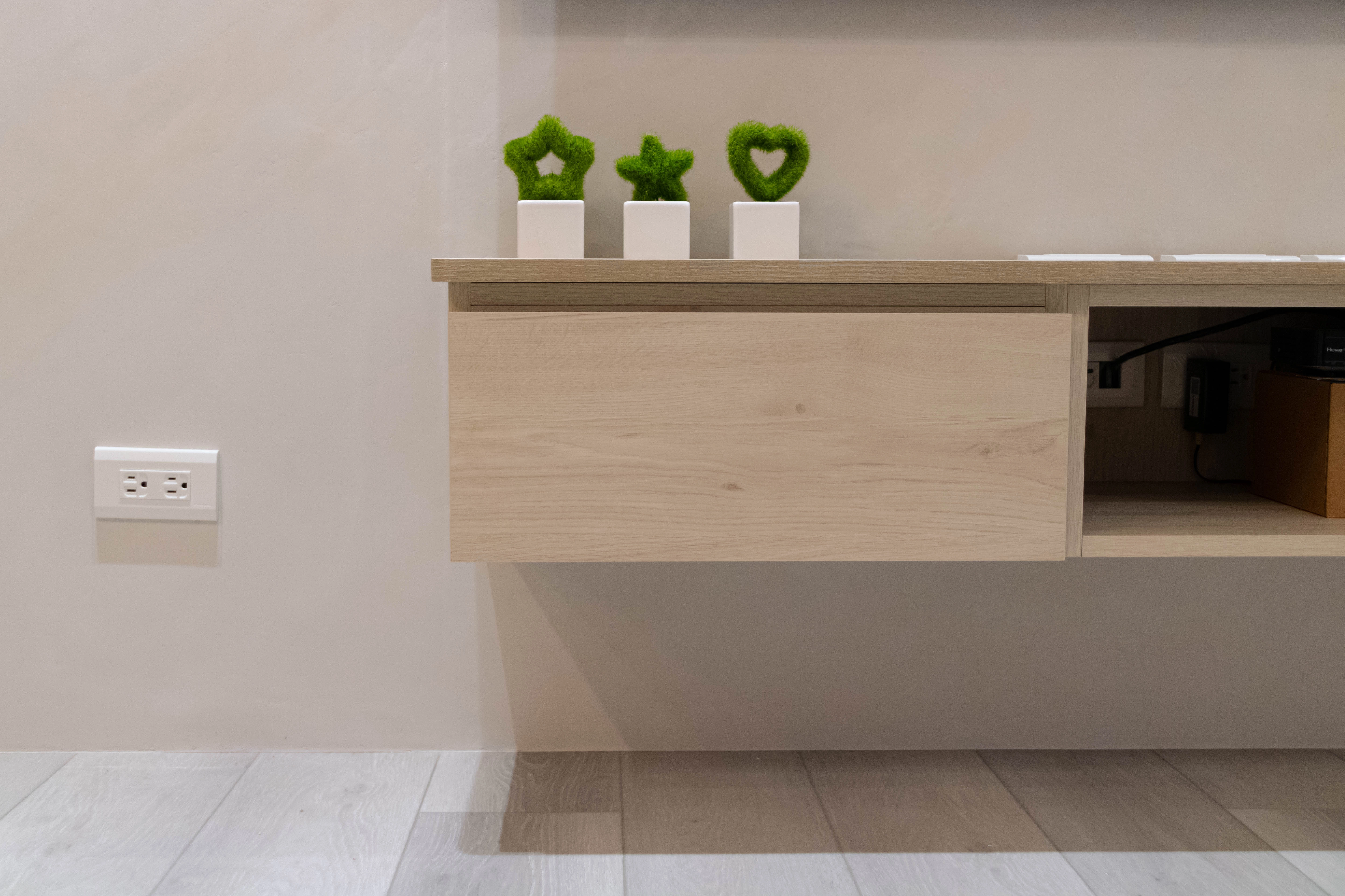 在玄關,我們巧妙運用木作造型天花板,並結合系統開門矮櫃與LED光帶,增添現代感與實用的收納機能。客廳區域,我們採用系統懸吊電視矮櫃,維持視覺輕盈,並在電視牆面漆上溫暖的塗料。而在一旁的休憩區,透過木作加高10公分區隔,與客廳區劃開來,並於下方設置收納上掀櫃,有效利用空間。