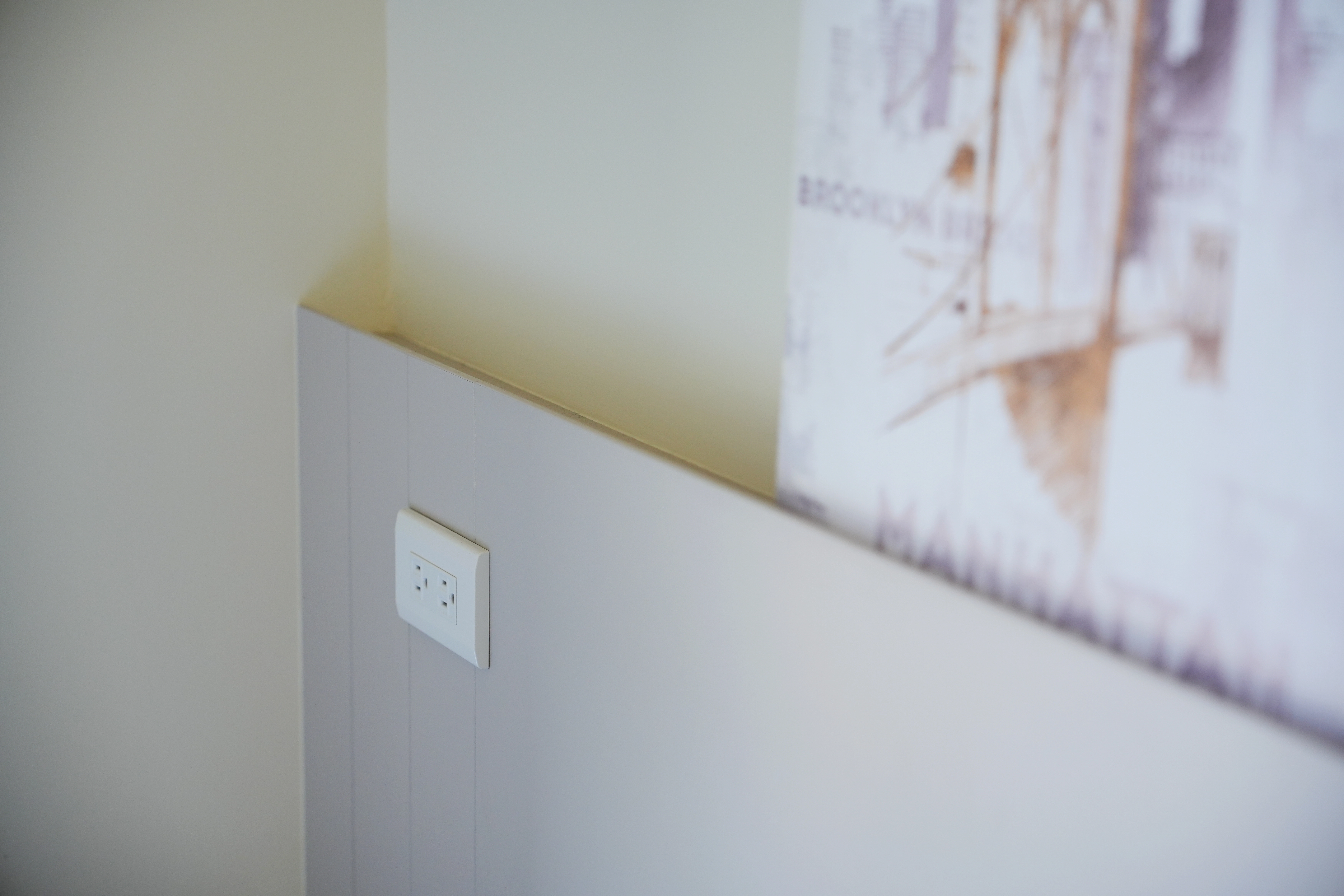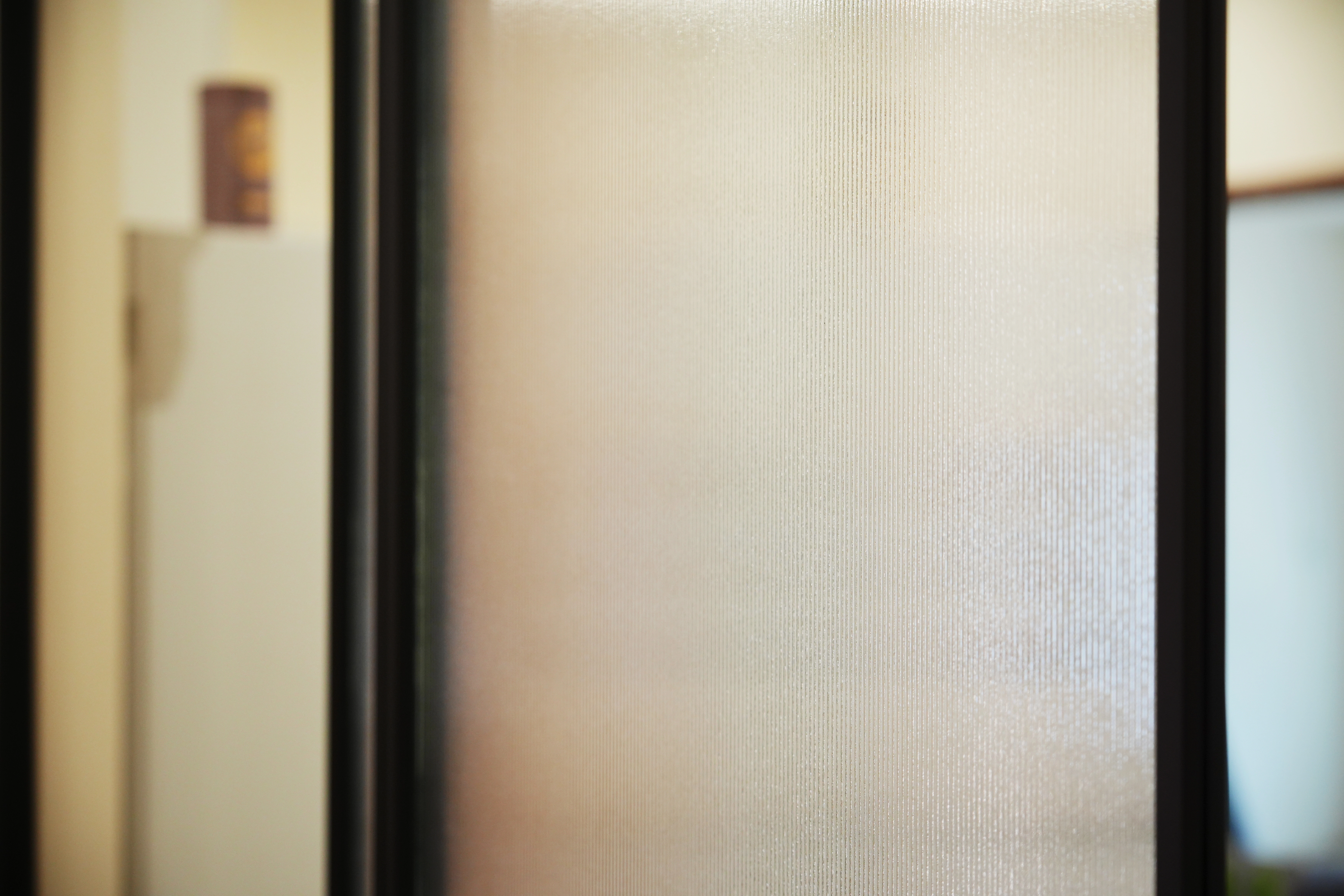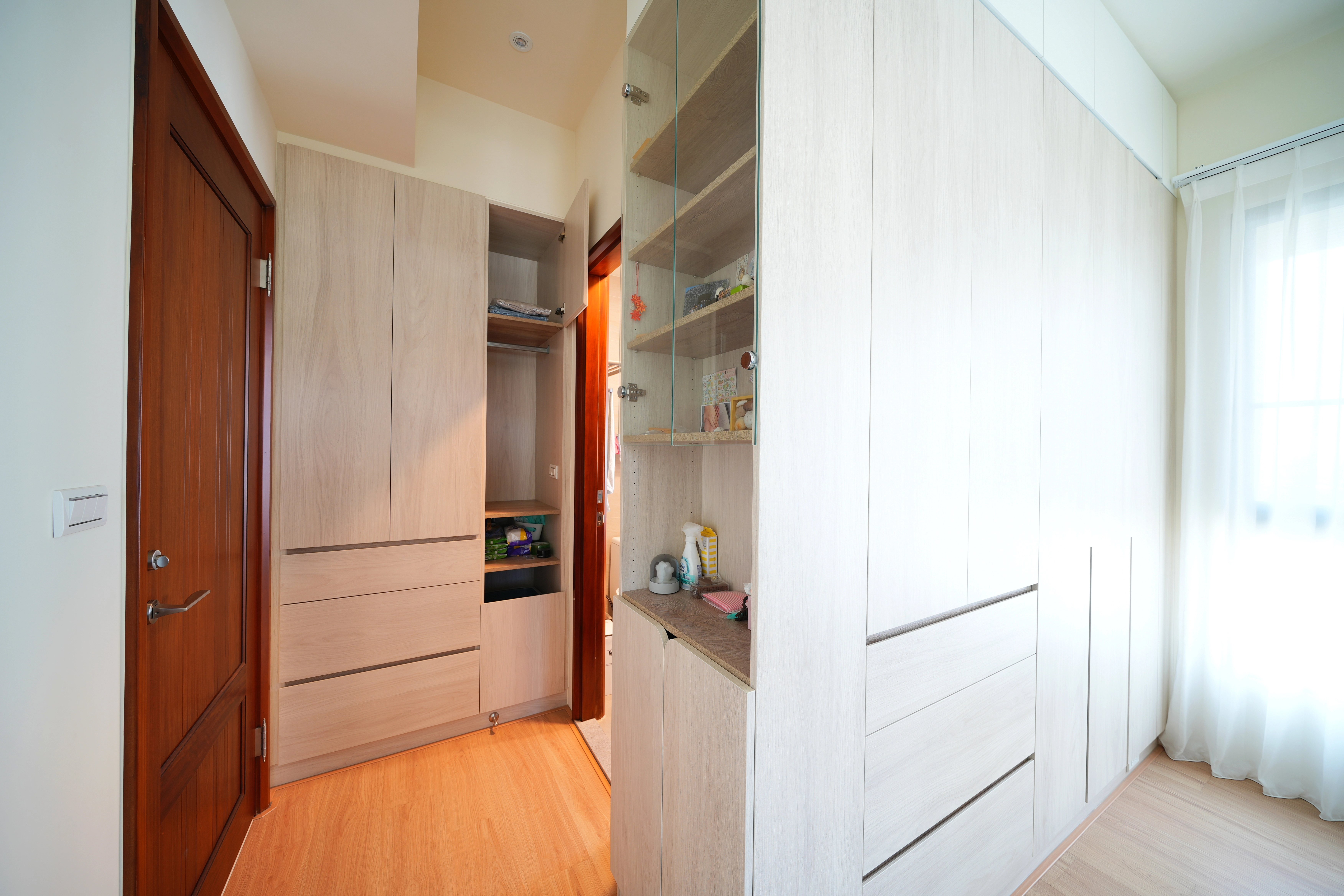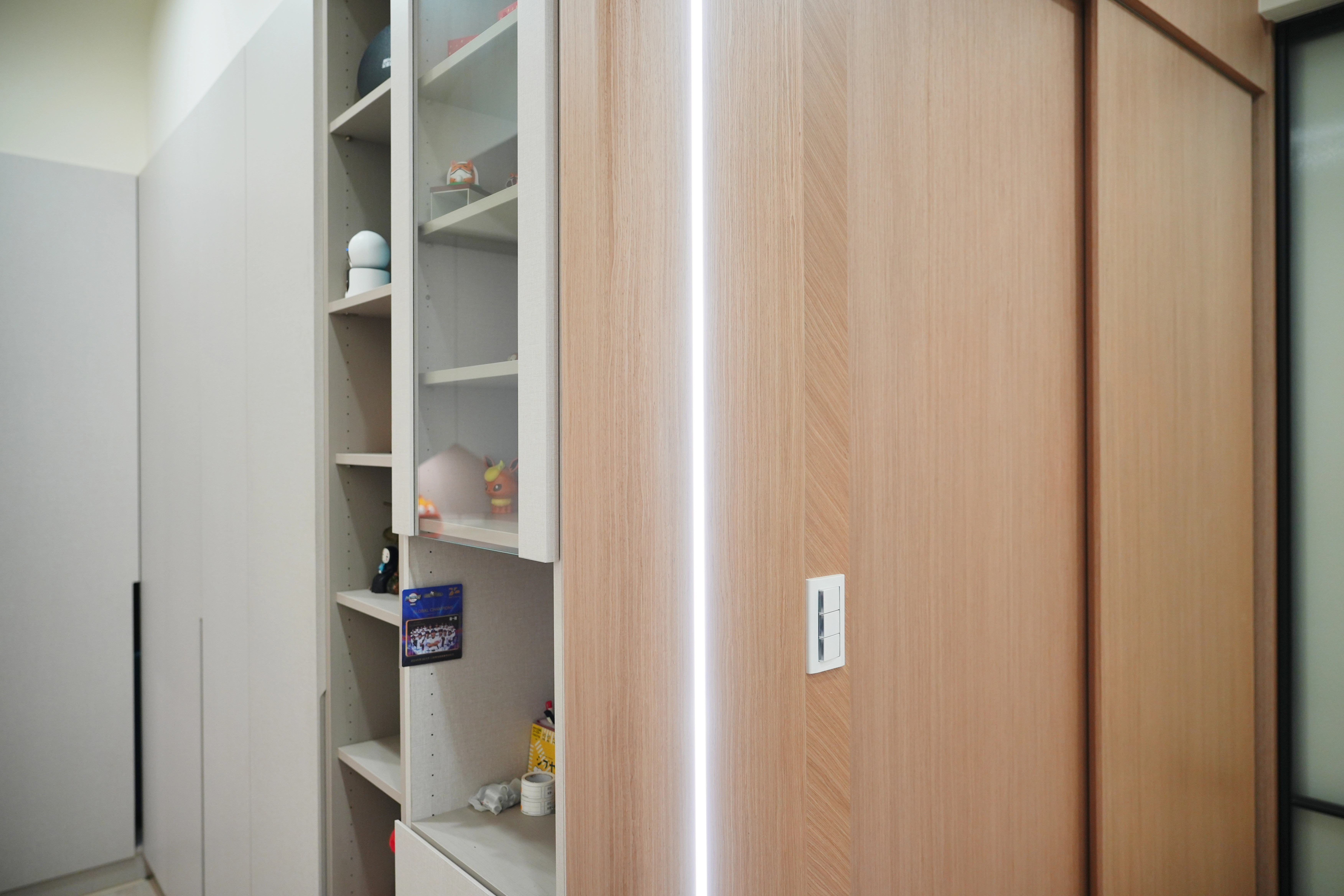 從玄關處的系統 L 型收納櫃開始,便為室內注入平穩氛圍。走道特別選用鋁框推拉門內嵌冰柱玻璃,在引導採光之餘,更堆疊出視覺層次感。客廳部分,系統電視櫃結合沙發後方的半高牆設計,構築出放鬆的休憩場域,電視牆則透過藝術塗料的紋理,為整體空間增添人文氣息。