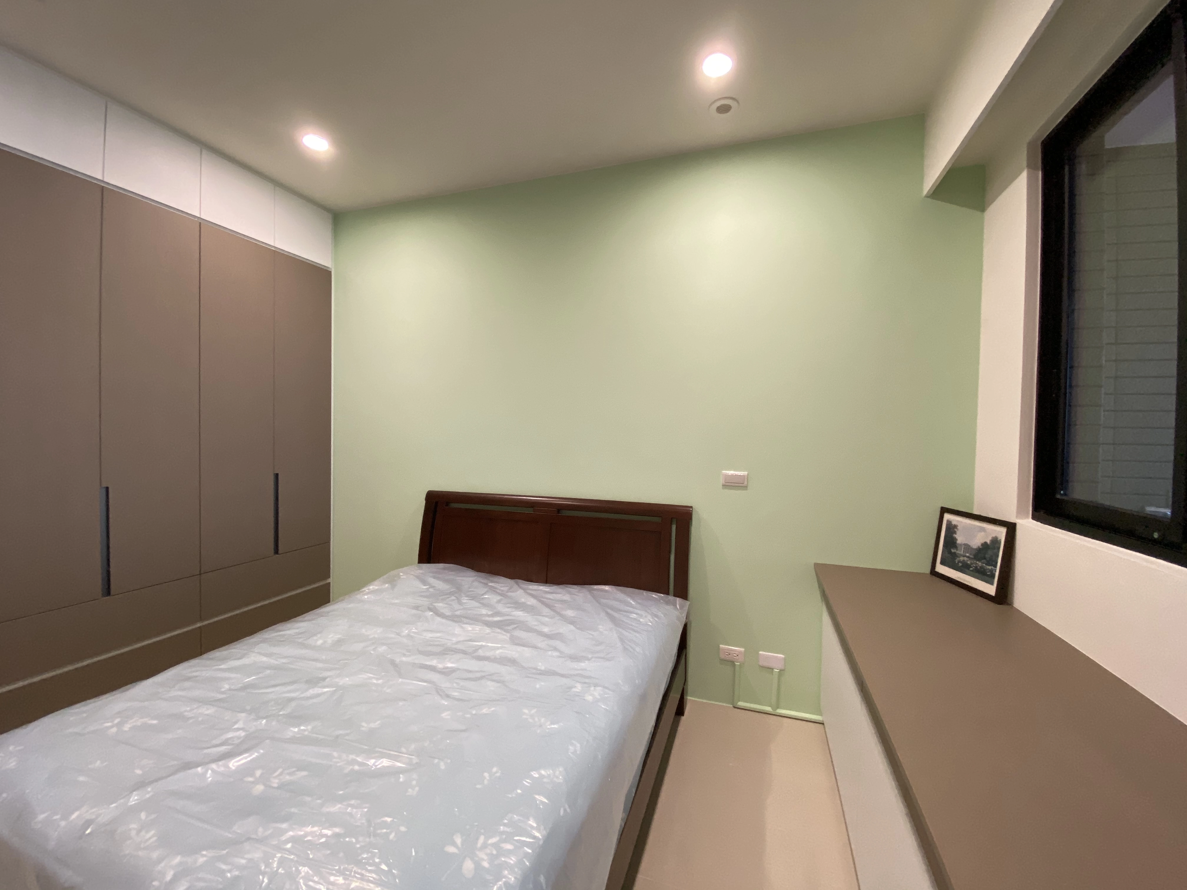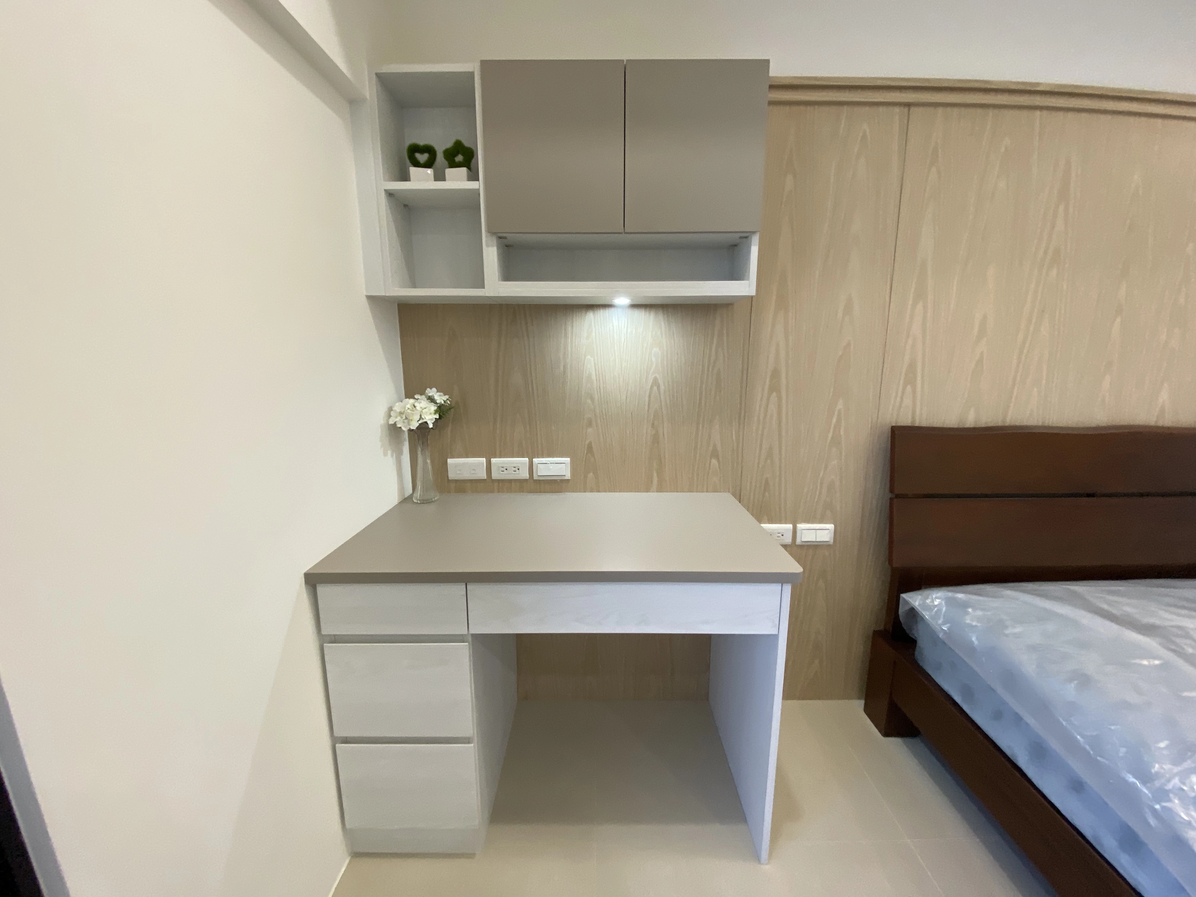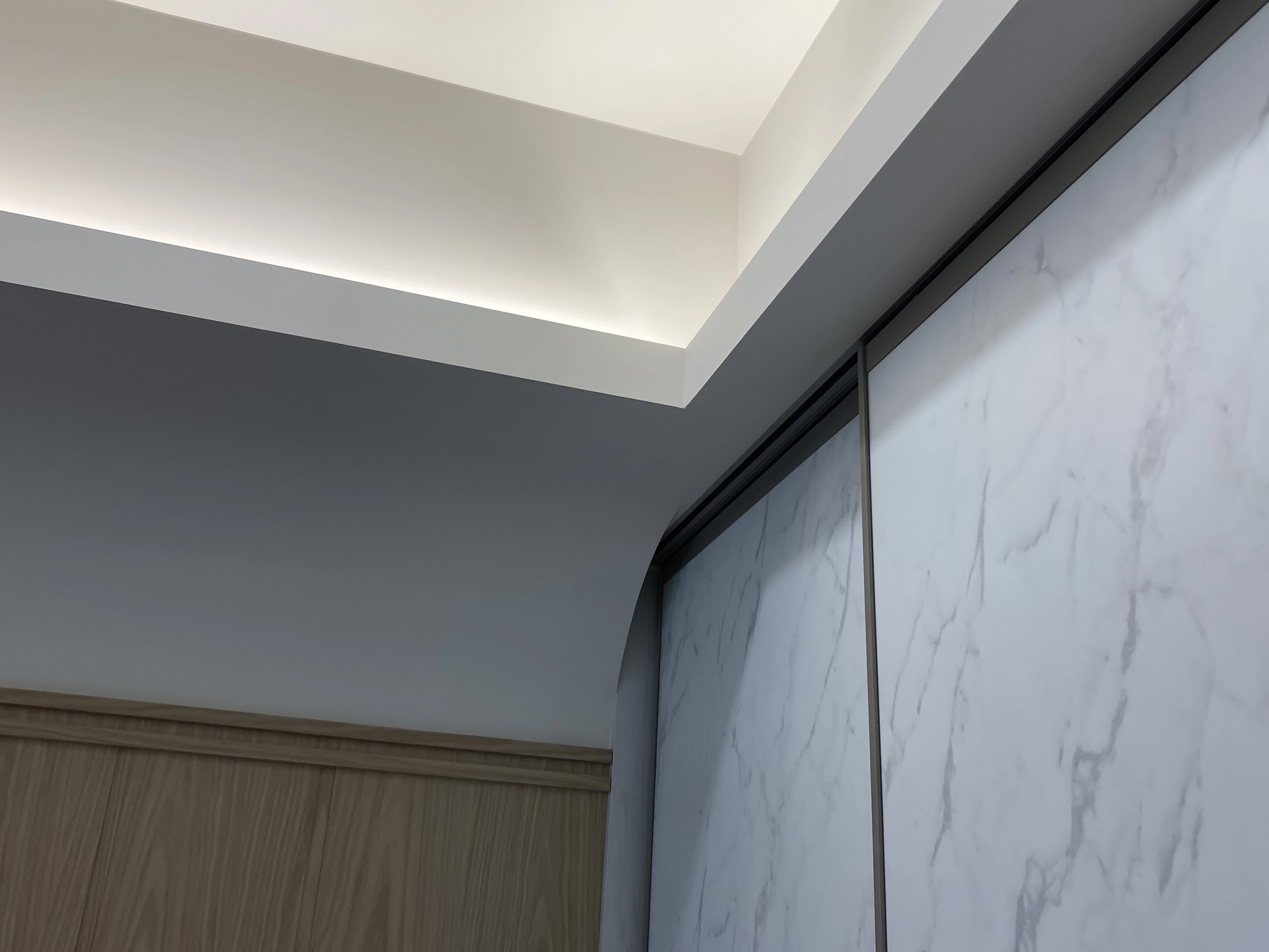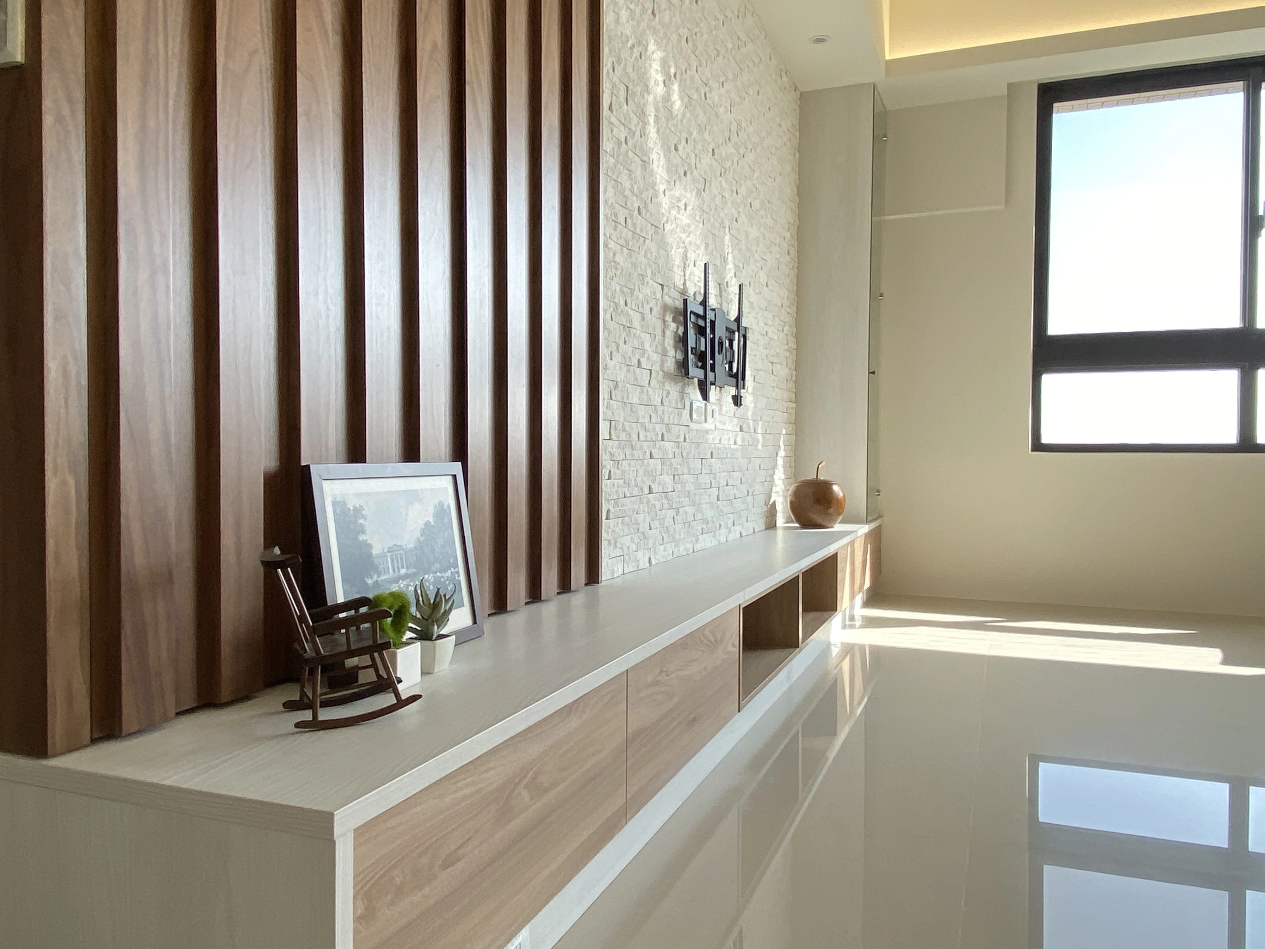 客廳以木作沙發半高牆搭配系統櫃,型塑出無壓的休憩氛圍,並在電視牆點綴文化石,增添自然的視覺紋理。餐廳區設置矮櫃組,讓用餐動線更加便利順手。主臥室則展現細膩工法,以造型斜角圓弧天花板搭配木作床頭背牆,營造溫潤的睡眠環境,並配置客製化系統化妝台滿足日常所需。次臥空間則兼顧學習與儲物,整合了系統書桌與衣櫃設計。