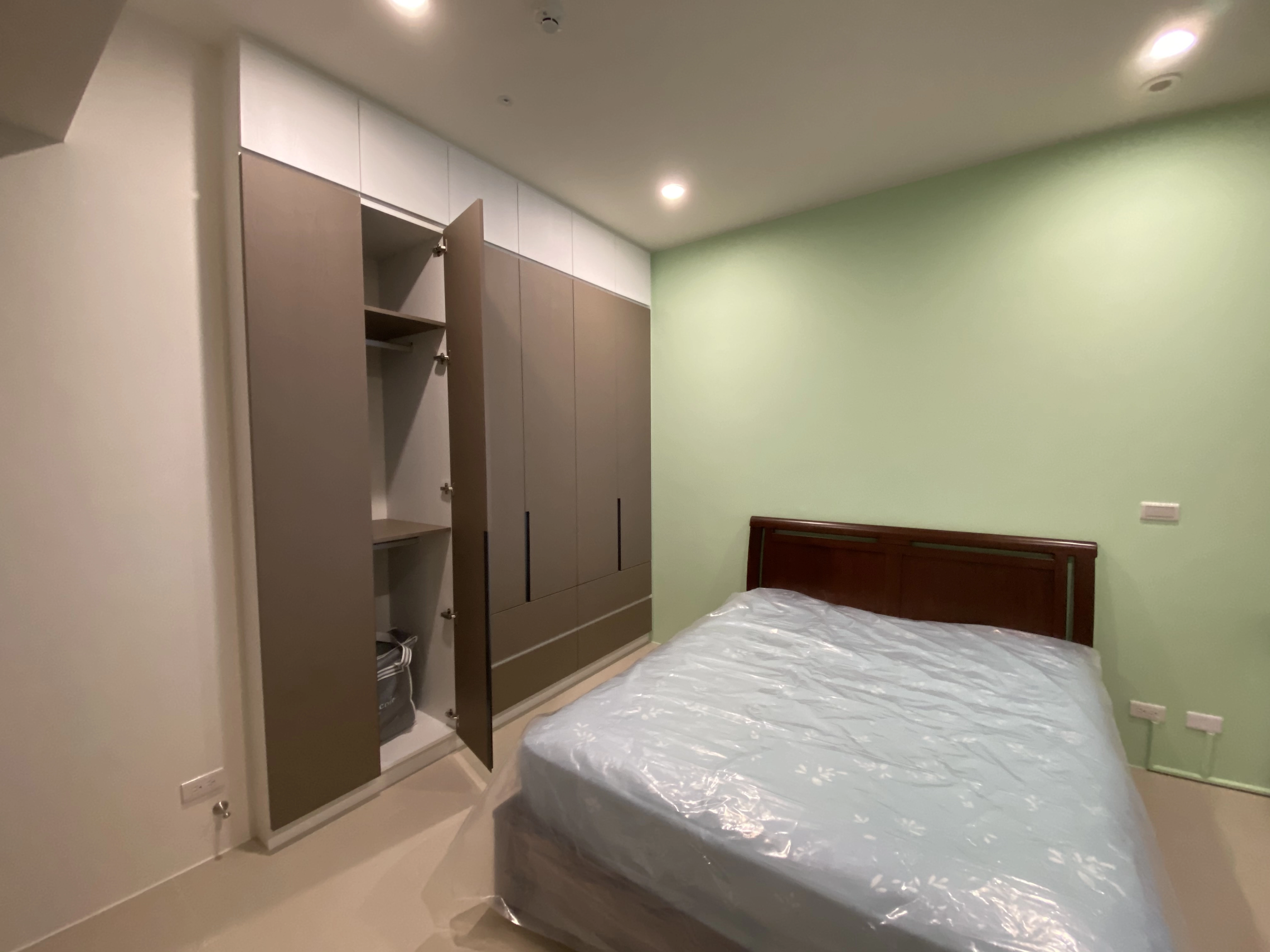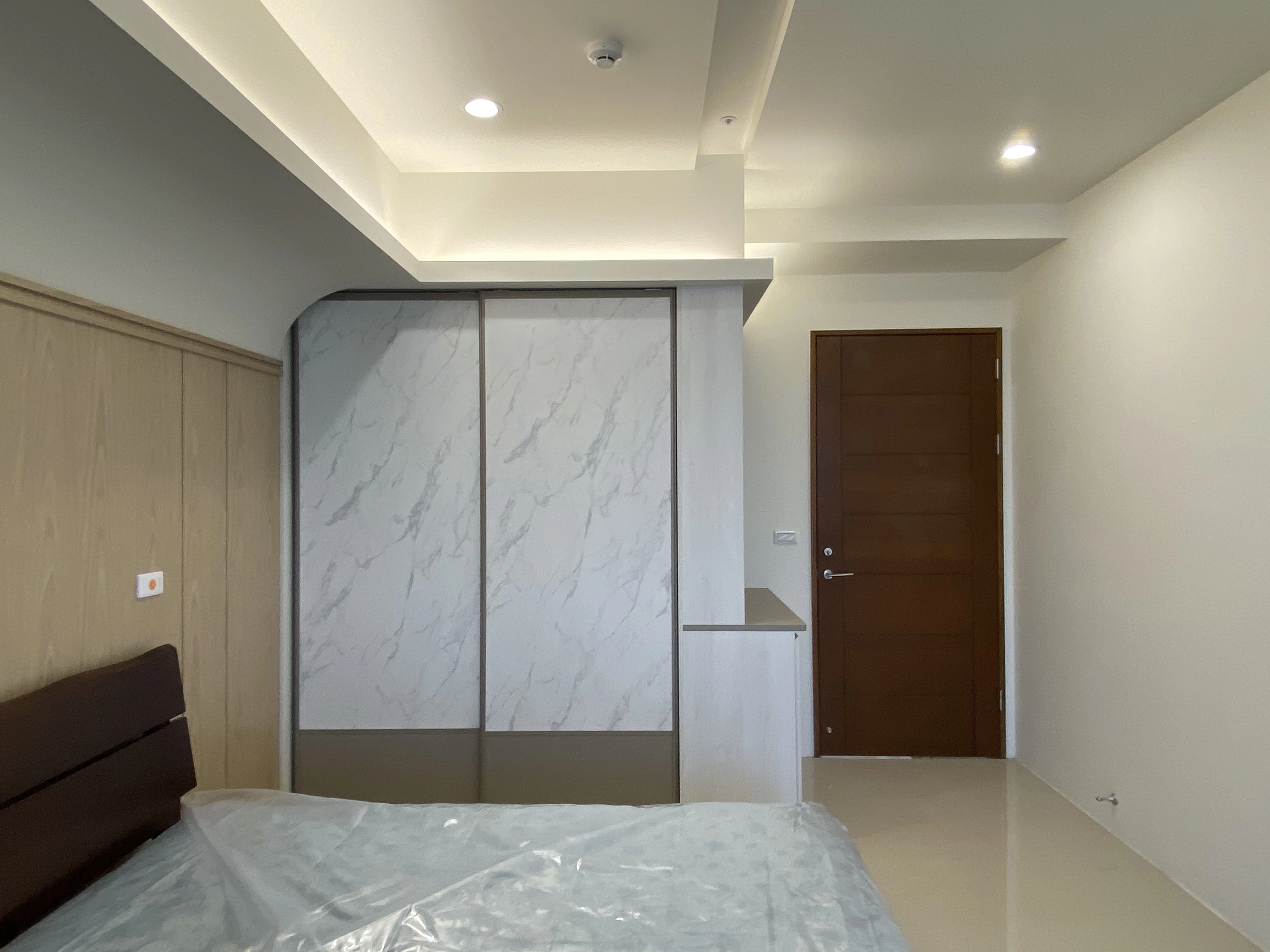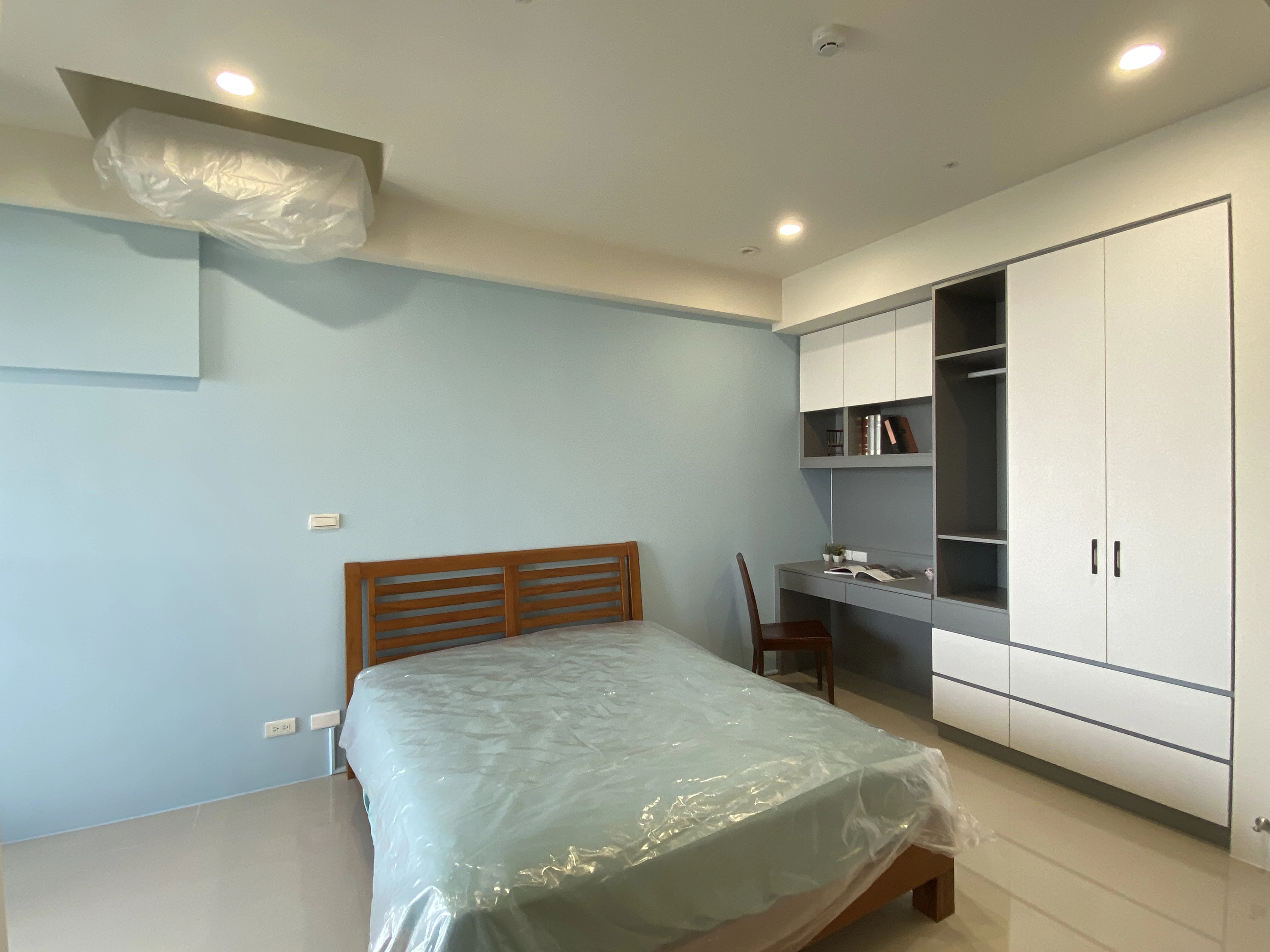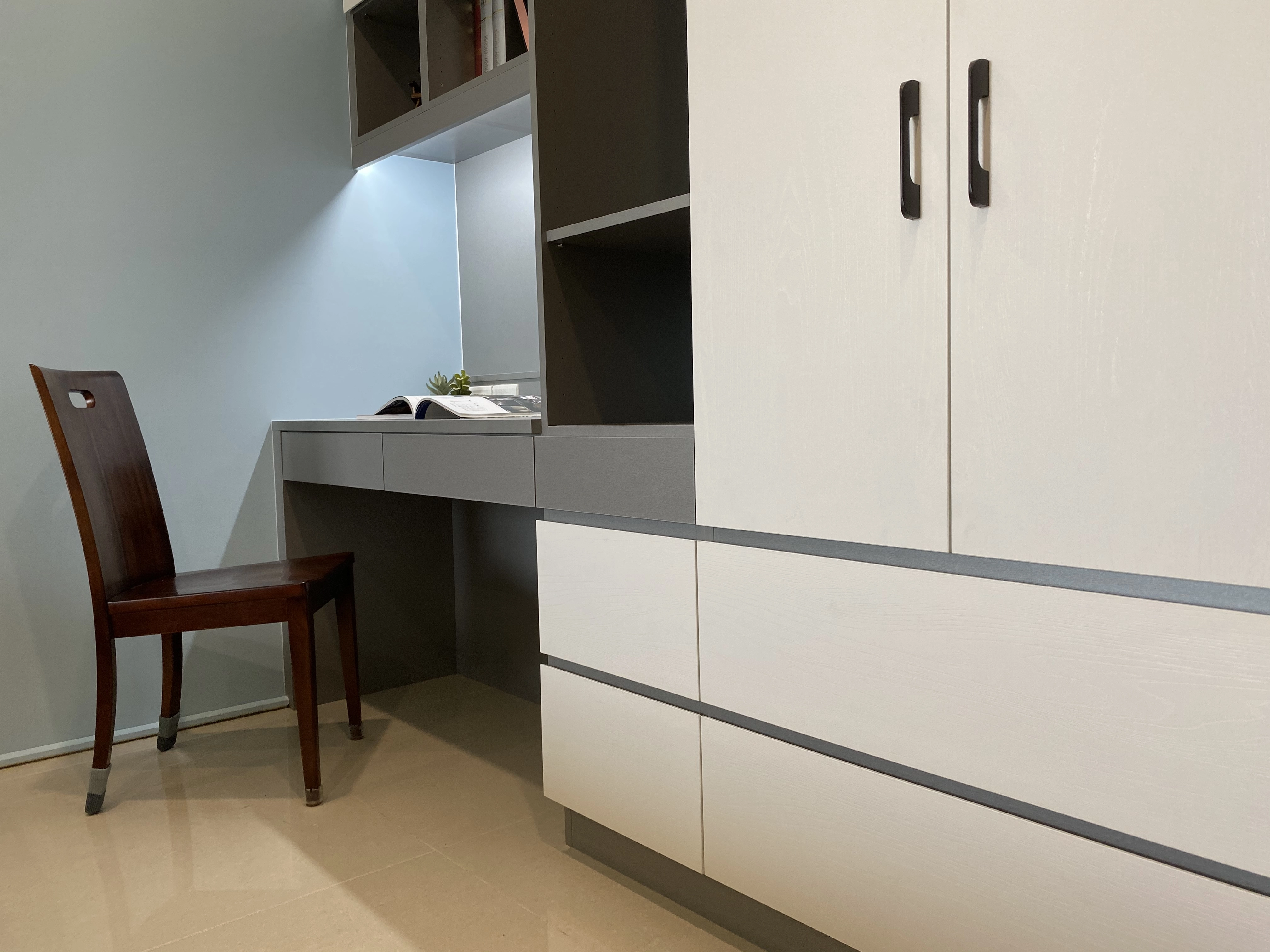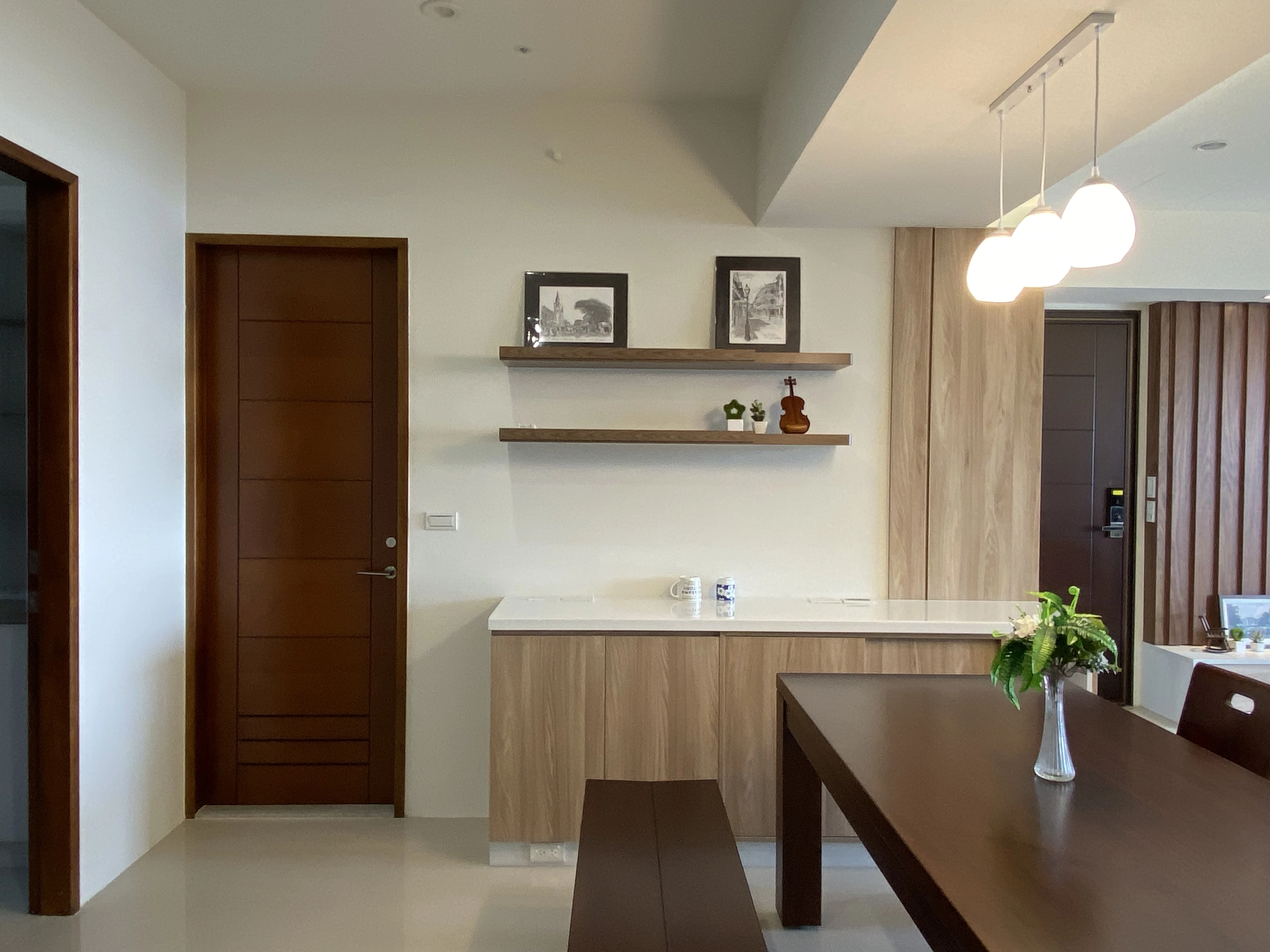 客廳以木作沙發半高牆搭配系統櫃,型塑出無壓的休憩氛圍,並在電視牆點綴文化石,增添自然的視覺紋理。餐廳區設置矮櫃組,讓用餐動線更加便利順手。主臥室則展現細膩工法,以造型斜角圓弧天花板搭配木作床頭背牆,營造溫潤的睡眠環境,並配置客製化系統化妝台滿足日常所需。次臥空間則兼顧學習與儲物,整合了系統書桌與衣櫃設計。
