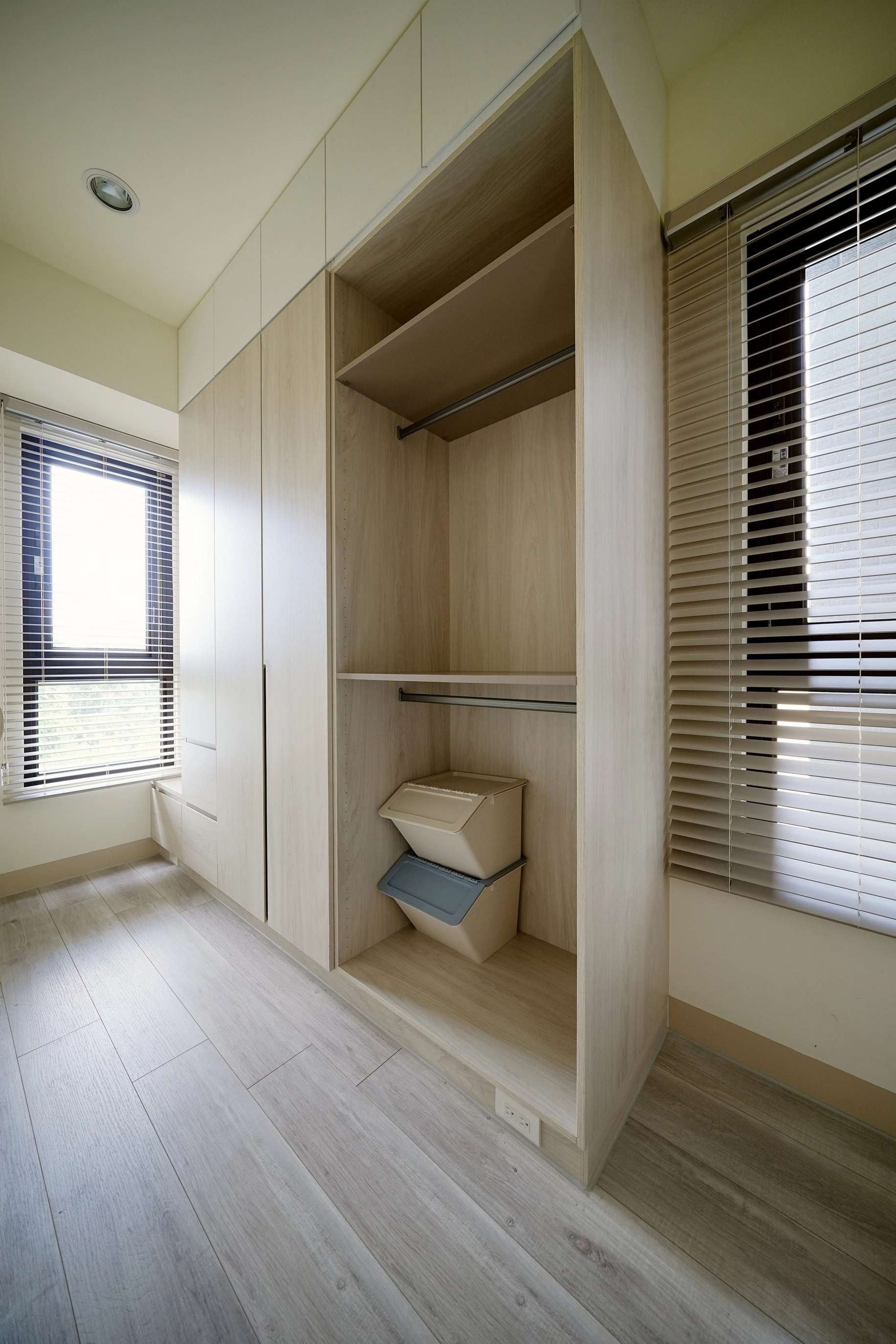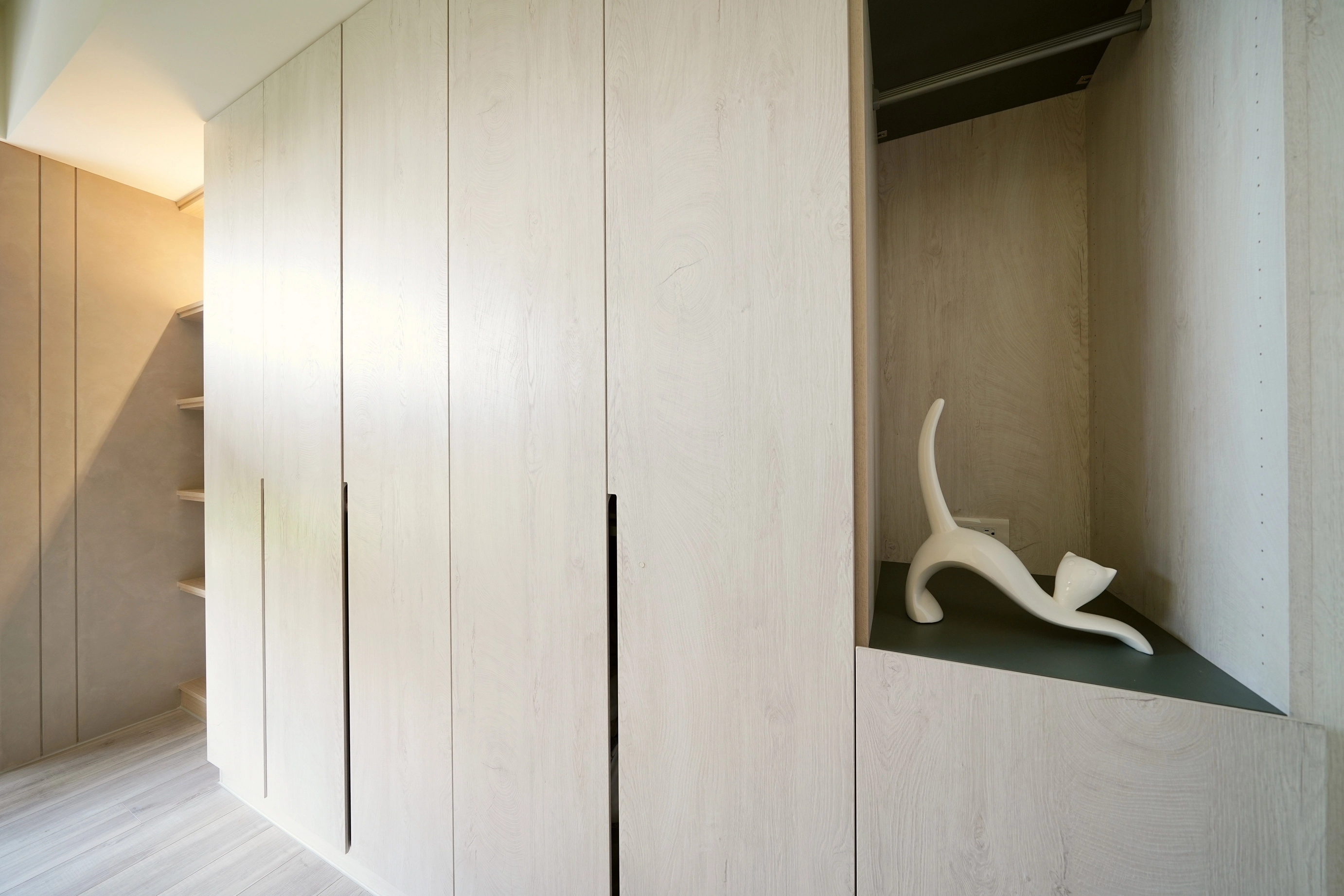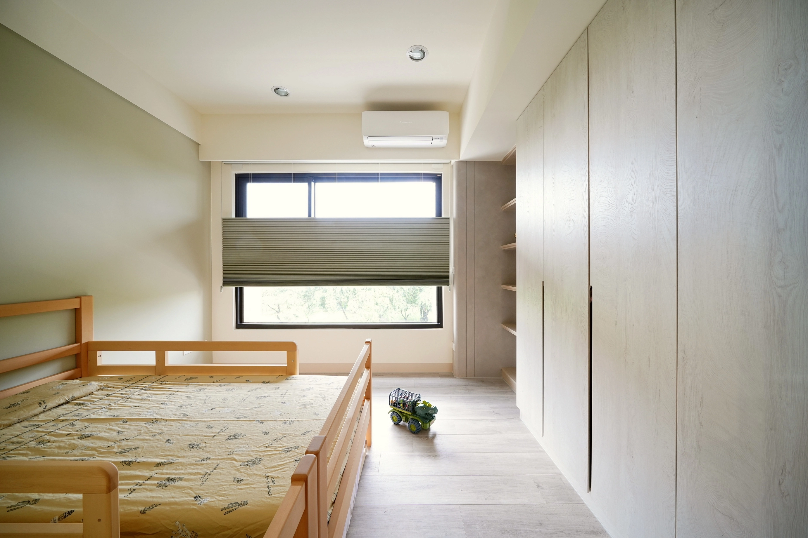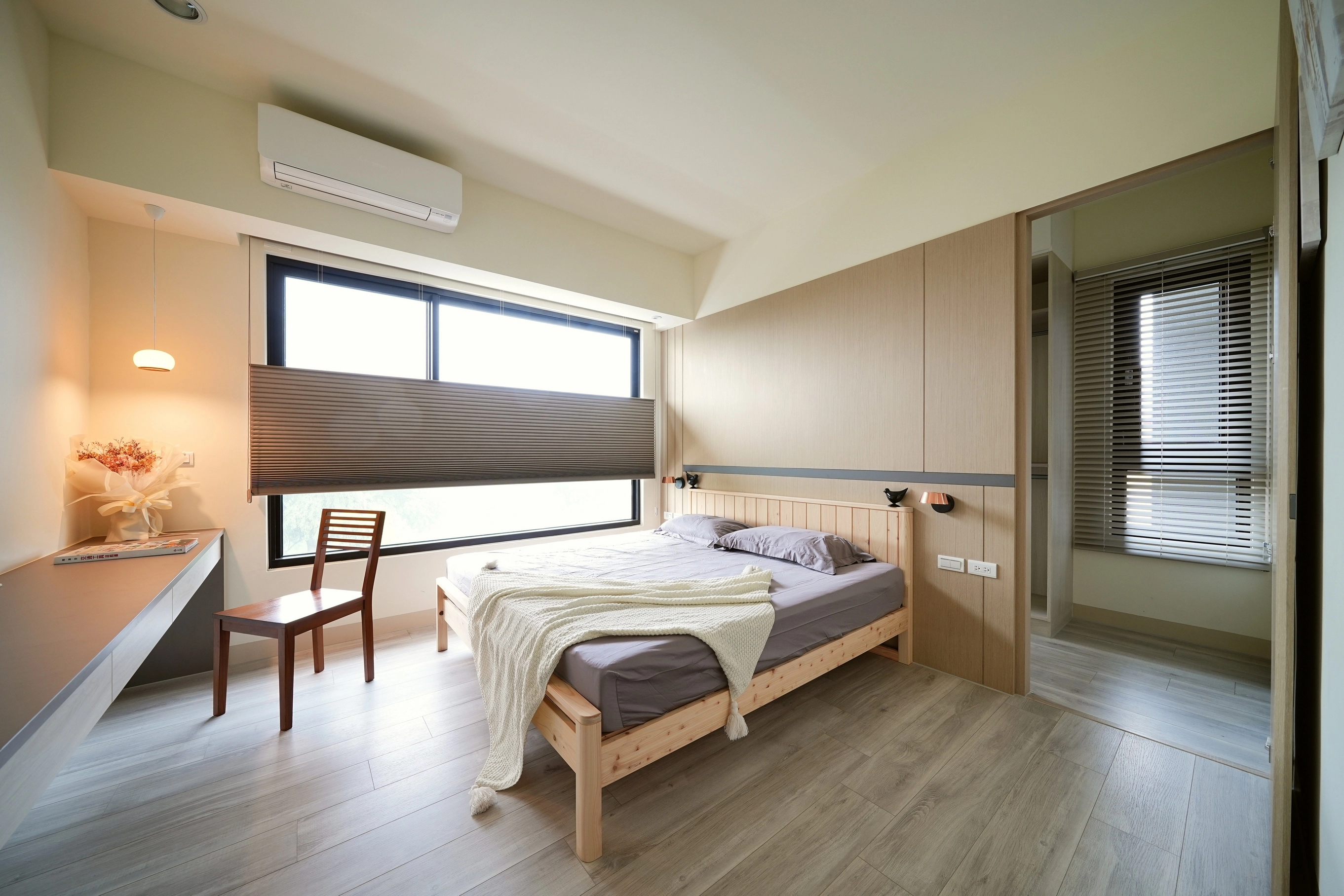 在私領域規劃上,主臥室利用木作隔間牆整合隱藏門設計,將更衣室入口完美隱藏於立面,展現精湛的台南系統櫃設計實力。全屋天花、牆面及門片細節,皆極大化保留木材的原始溫潤質感。德盈專業團隊深耕台南室內設計與系統家具領域,不論是北歐風規劃或九份子區域建案,皆能為您量身打造獨具品味的質感居家。