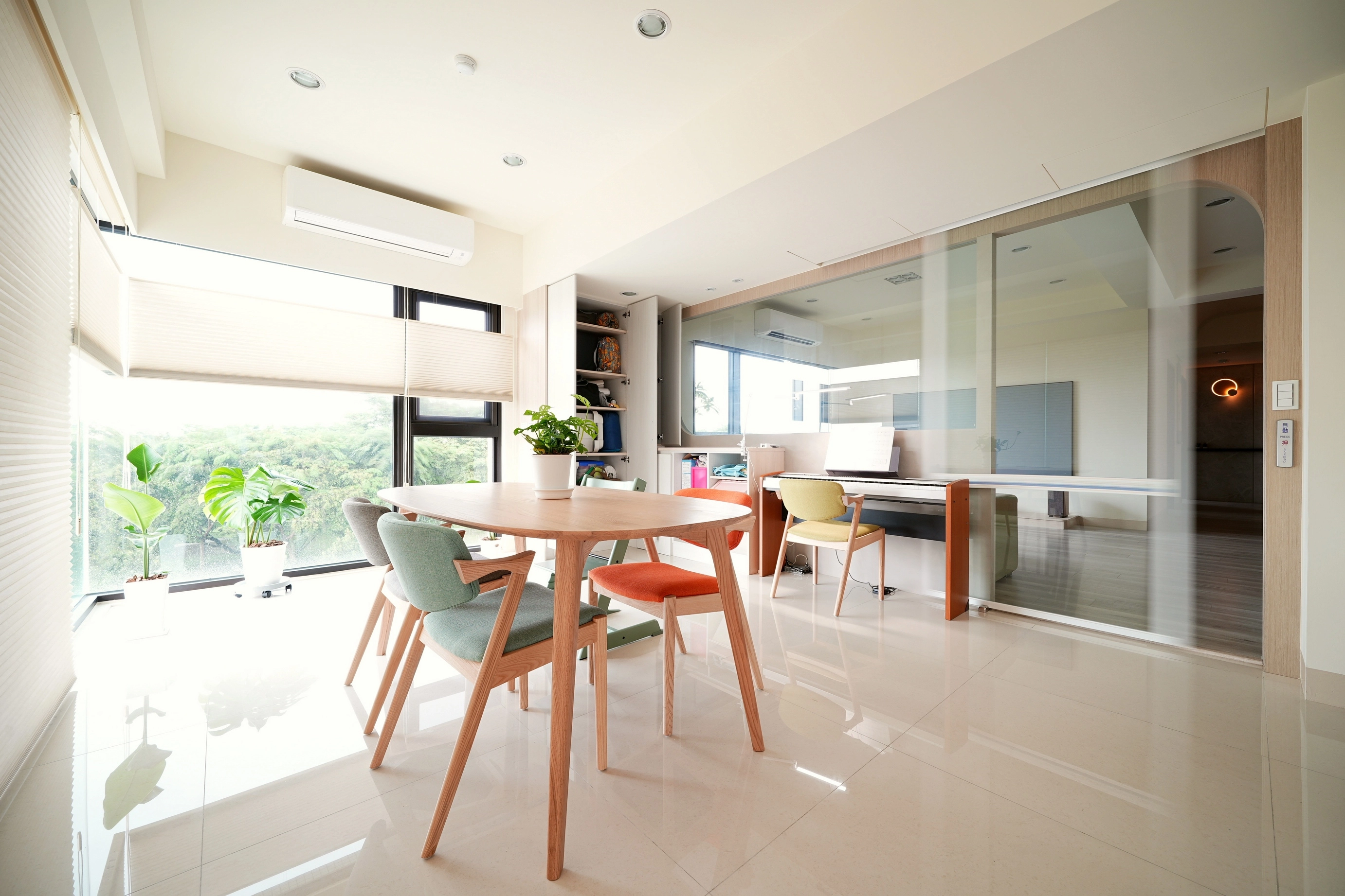 德盈台南室內設計團隊,致力於將美學與機能完美融合。本案巧妙運用木作弧形隔間牆,搭配強化玻璃與冰柱玻璃造型隔屏,不僅順應動線流暢度,更有效柔化空間稜角。沙發後方配置木作半高牆並嵌入清玻璃,在界定場域的同時確保光線穿透;客餐廳之間則透過客製化推拉門,以內嵌強化玻璃的手法維持視覺開闊感,並兼顧阻隔油煙的實用性。