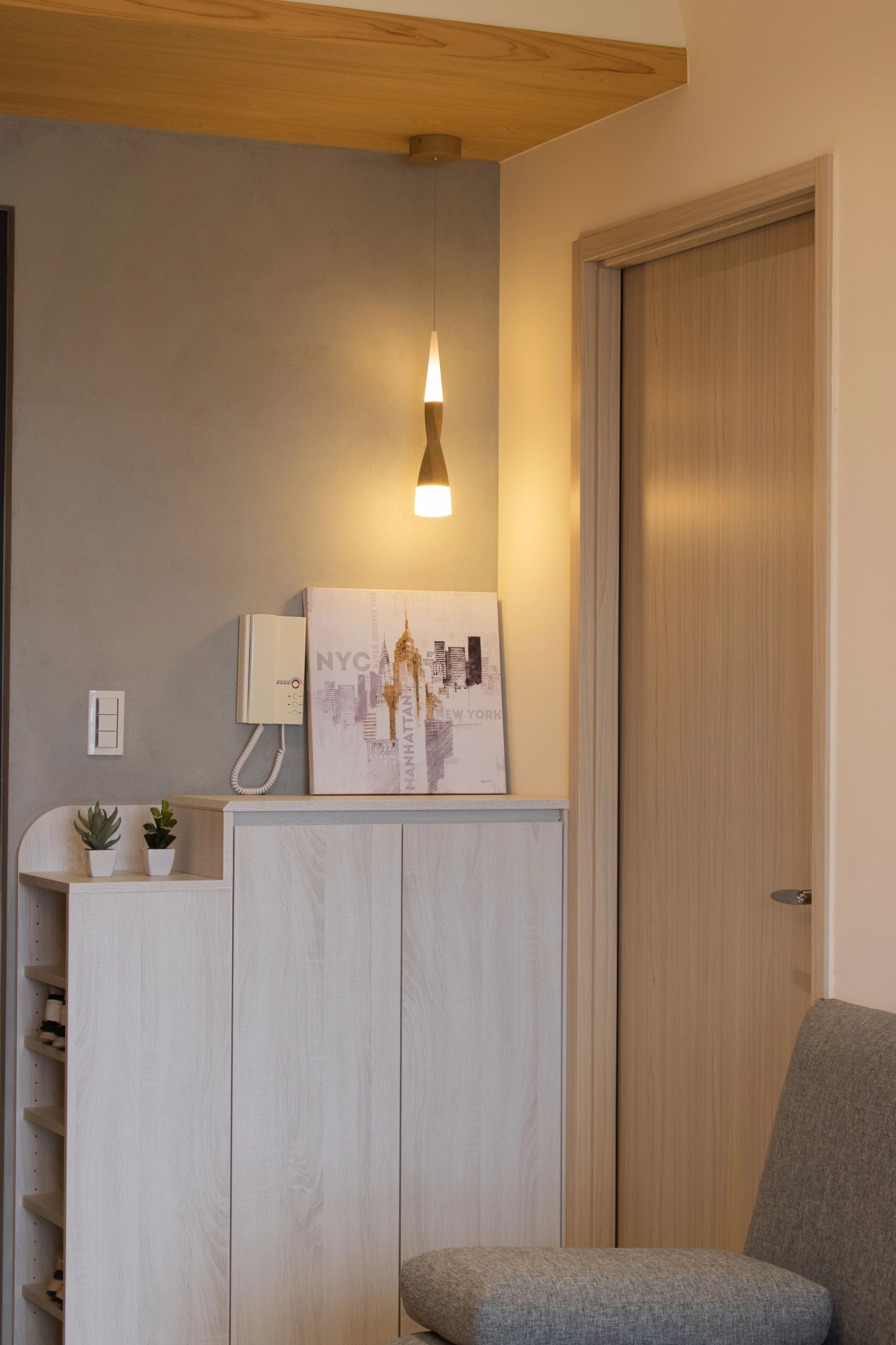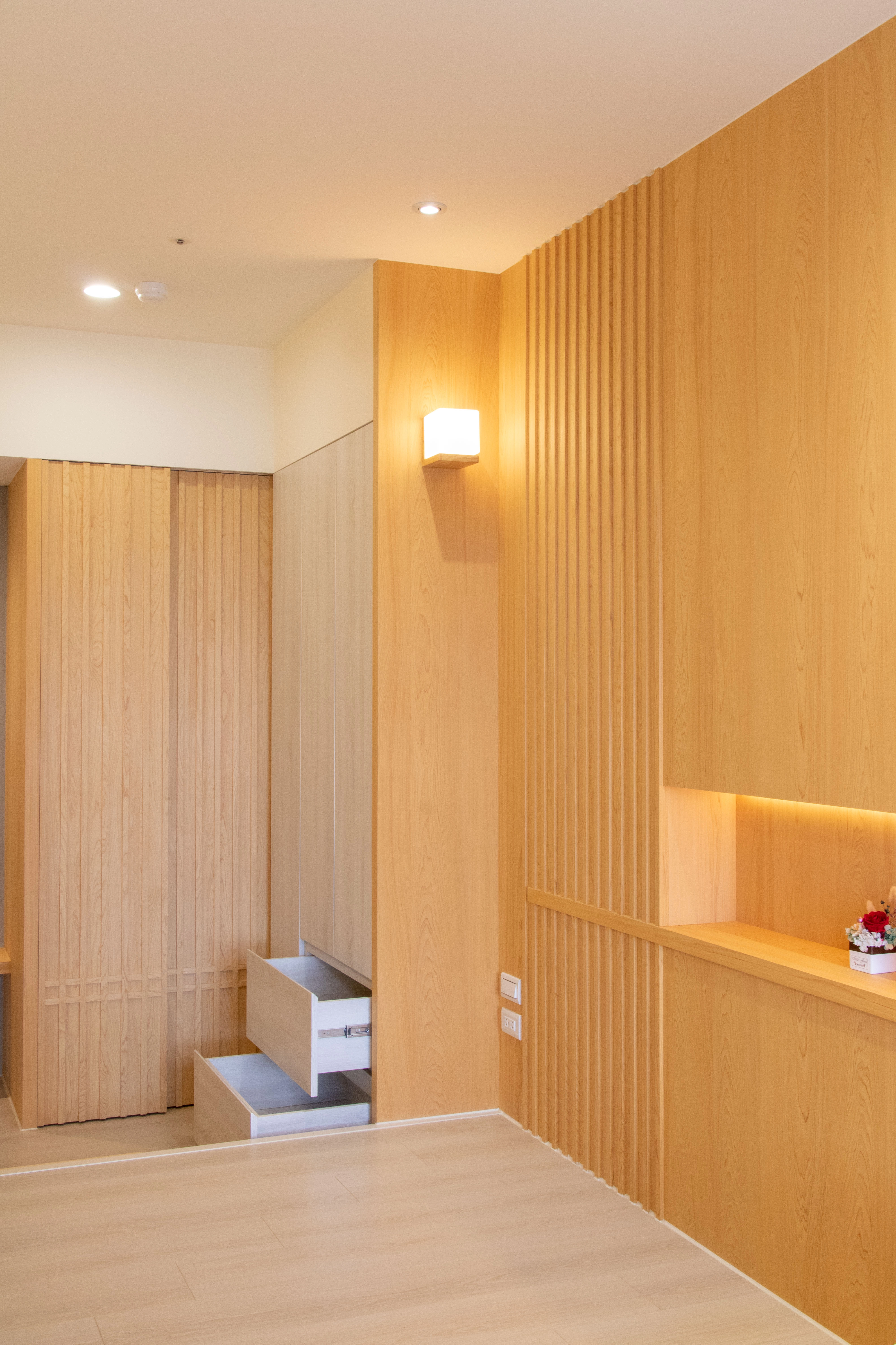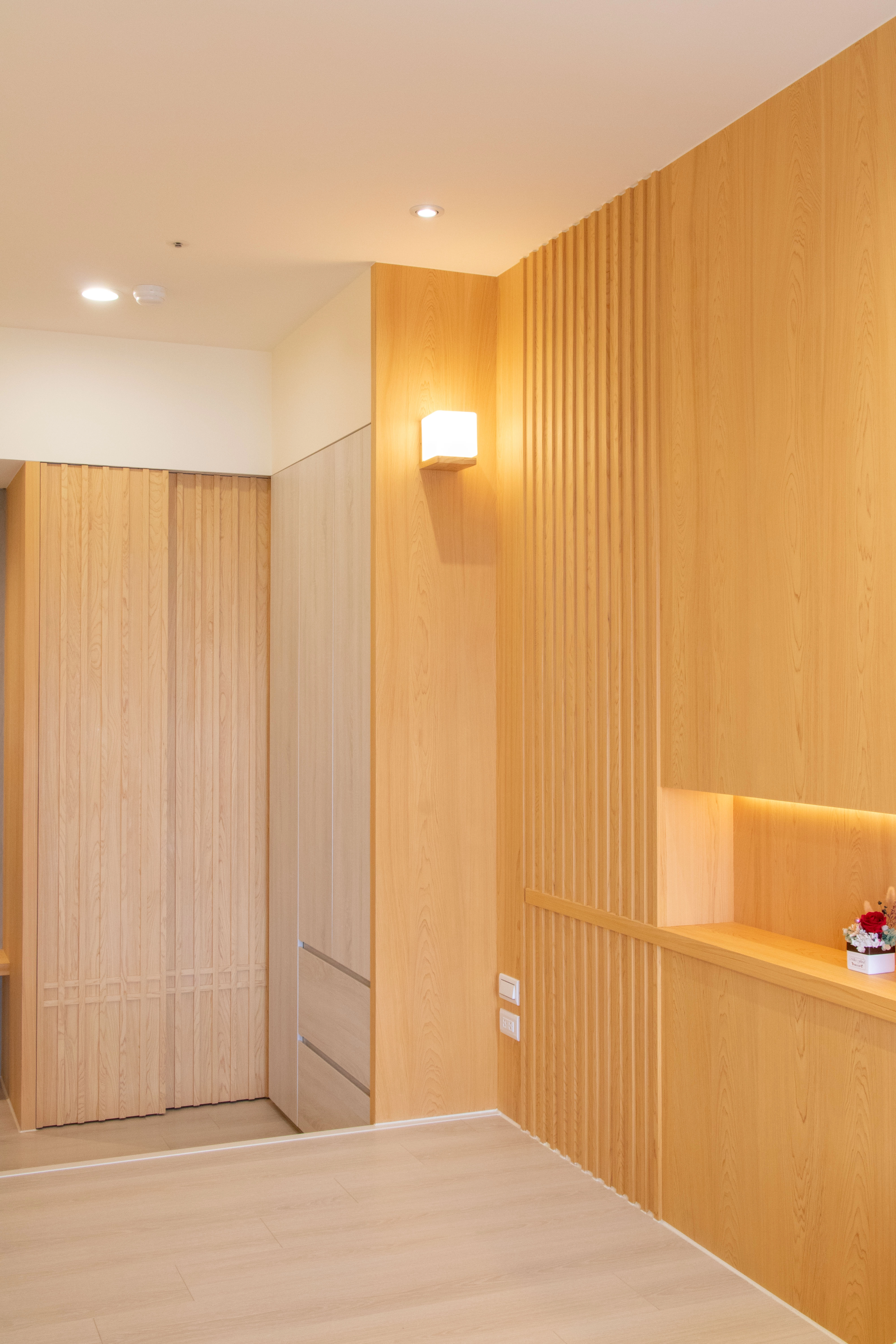 客廳區域透過「木作格柵造型門」與「格柵隱藏門」巧妙修飾空間,讓立面視覺更俐落、動線更流暢。電視牆則以造型設計創造視覺焦點,與整體氛圍一氣呵成。最特別的是,我們利用「造型障子門」在走道區隔出獨立和室,搭配架高地板與懸吊櫃,在有限坪數內創造出極大化的收納機能。