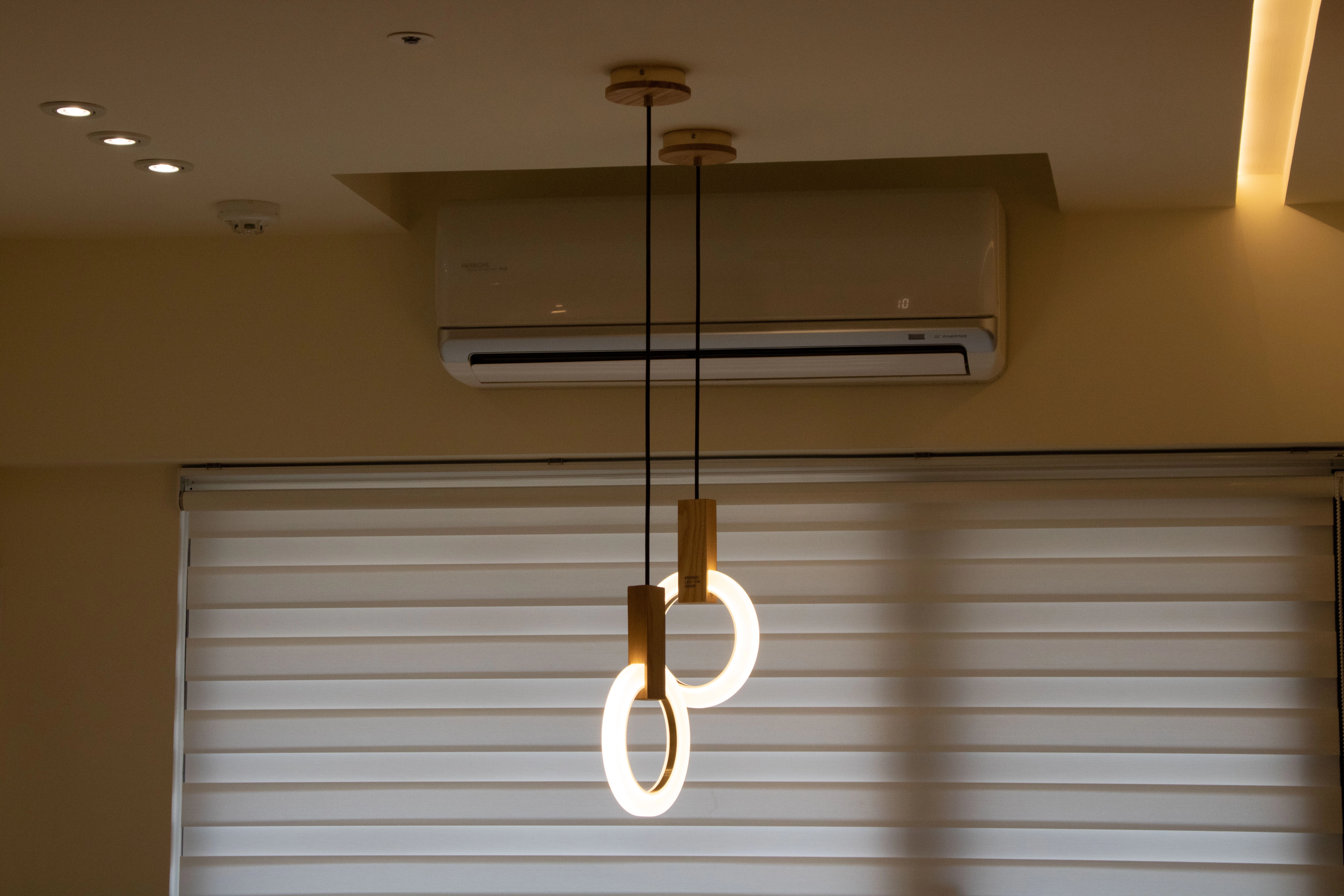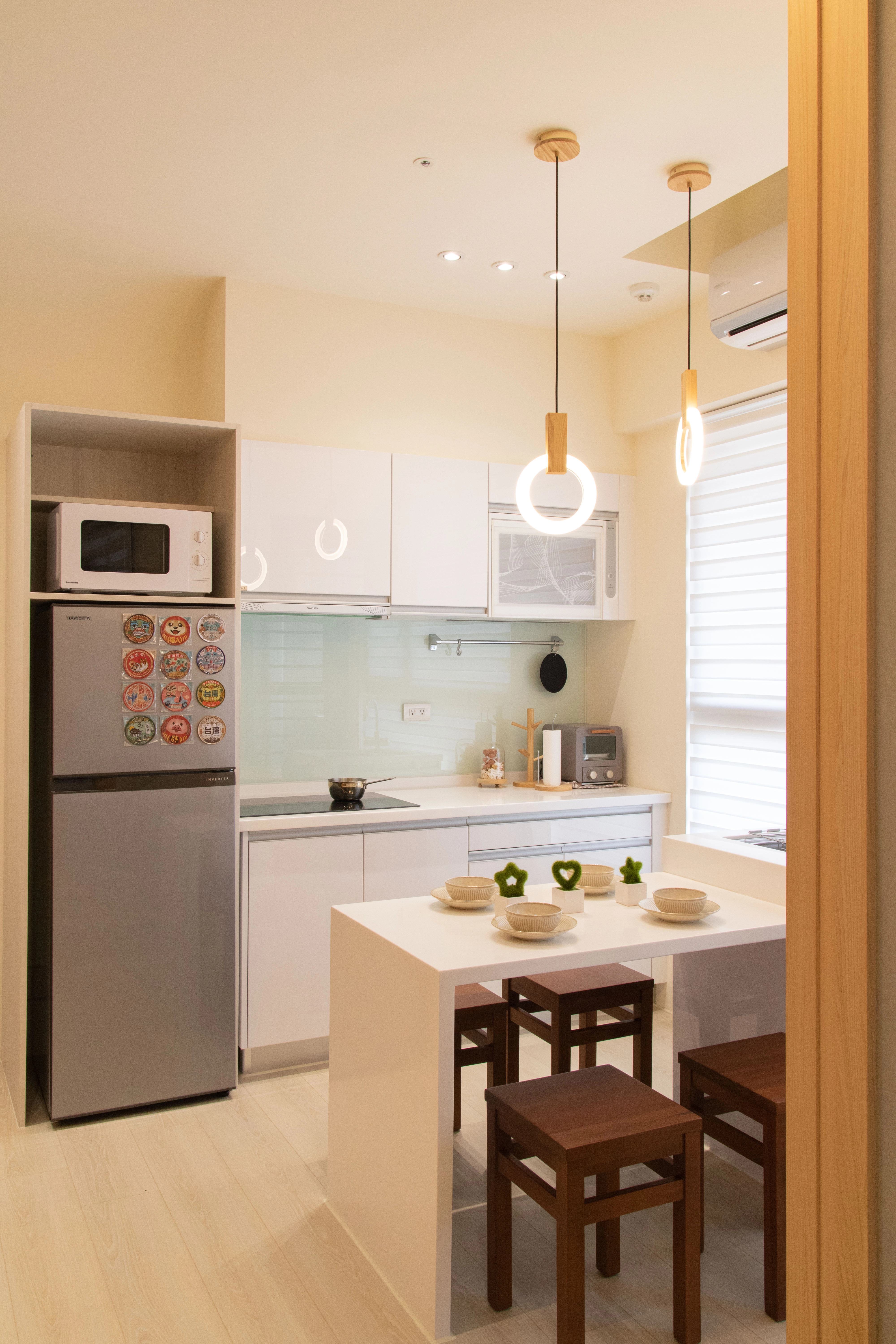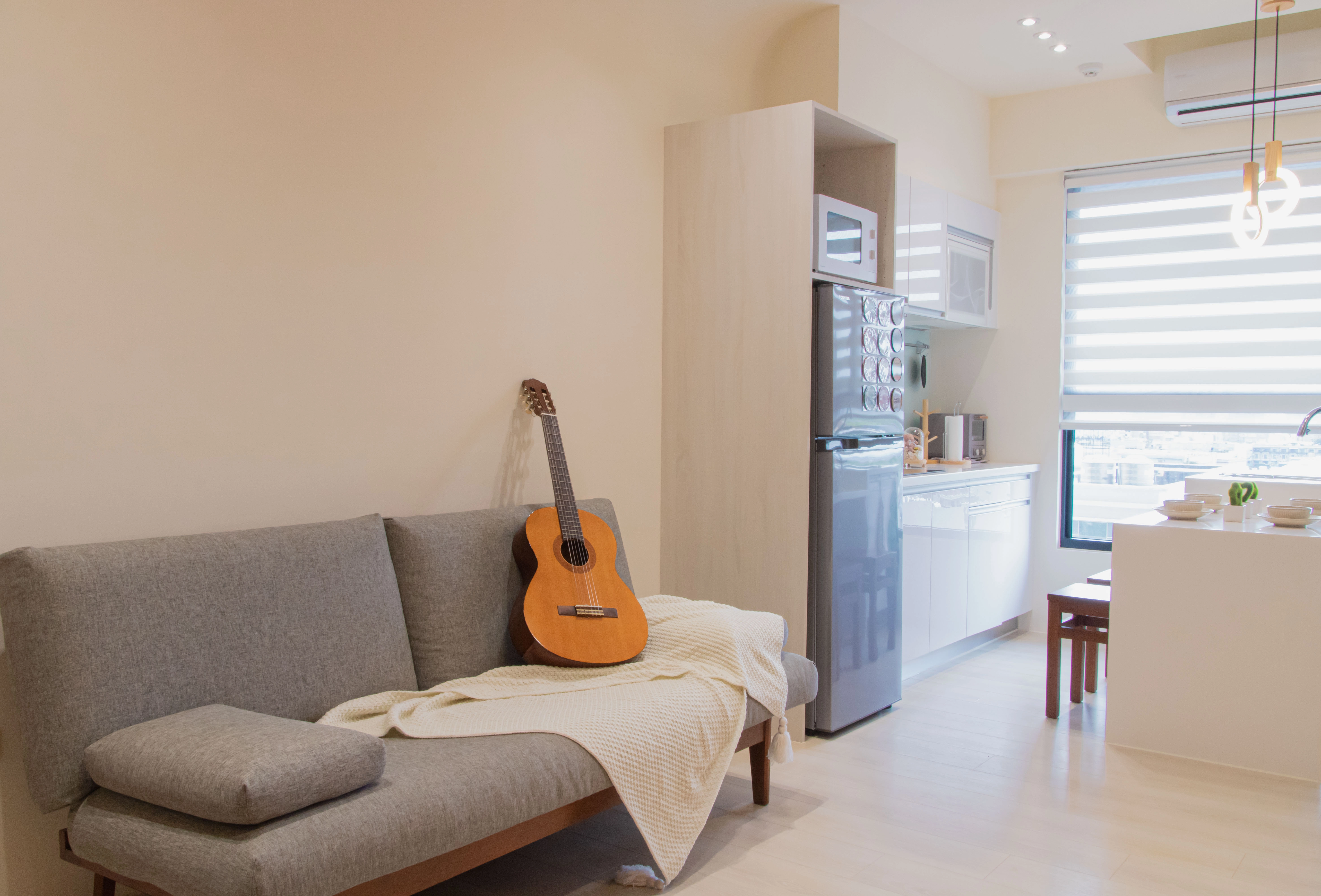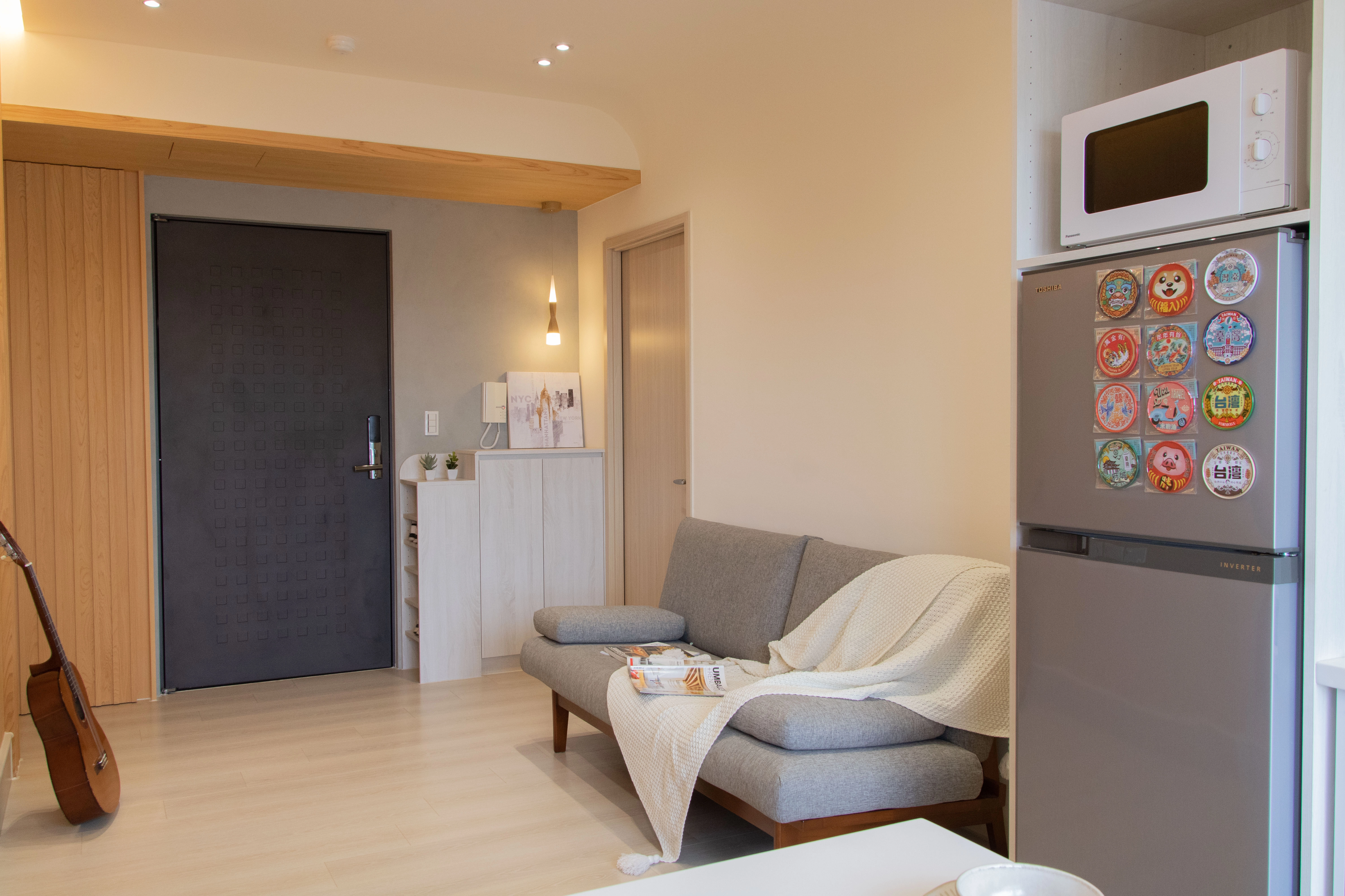 客廳區域透過「木作格柵造型門」與「格柵隱藏門」巧妙修飾空間,讓立面視覺更俐落、動線更流暢。電視牆則以造型設計創造視覺焦點,與整體氛圍一氣呵成。最特別的是,我們利用「造型障子門」在走道區隔出獨立和室,搭配架高地板與懸吊櫃,在有限坪數內創造出極大化的收納機能。