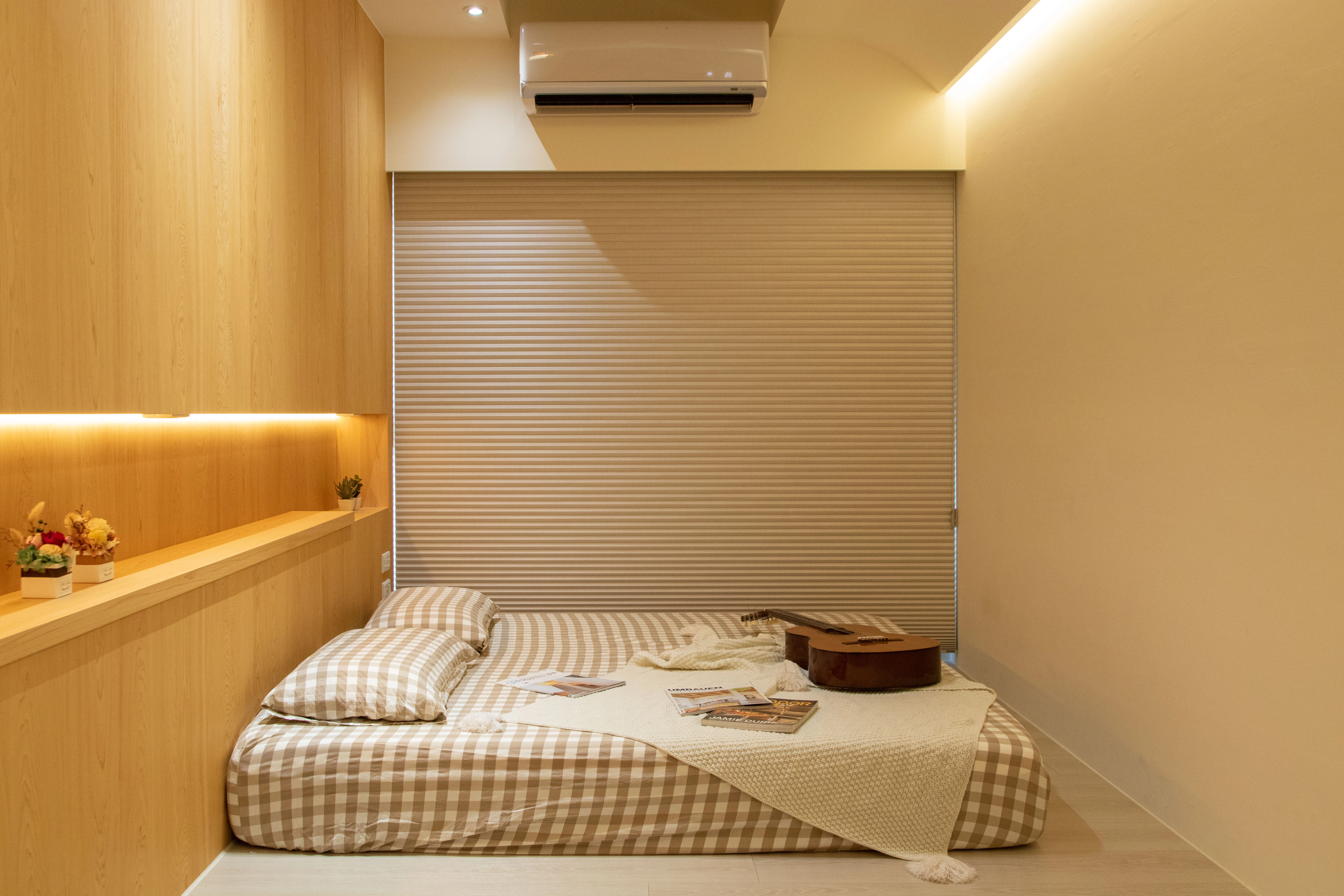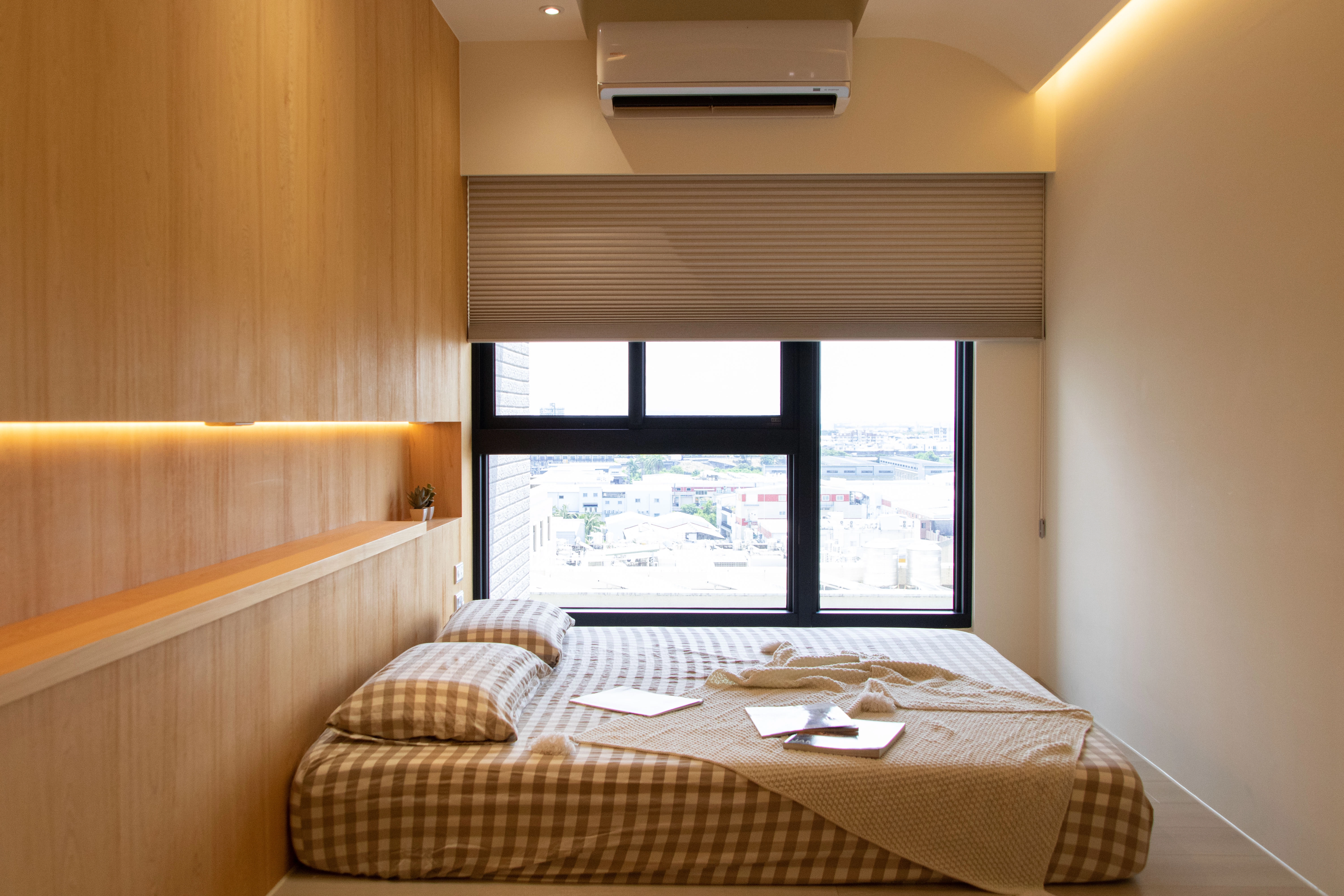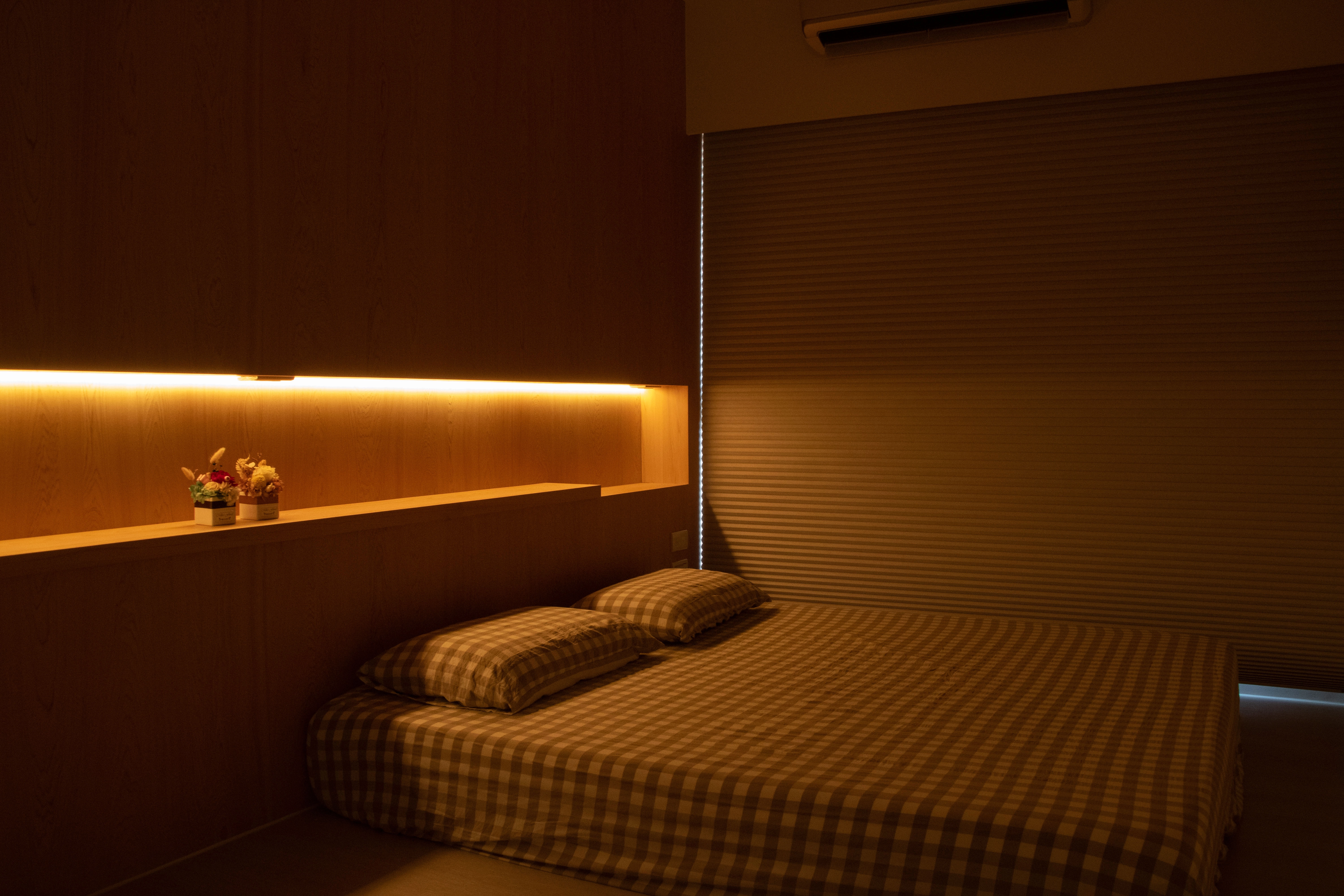 主臥室則延續格柵語彙,結合床頭牆與系統收納櫃,堆疊出豐富的空間層次。德盈深耕台南與九份子室內設計,致力於用高品質系統櫃,為您在城市中打造一個充滿自然氣息、專屬自己的舒適避風港。