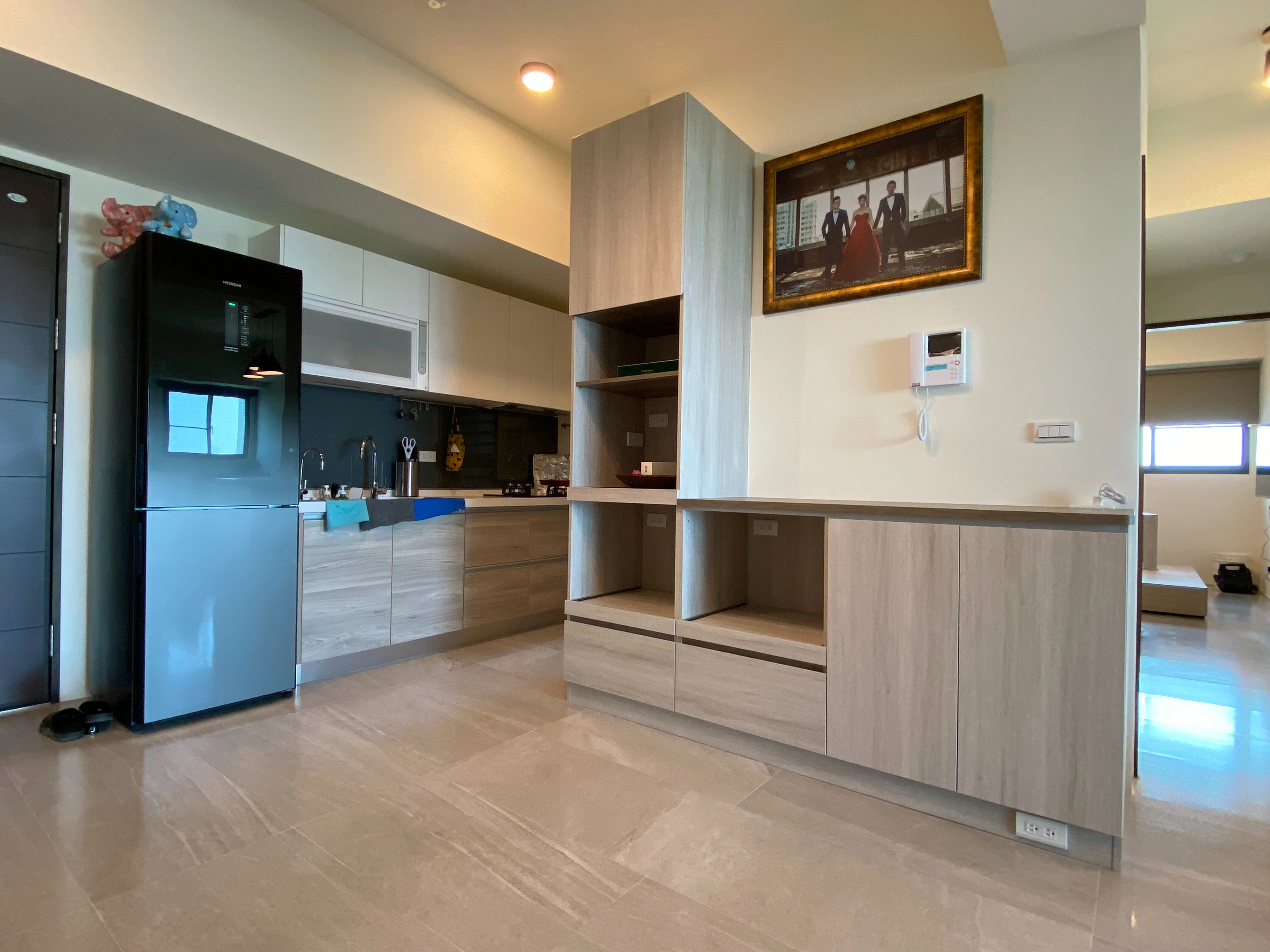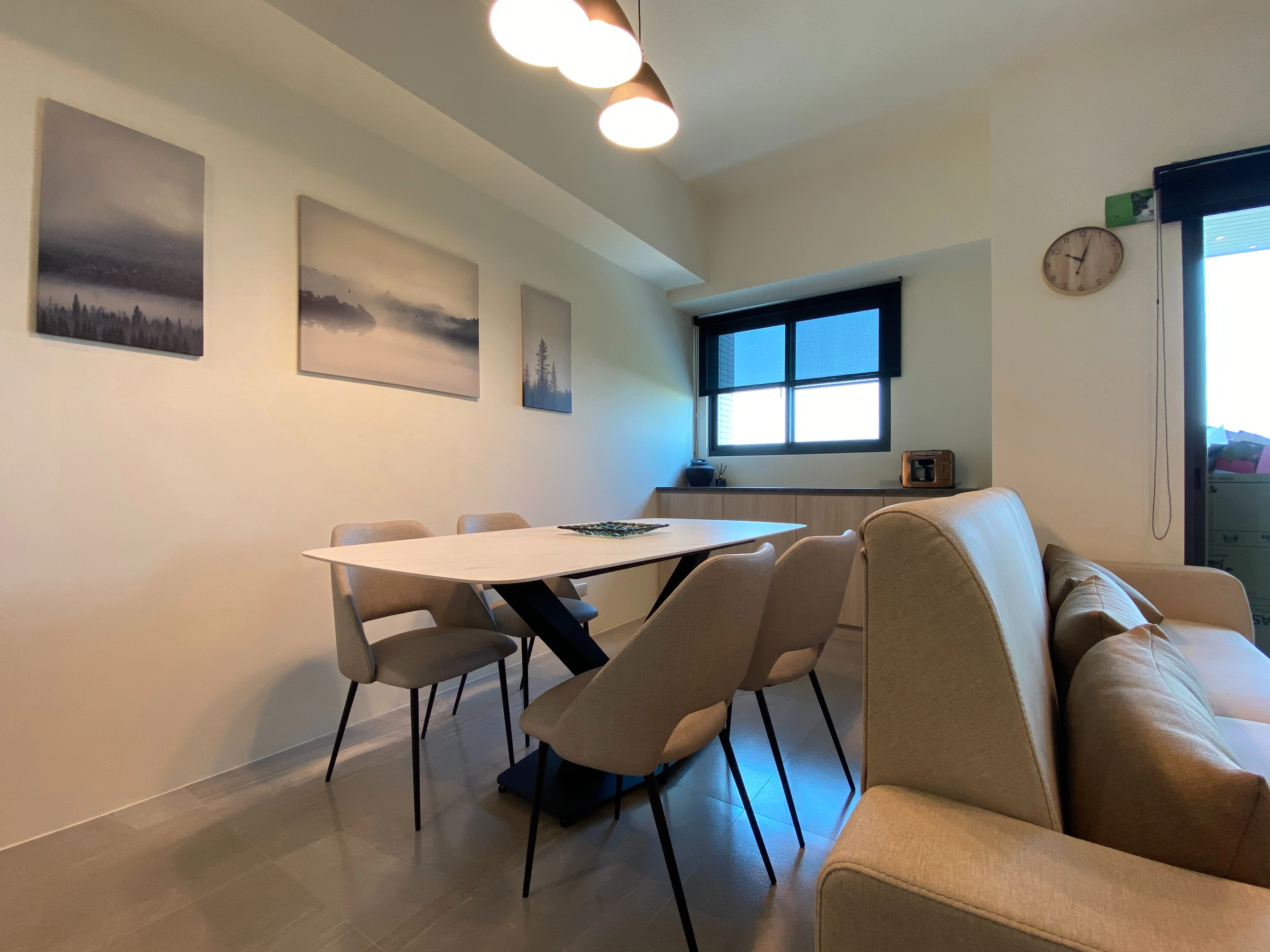 客廳規劃系統收納高櫃結合抽屜設計,讓美觀與實用並行;廚房配置高櫃搭配抽盤,大幅提升料理時的便利性。最貼心的是在餐廳窗下打造「行李箱專用收納櫃」,精準解決大型物件的收納難題。