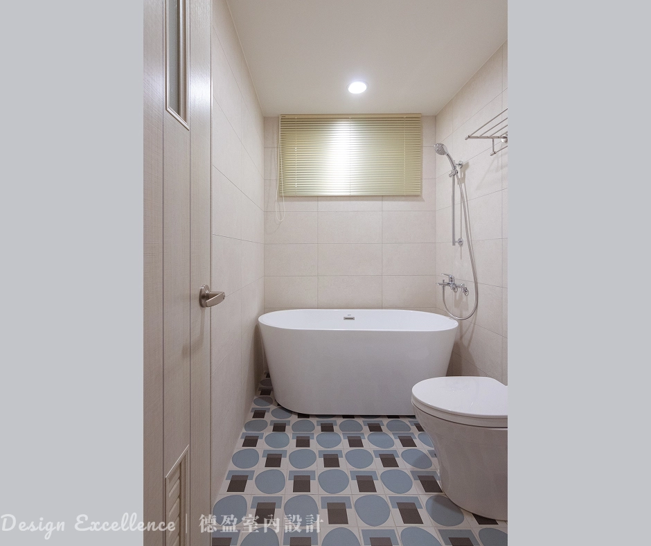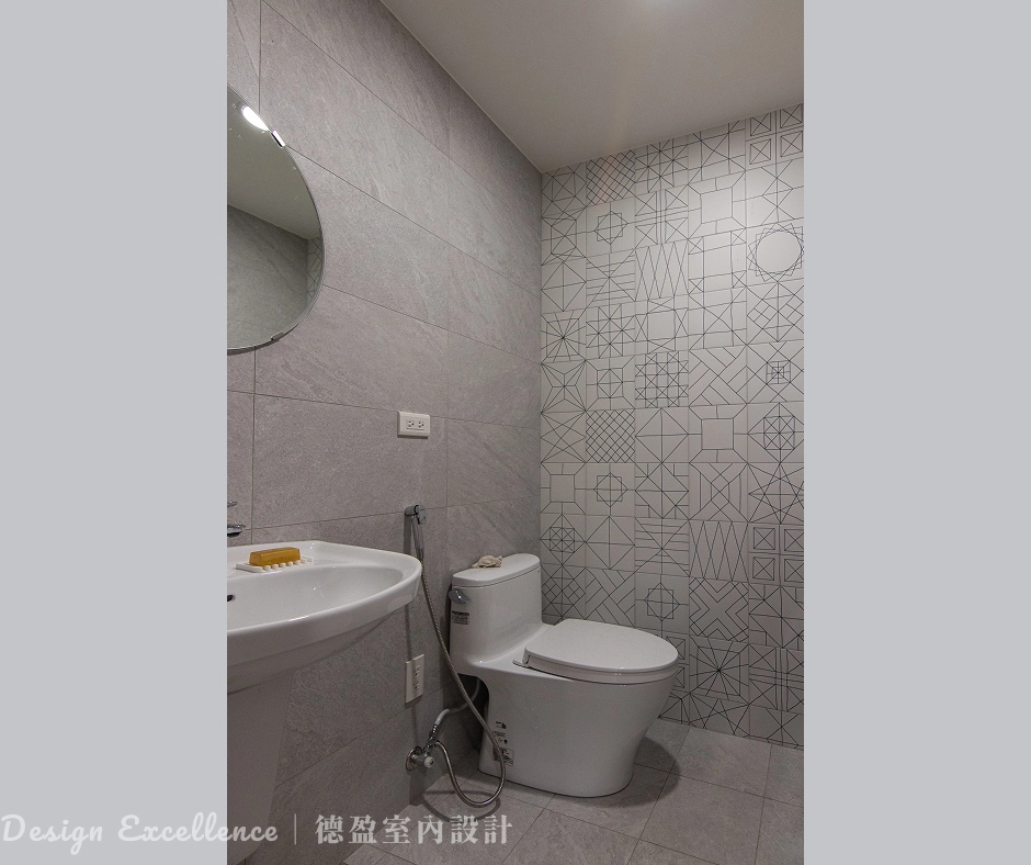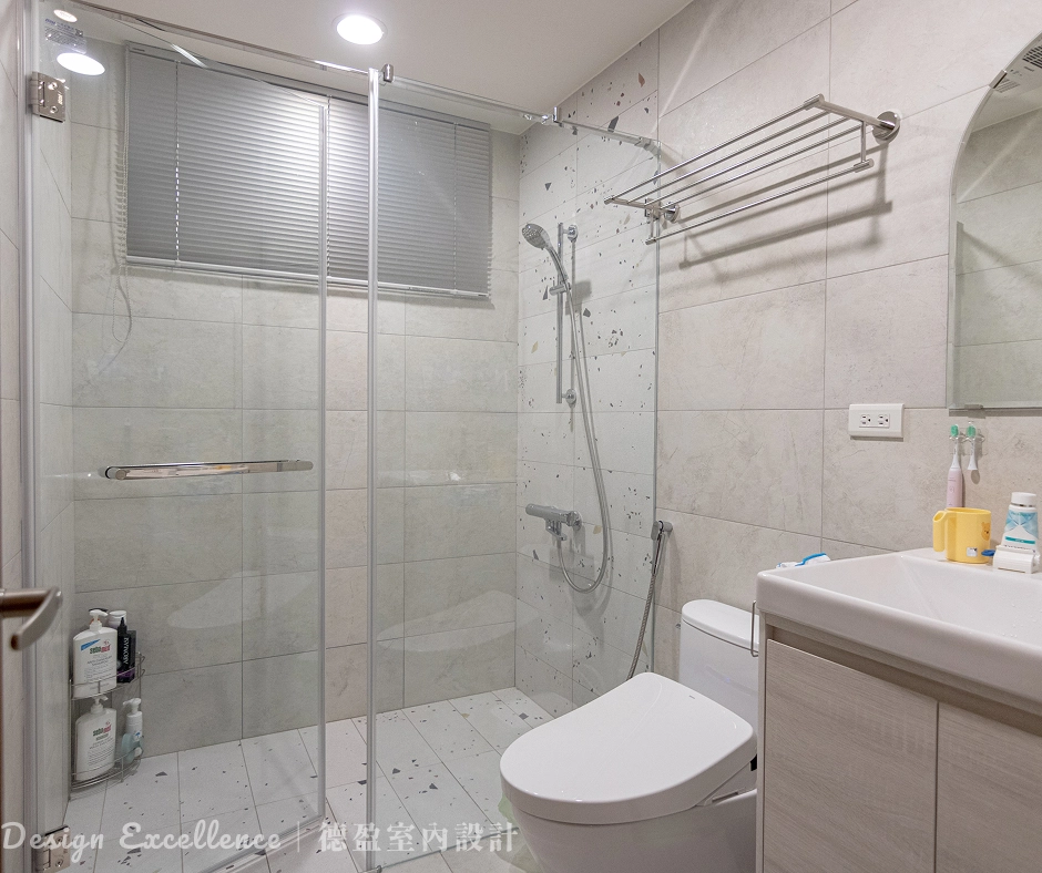 防水做得好,住起來才不會有煩惱。 德盈在衛浴翻修上極為要求,除了最基本的水電以外,我們也重新施作了地板與壁面的 PU 防水工程。細節上,特別加裝了灰色系大理石門檻,徹底杜絕滲水風險。門片選擇也依樓層需求調整,選用柚木色與白梣色門組。搭配現代感十足的淺色系磁磚與全新衛浴設備,讓原本悶濕的廁所變成清爽的洗漱空間。